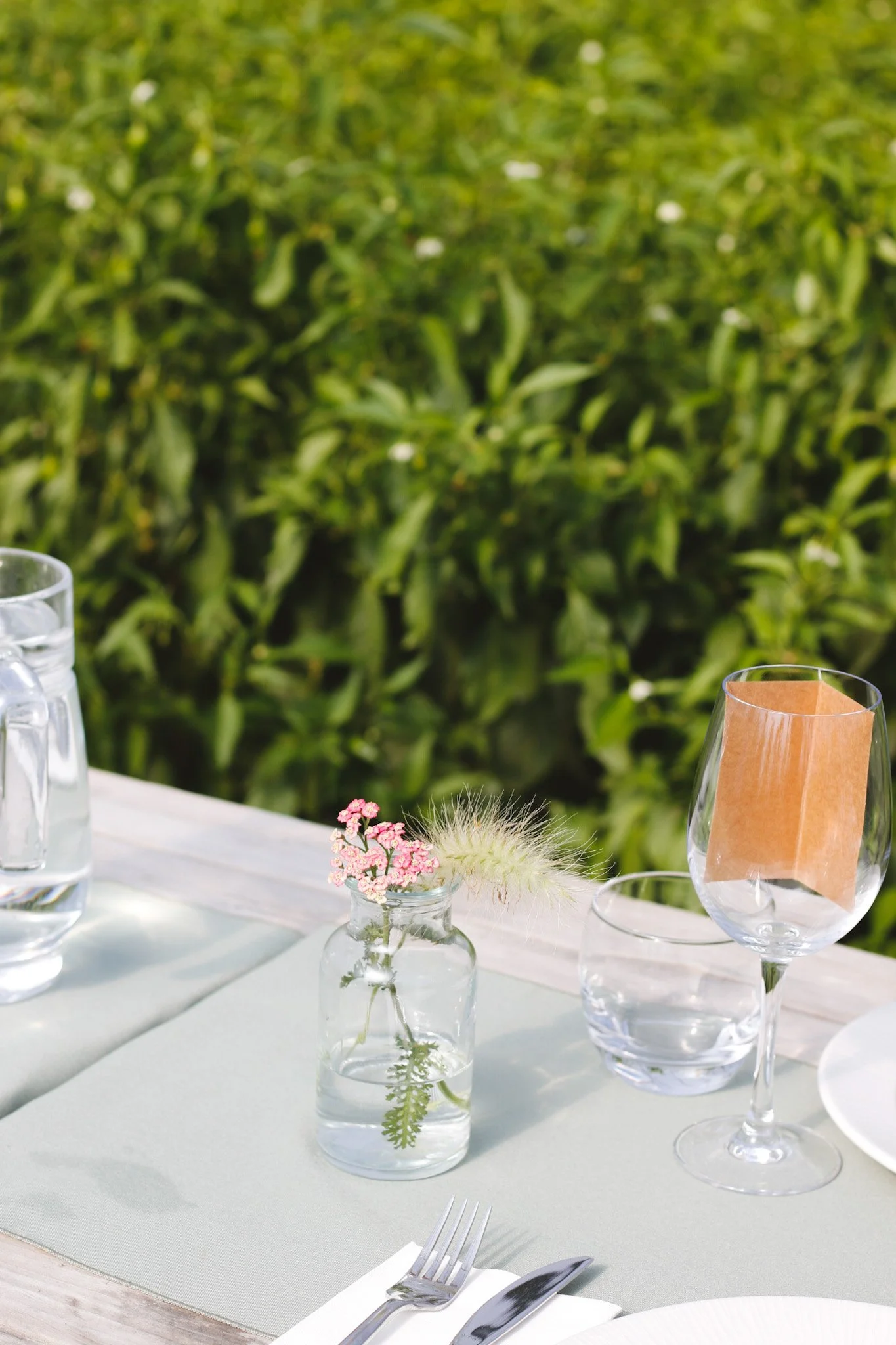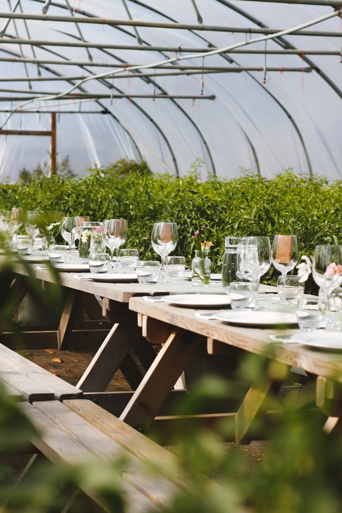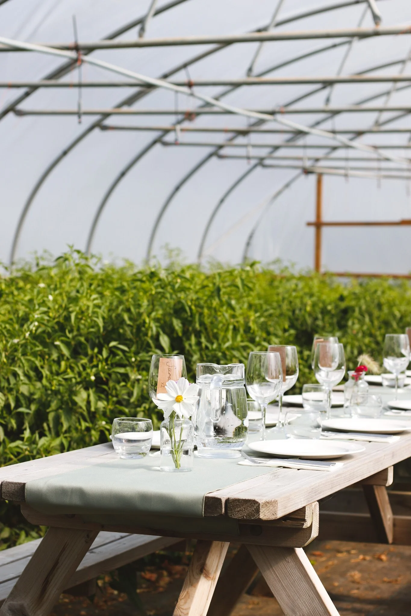 A long outdoor table set with wine glasses, water glasses, plates, and small flower vases in a greenhouse or garden setting.