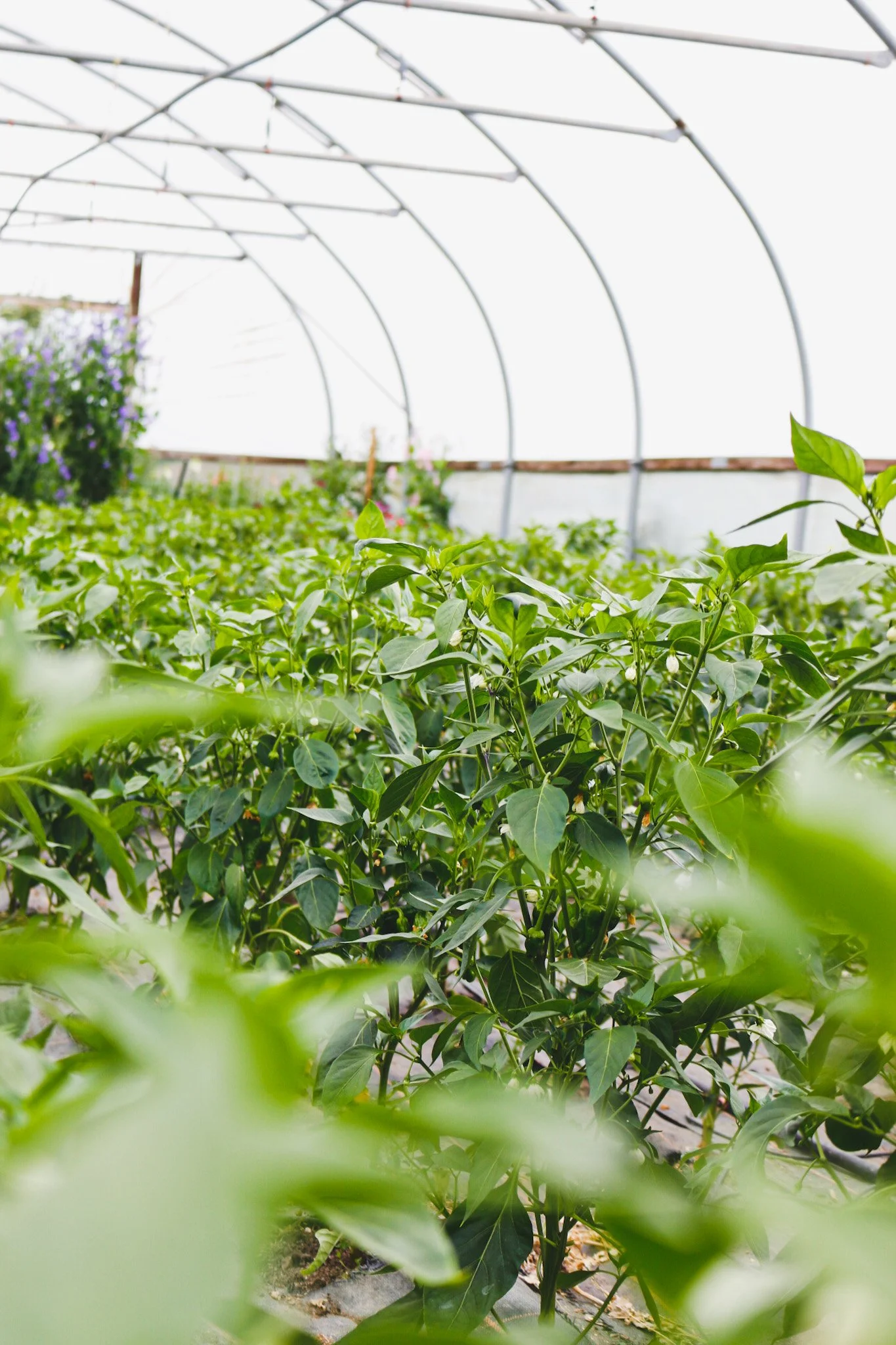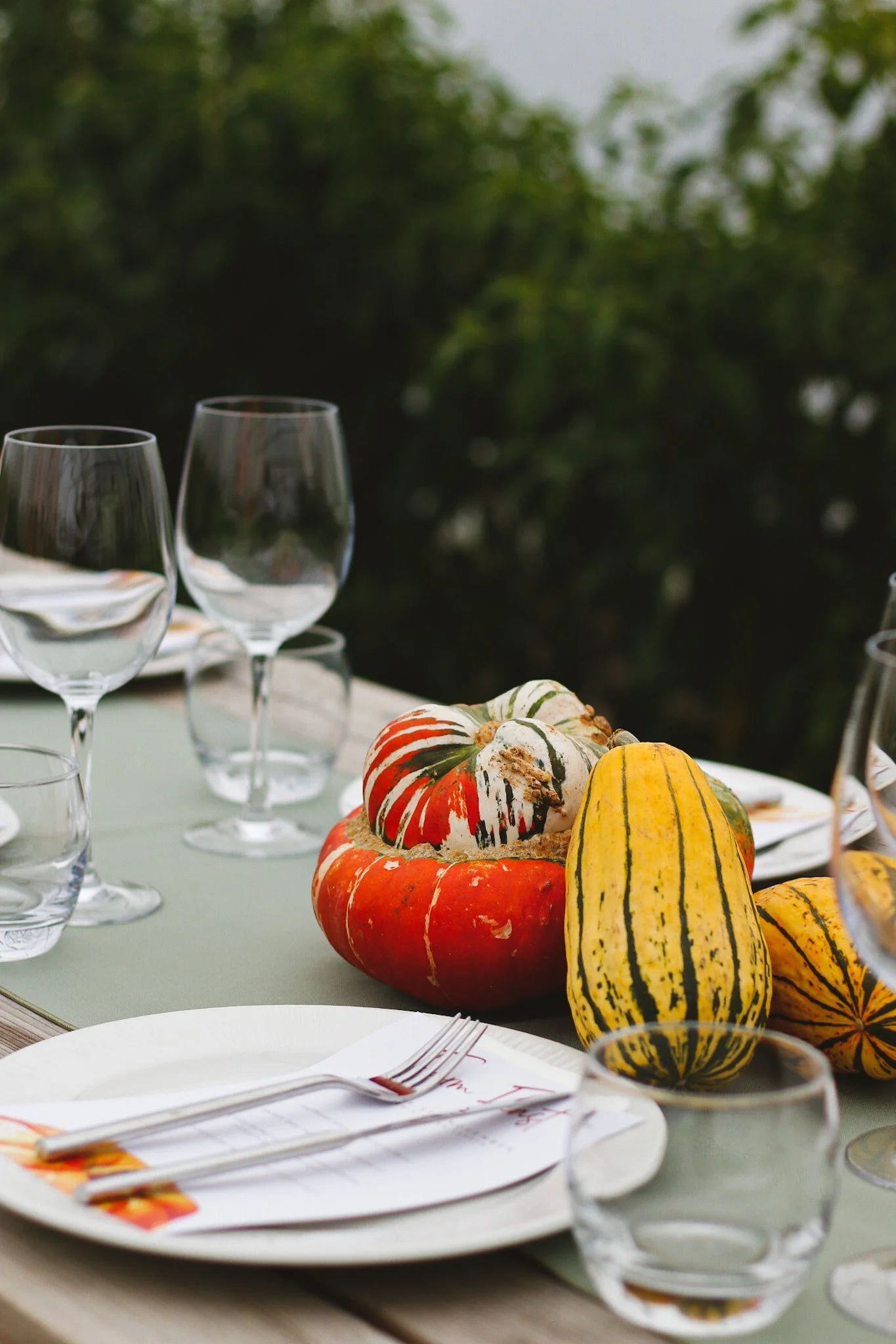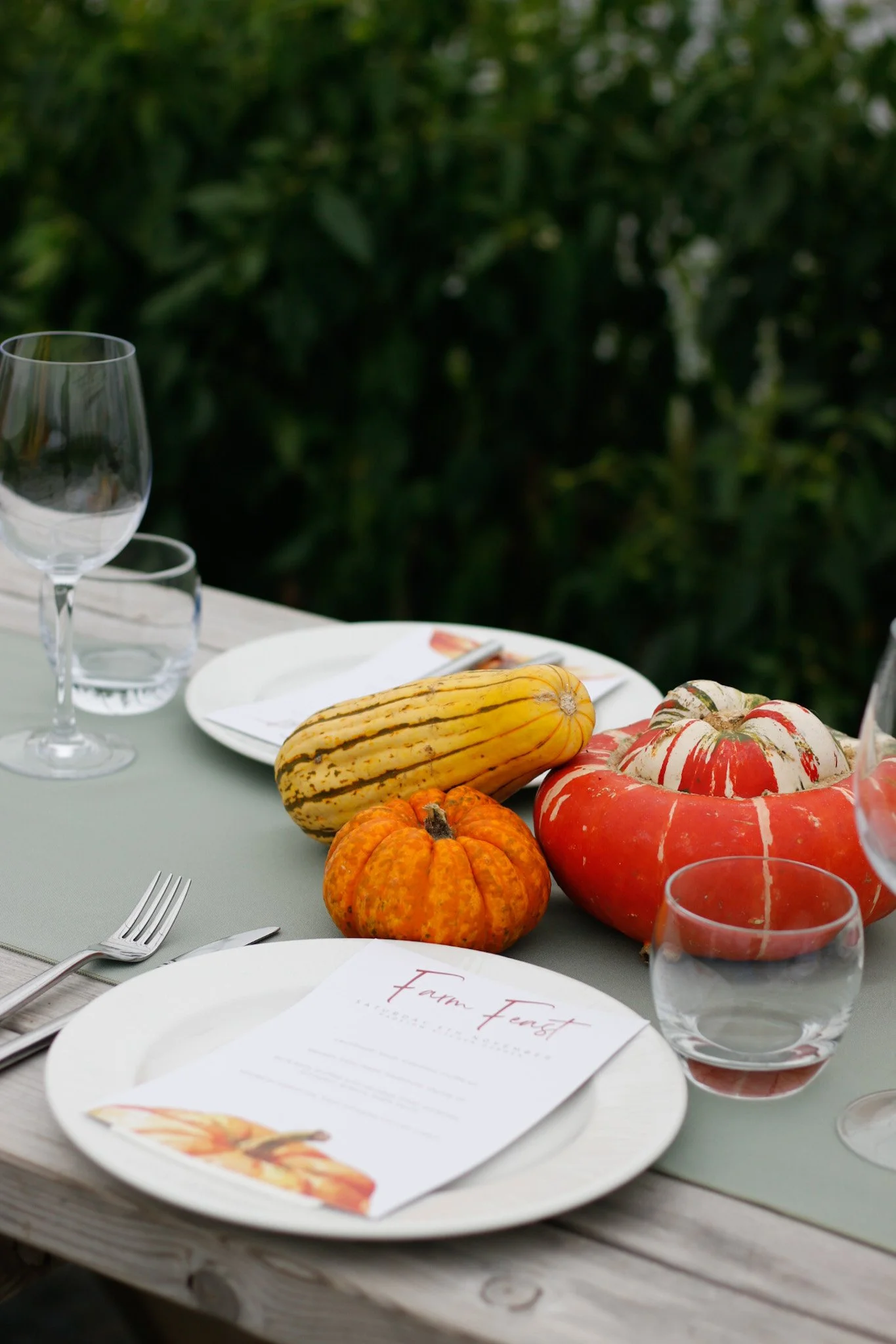 A long outdoor table set with wine glasses, water glasses, plates, and small flower vases in a greenhouse or garden setting.