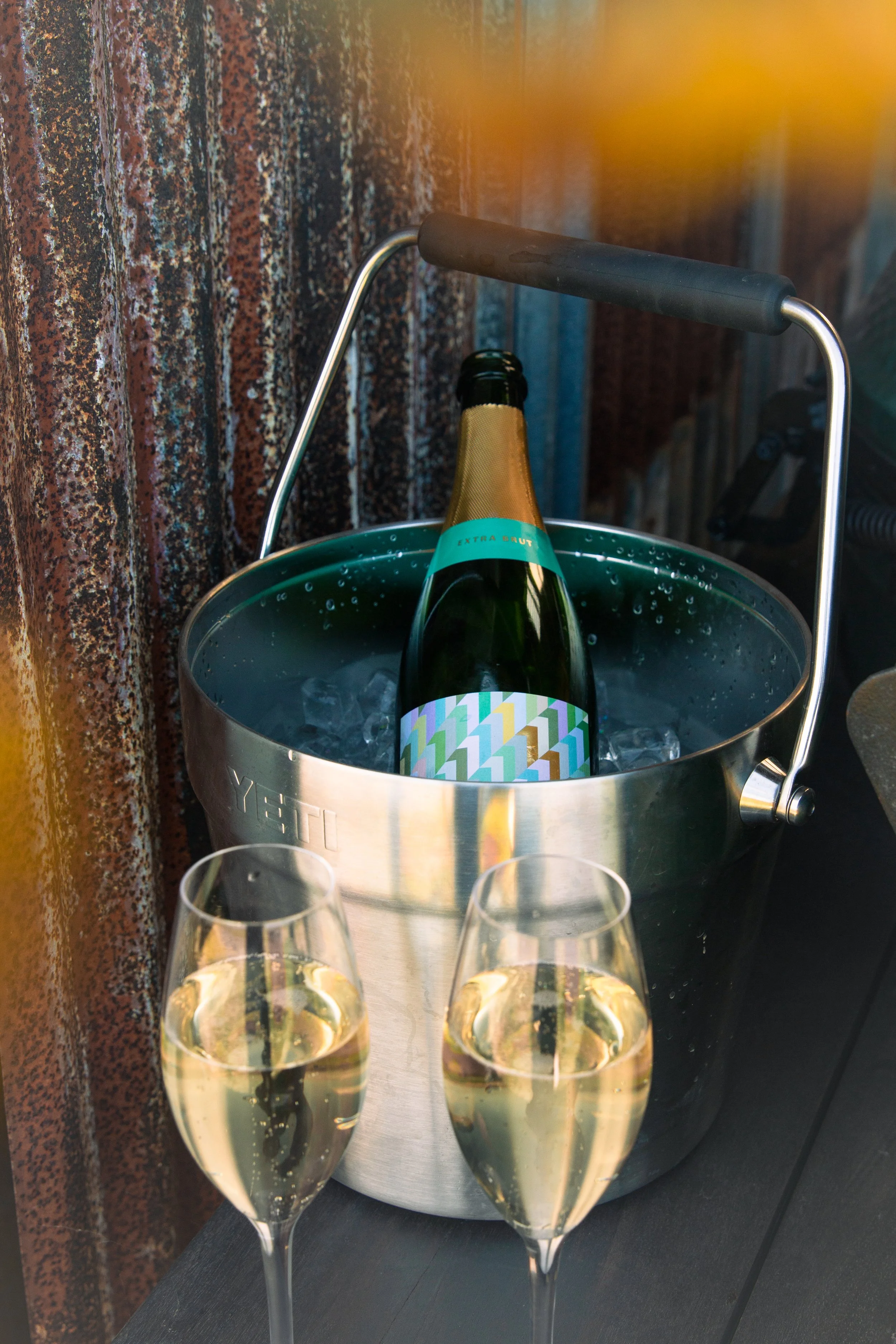 A bottle of champagne in an ice bucket with two glasses of champagne in front, placed on a dark surface with a rusty metal wall in the background.