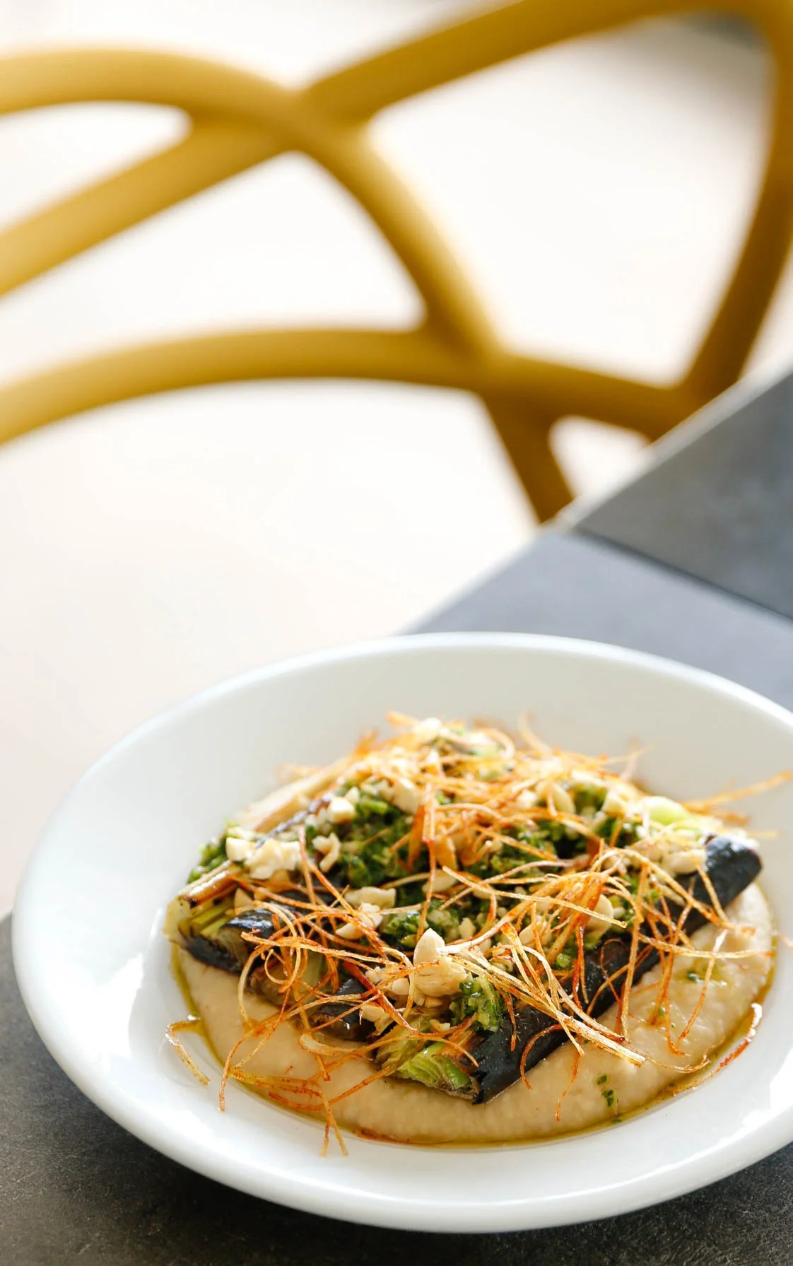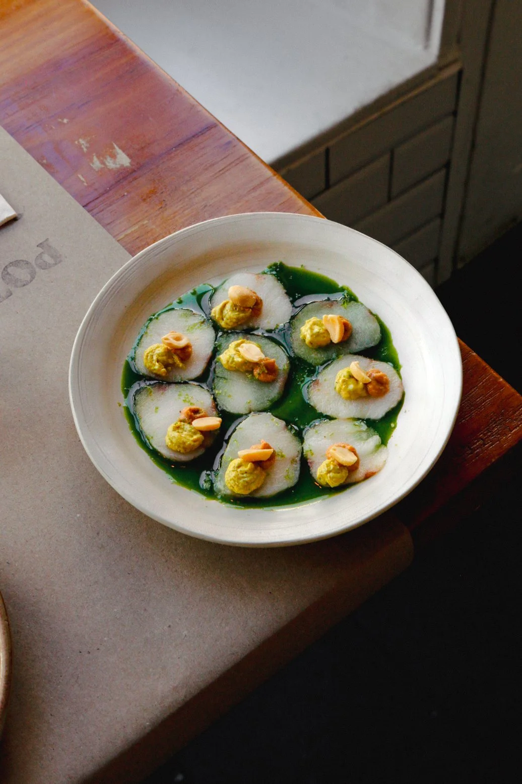 A bowl of sliced cucumbers topped with yellow dollops of wasabi, garnished with sliced almonds, and drizzled with green sauce, at prawn on the lawn in padstow.