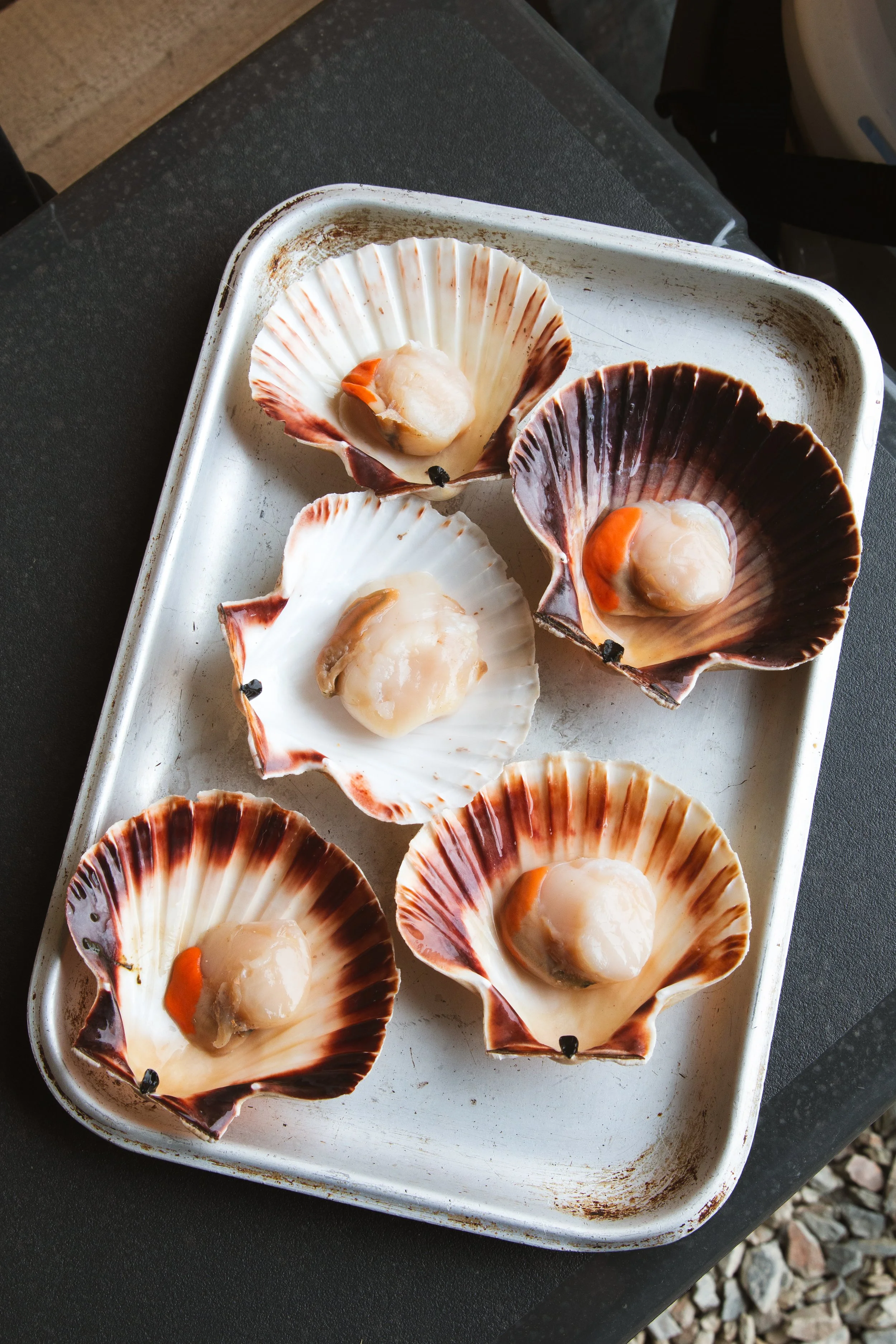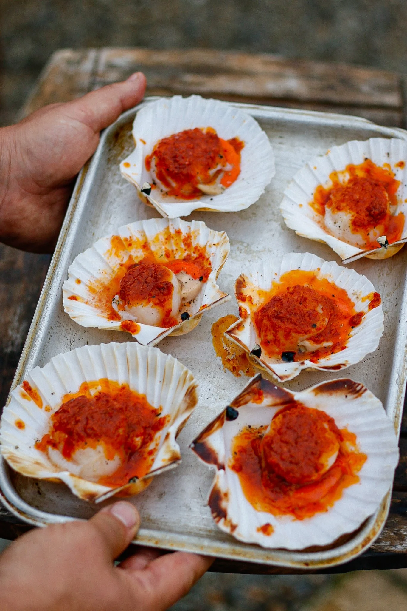 Five scallop shells on a baking tray, each holding a raw scallop with orange roe.
