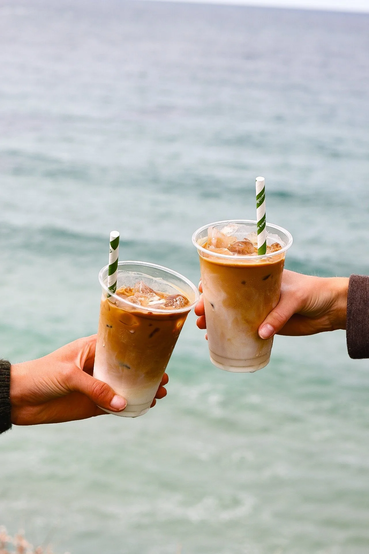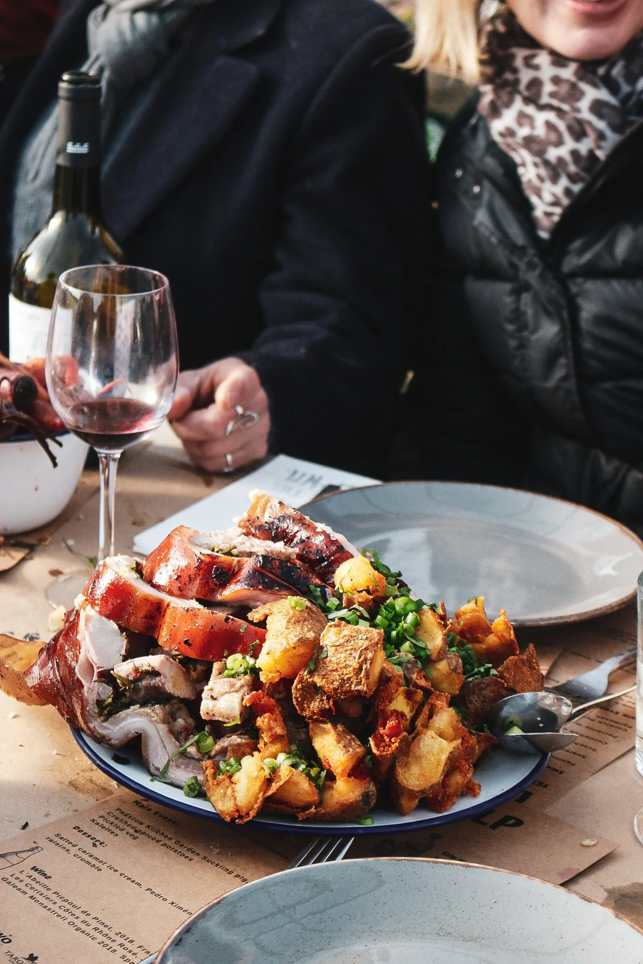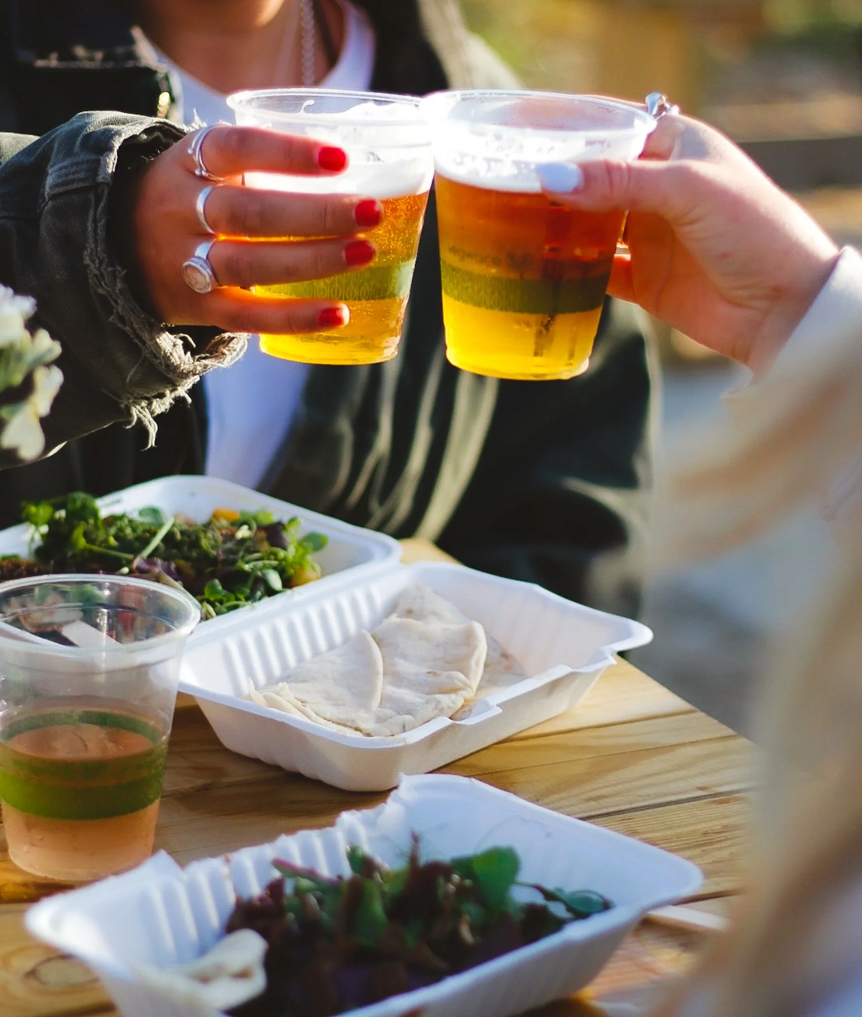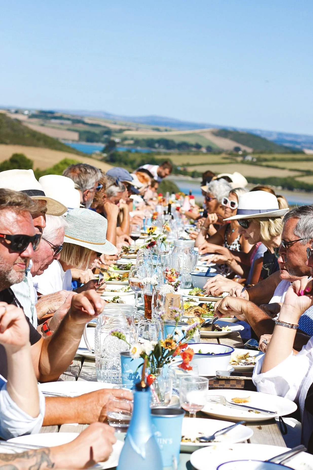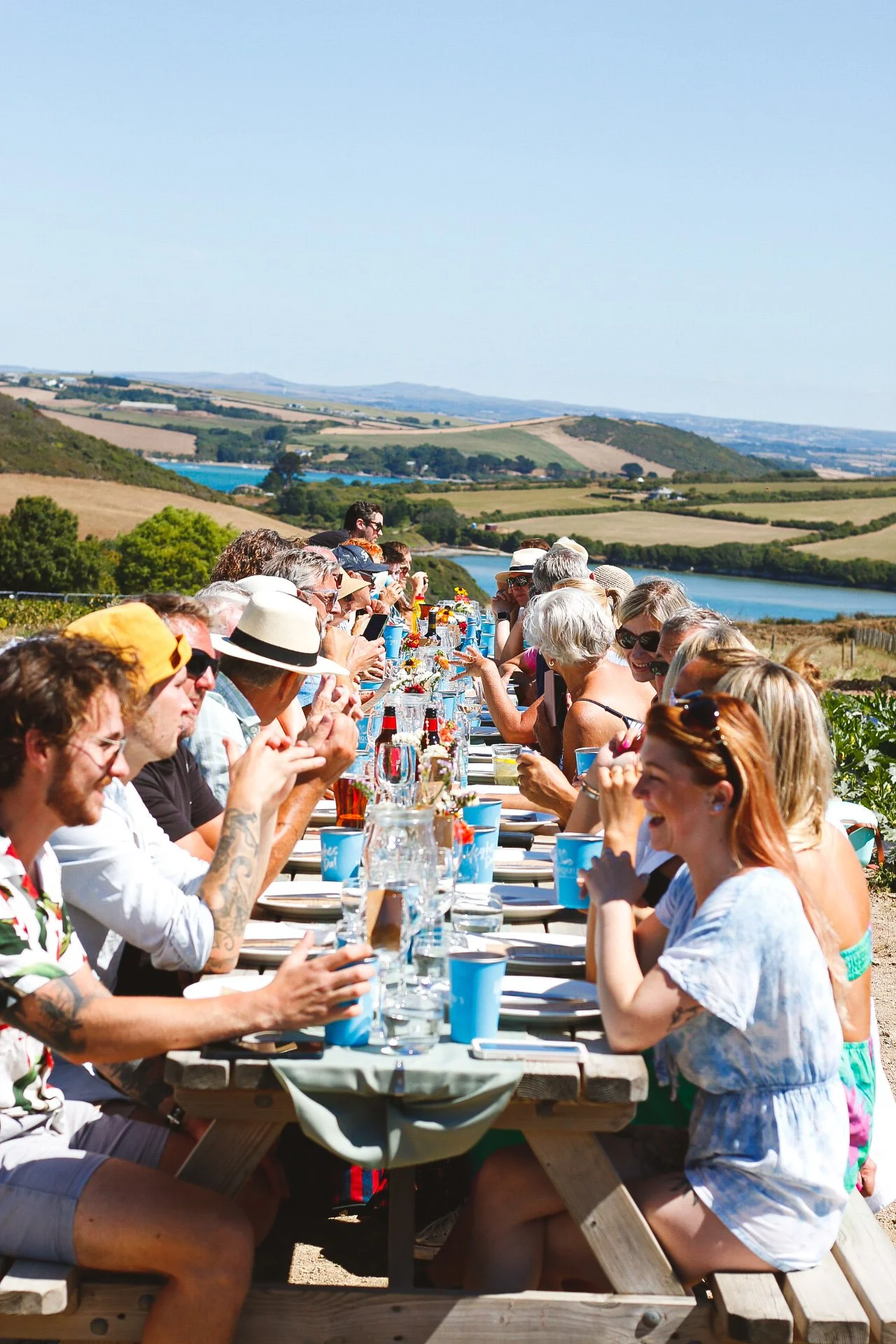 People sitting at an outdoor long dining table on a sunny day, with scenic hills, water, and blue sky in the background.