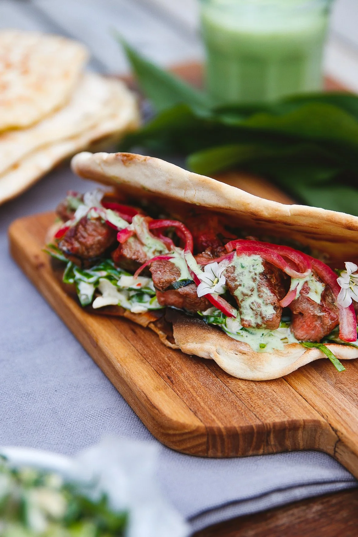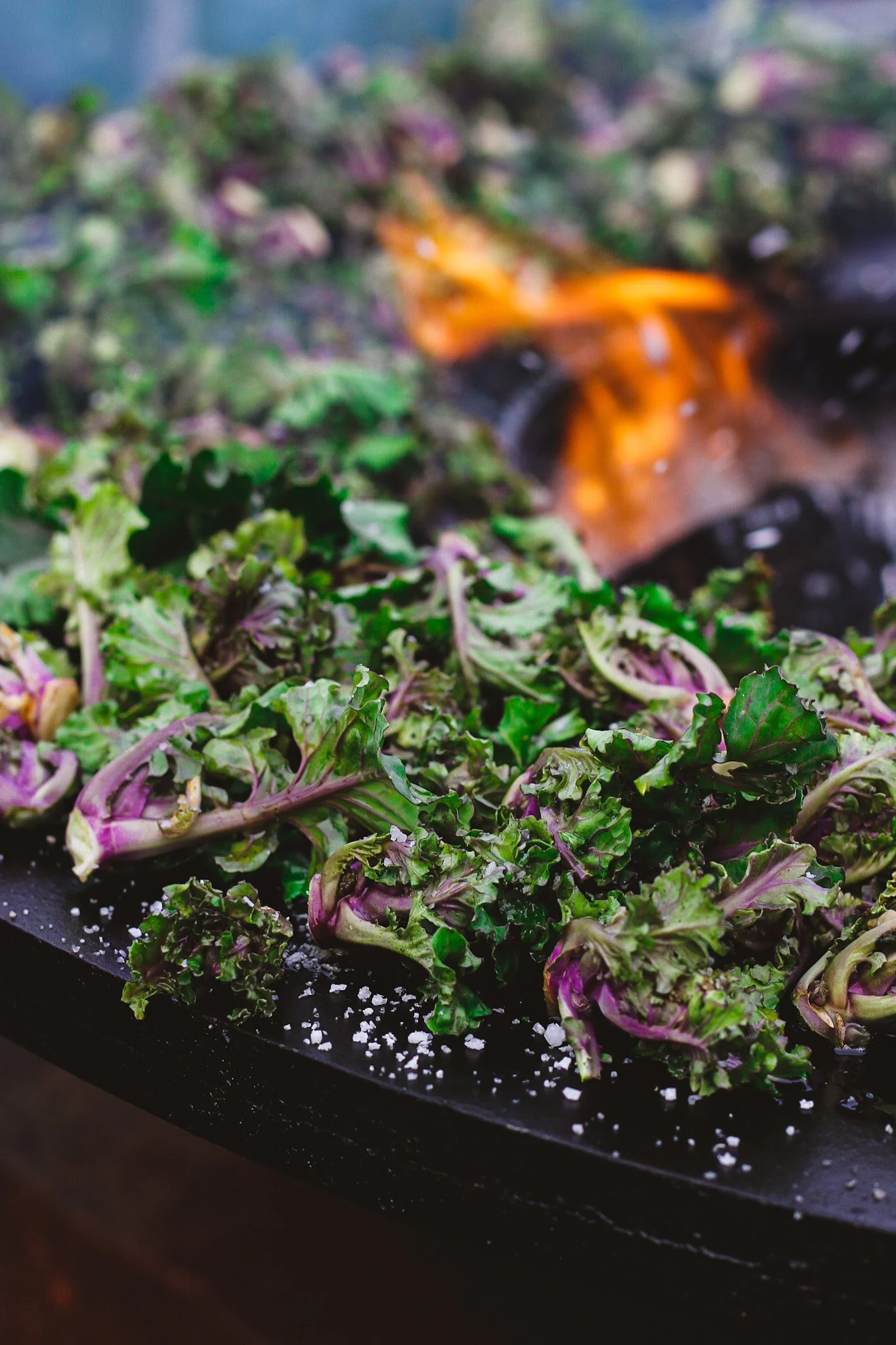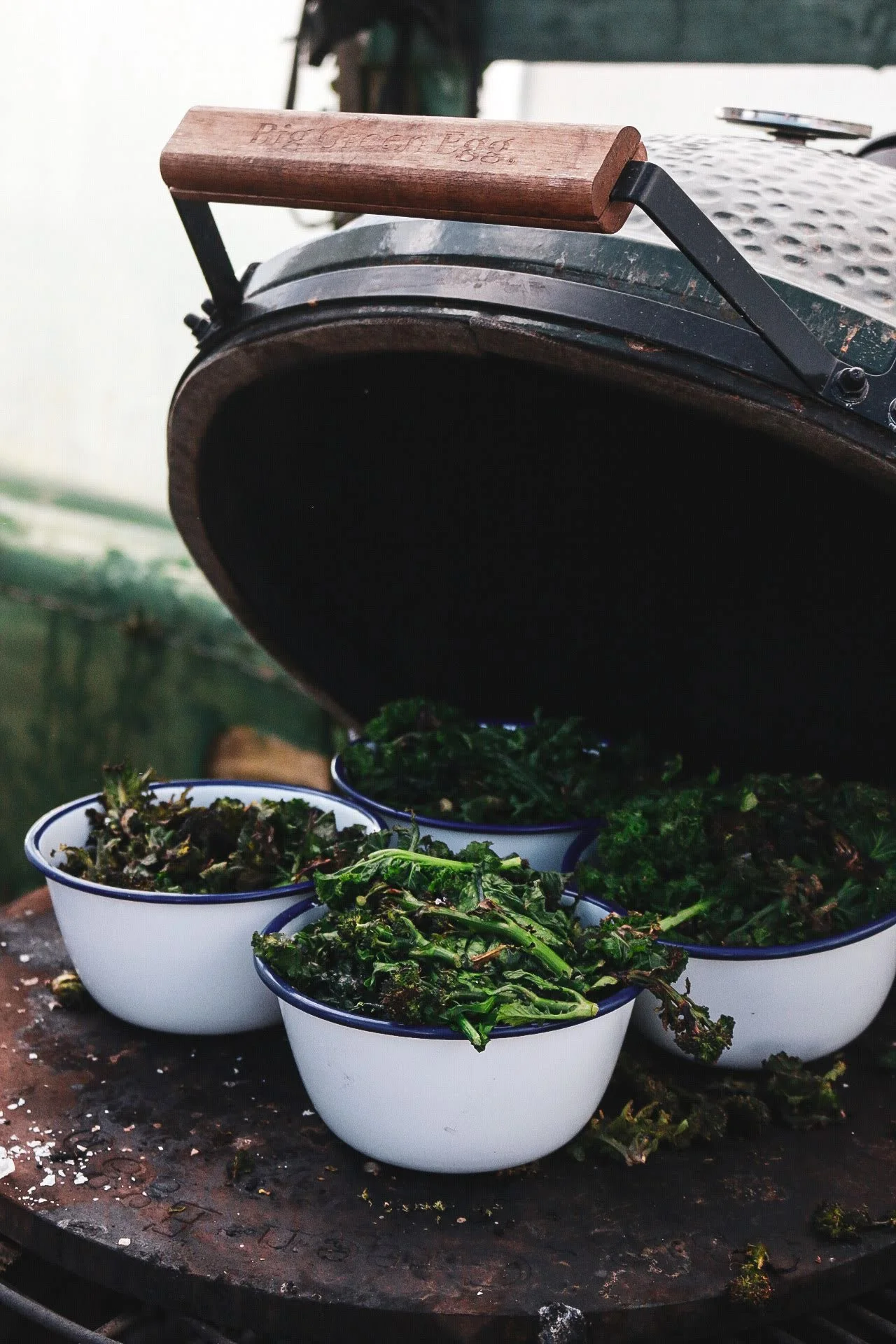 A person is lifting the lid off a charcoal grill with a wooden handle, revealing green leafy vegetables cooking inside, with steam rising. View fullsize