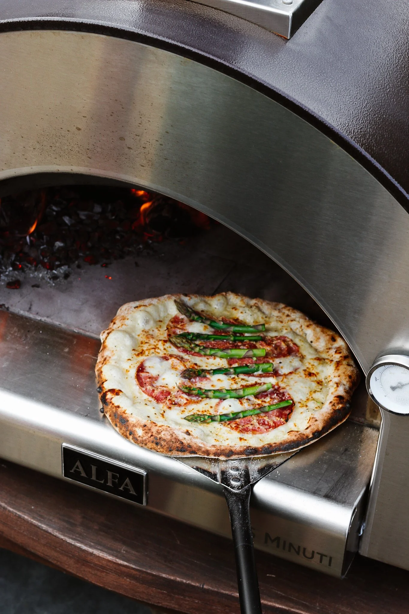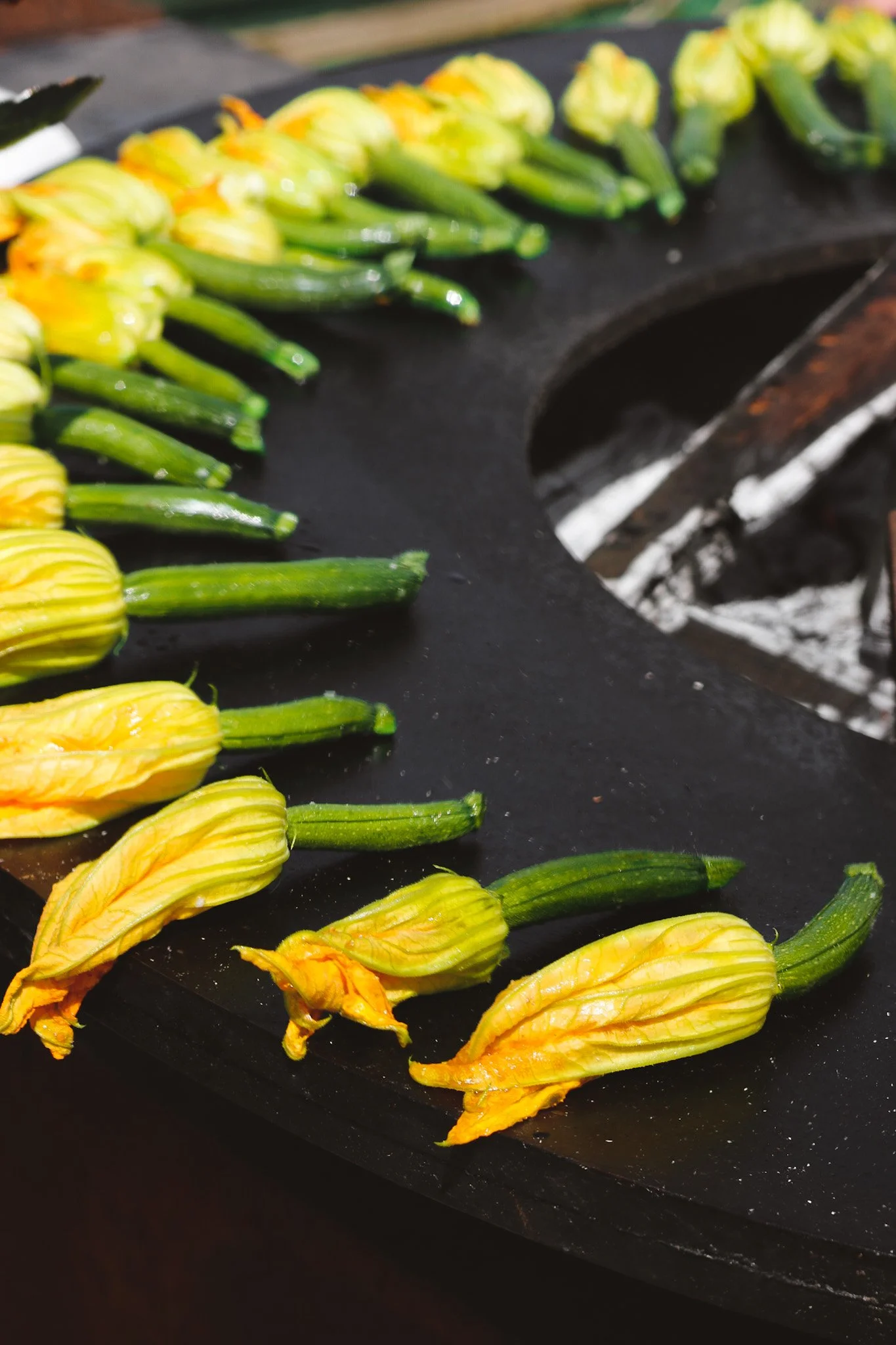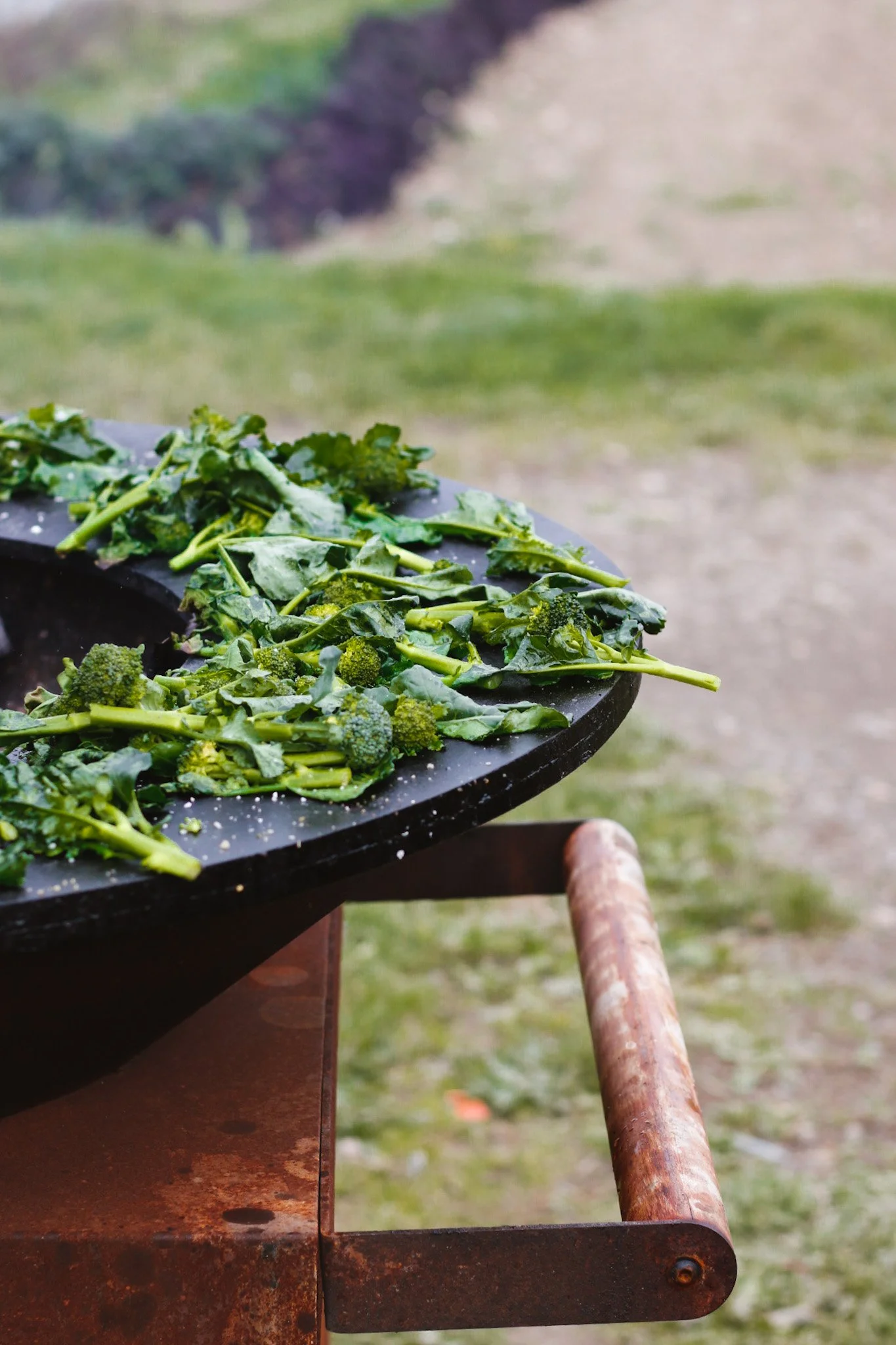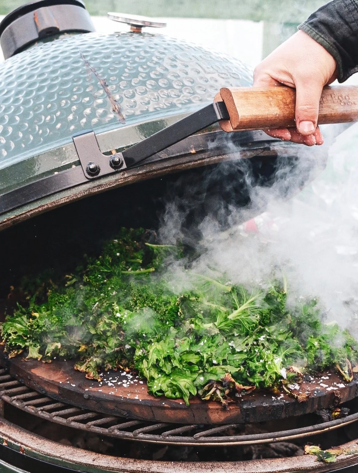 A person is lifting the lid off a charcoal grill with a wooden handle, revealing green leafy vegetables cooking inside, with steam rising.