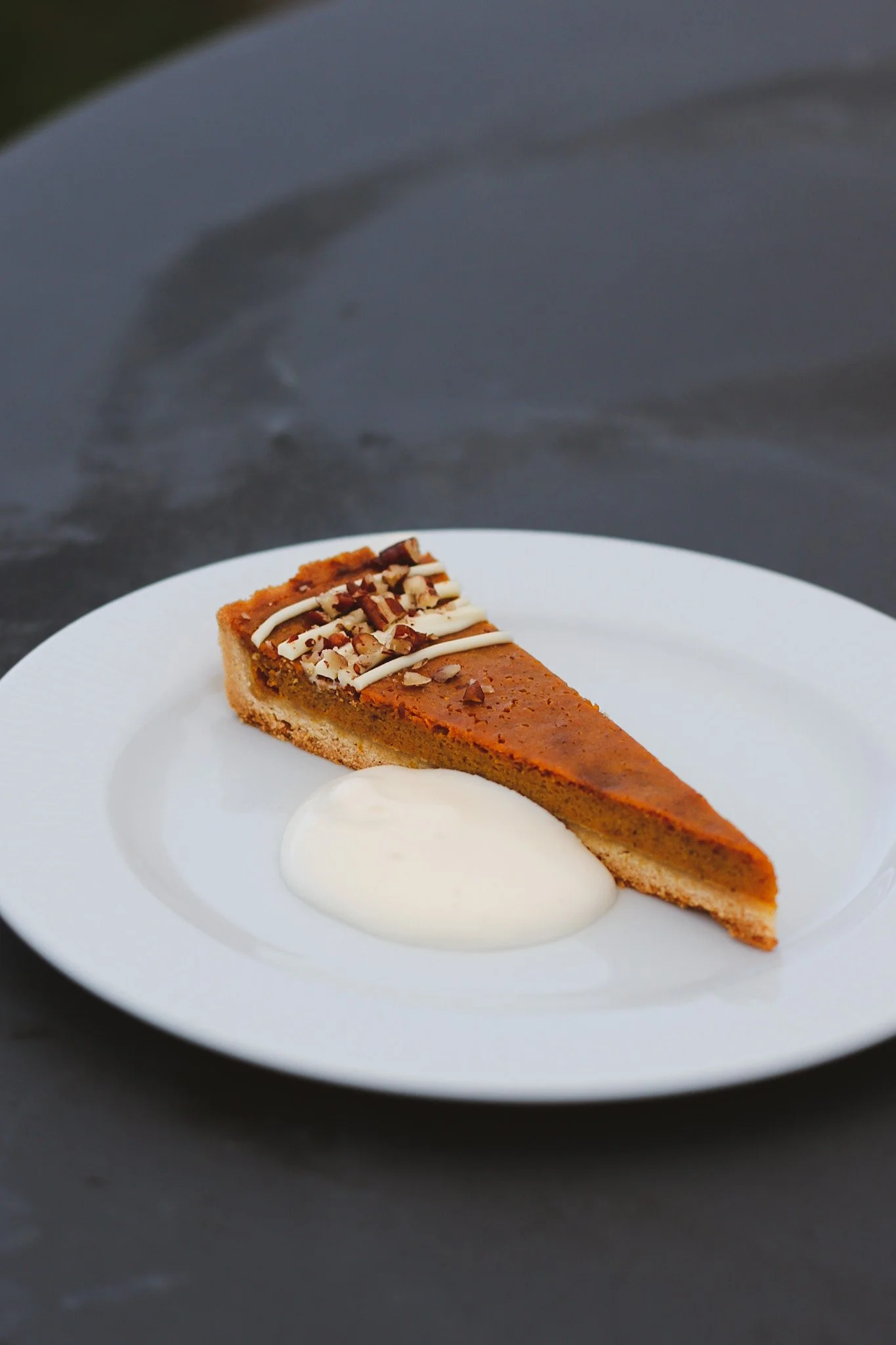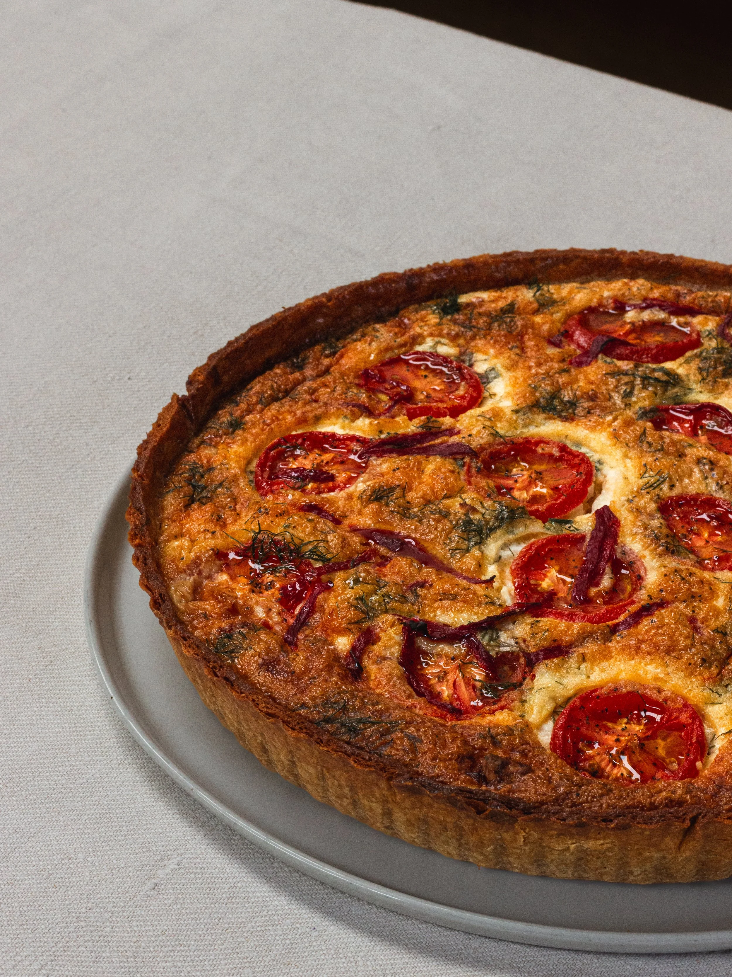 A savory quiche with cherry tomatoes, herbs, and cheese in a crust, served on a white plate.