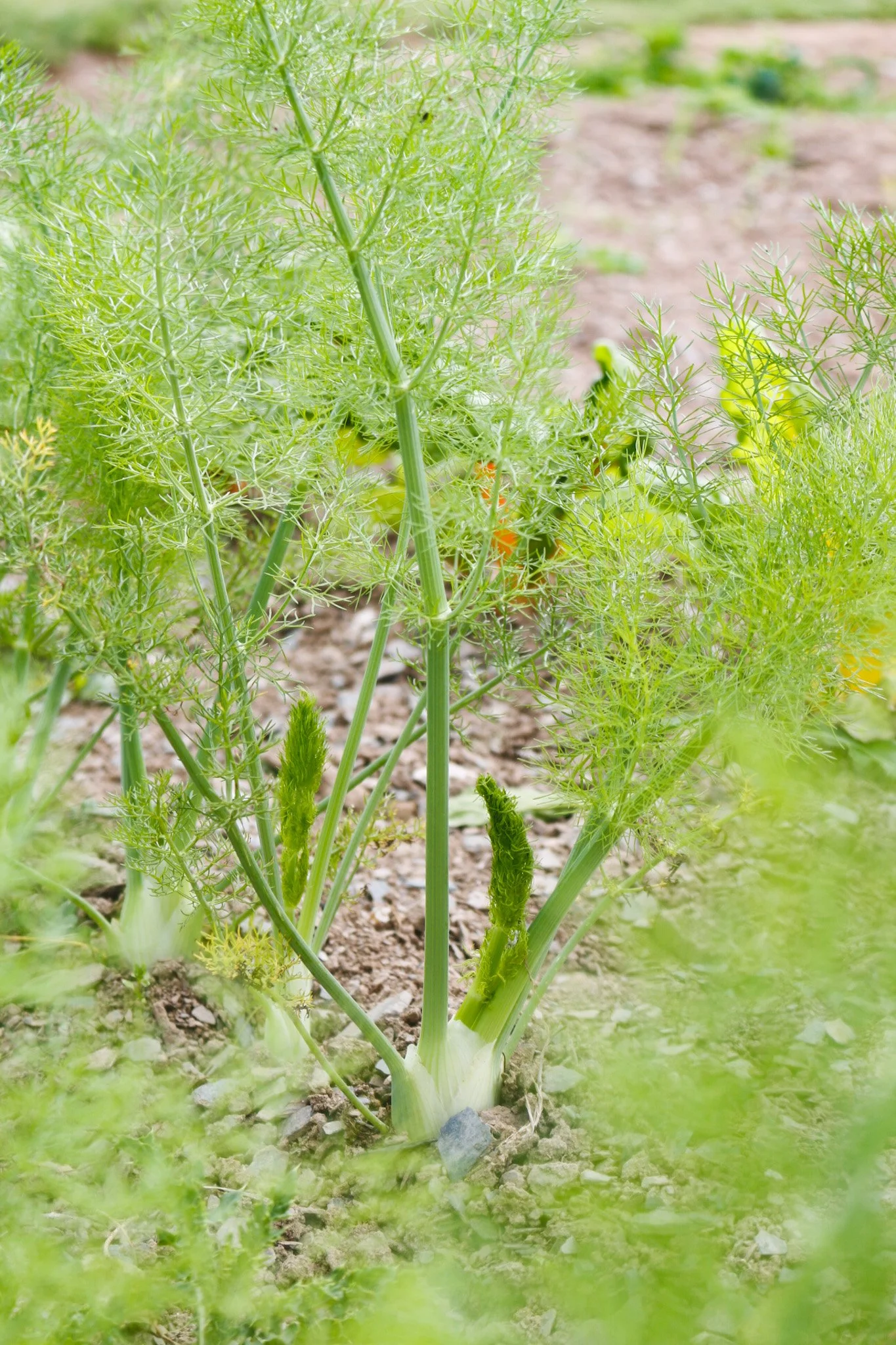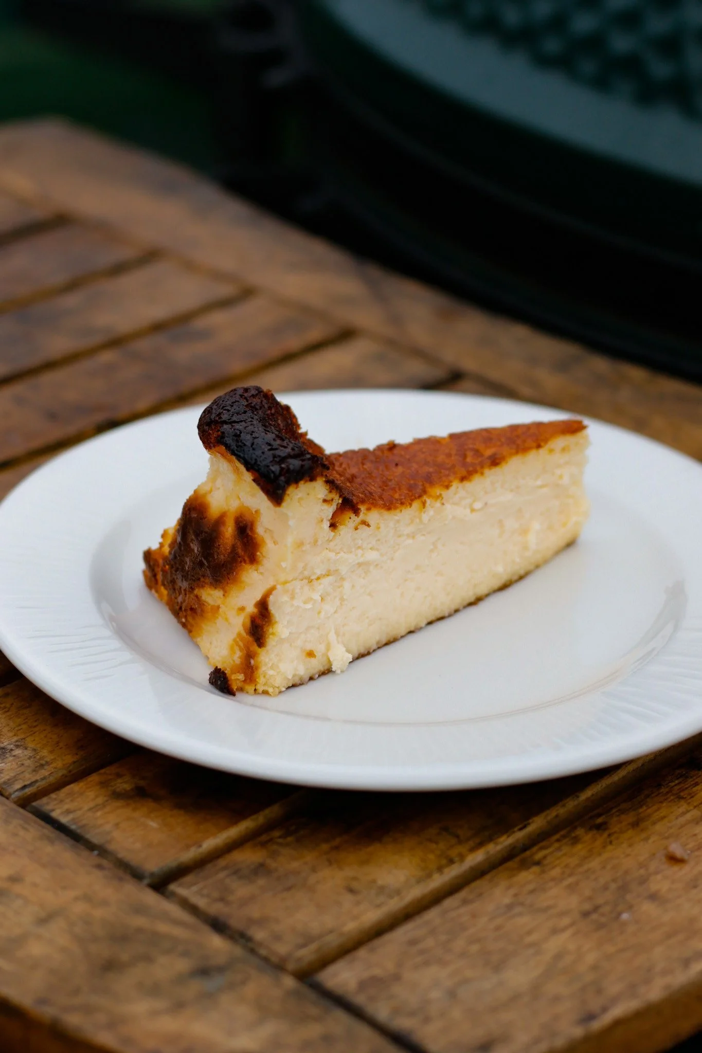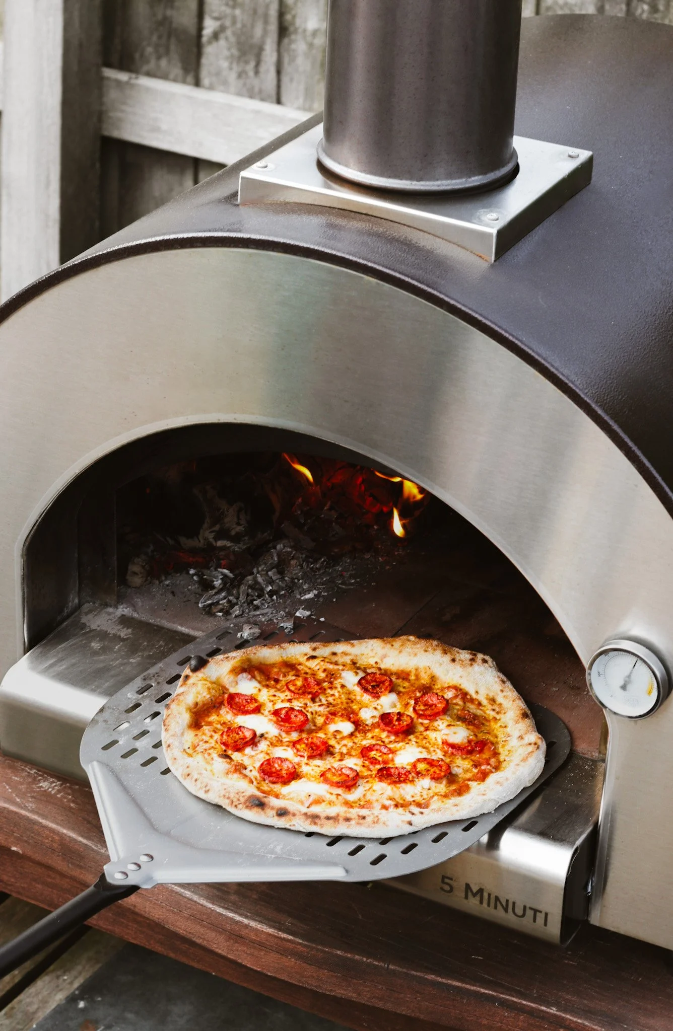 Close-up of a smoking green ceramic grill with a metal thermometer on its side, with a blurred background of a garden and flowers.