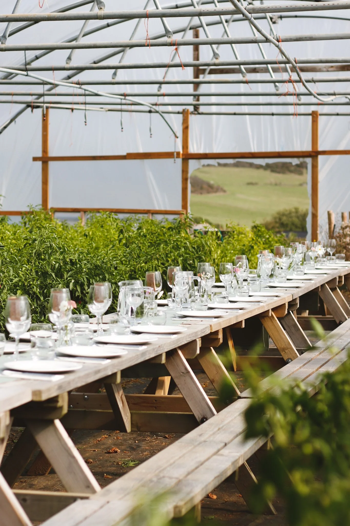 A long outdoor table set with wine glasses, water glasses, plates, and small flower vases in a greenhouse or garden setting. View fullsize