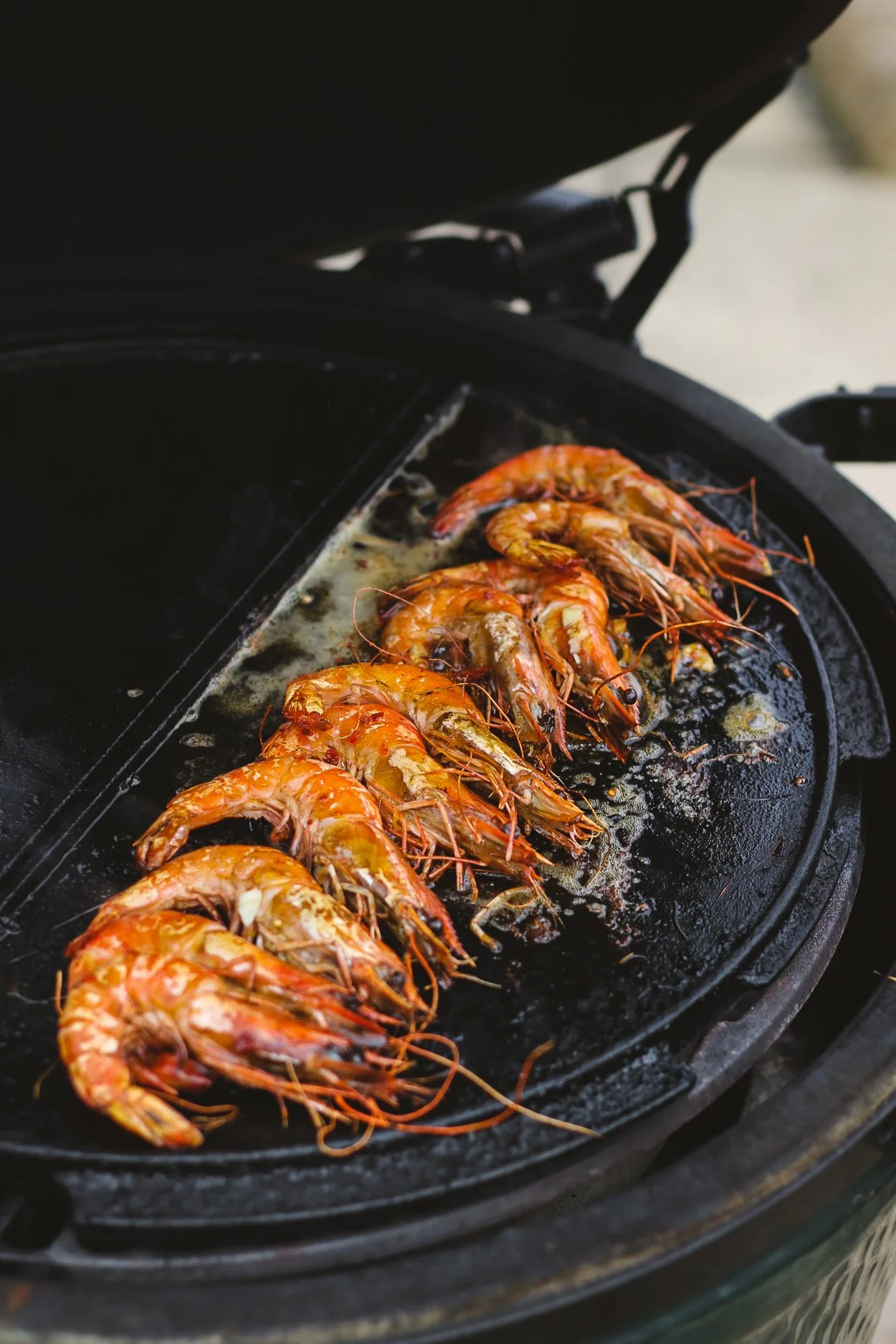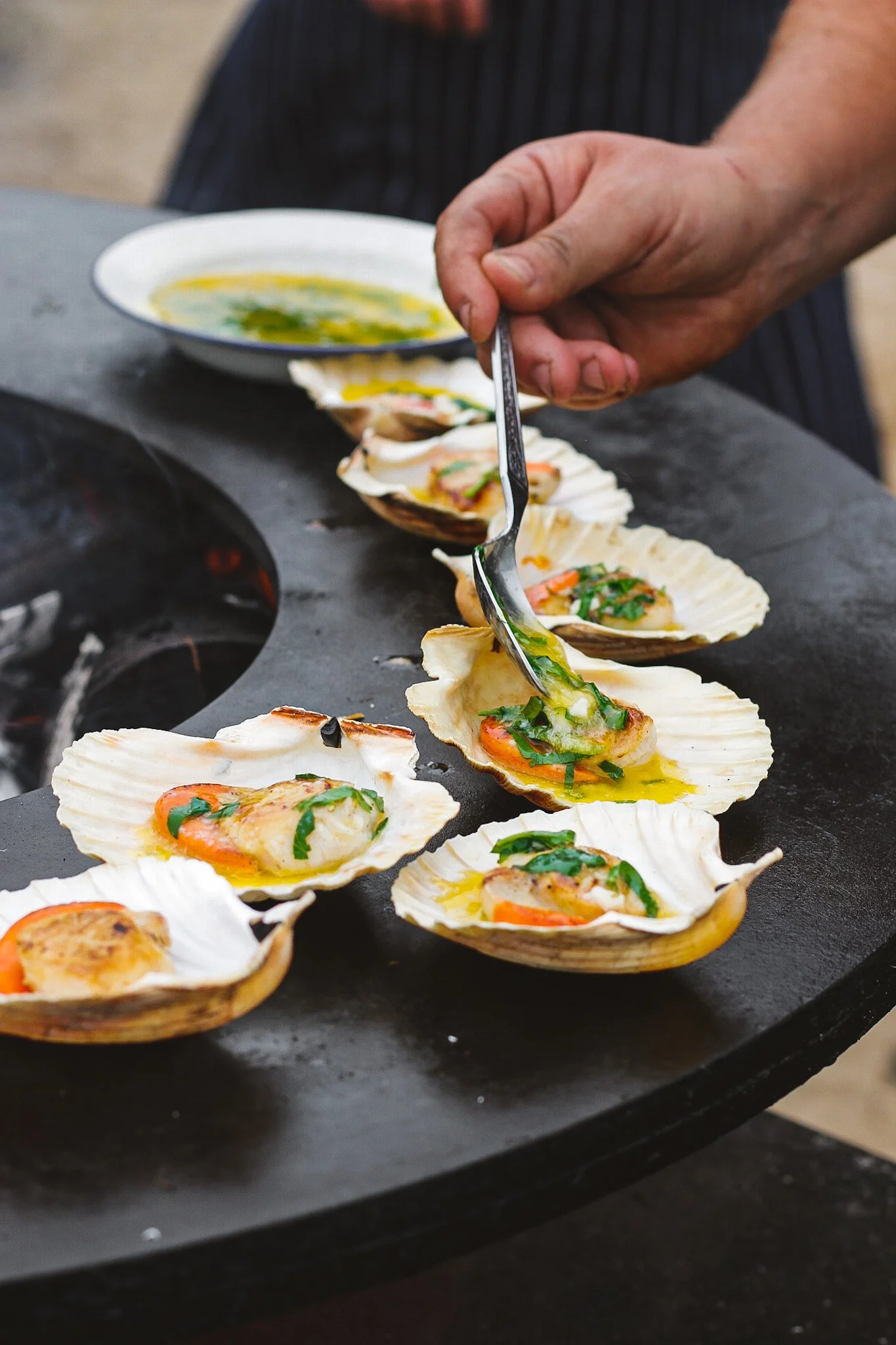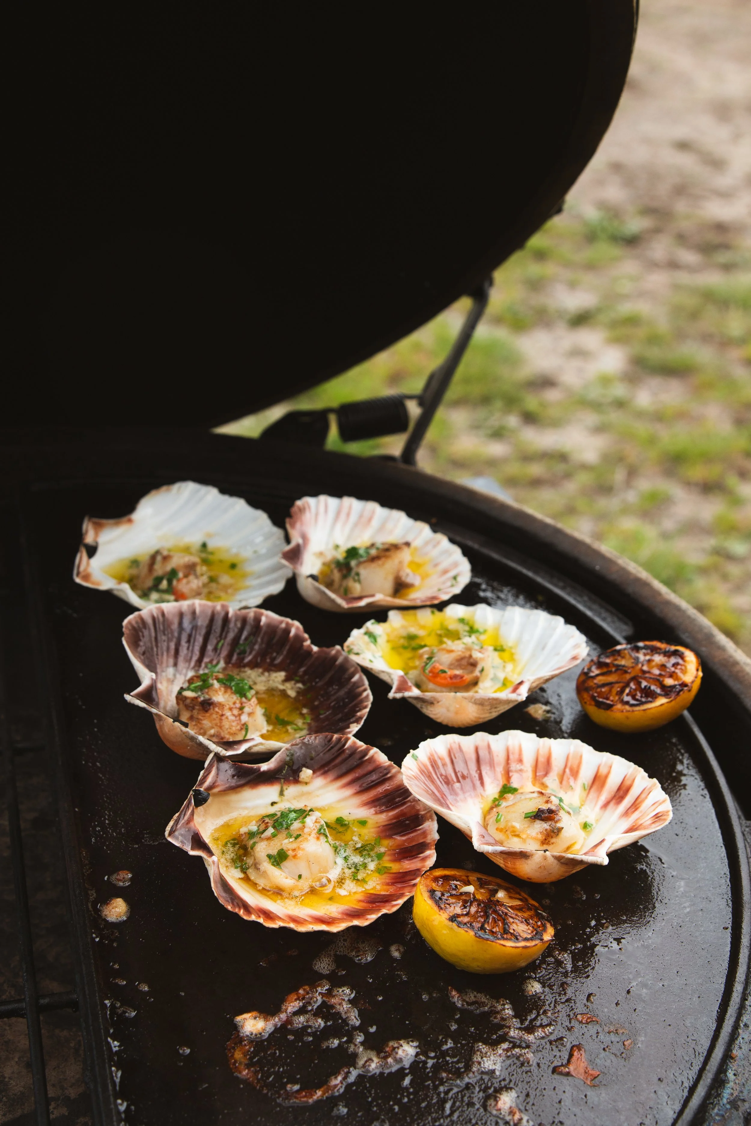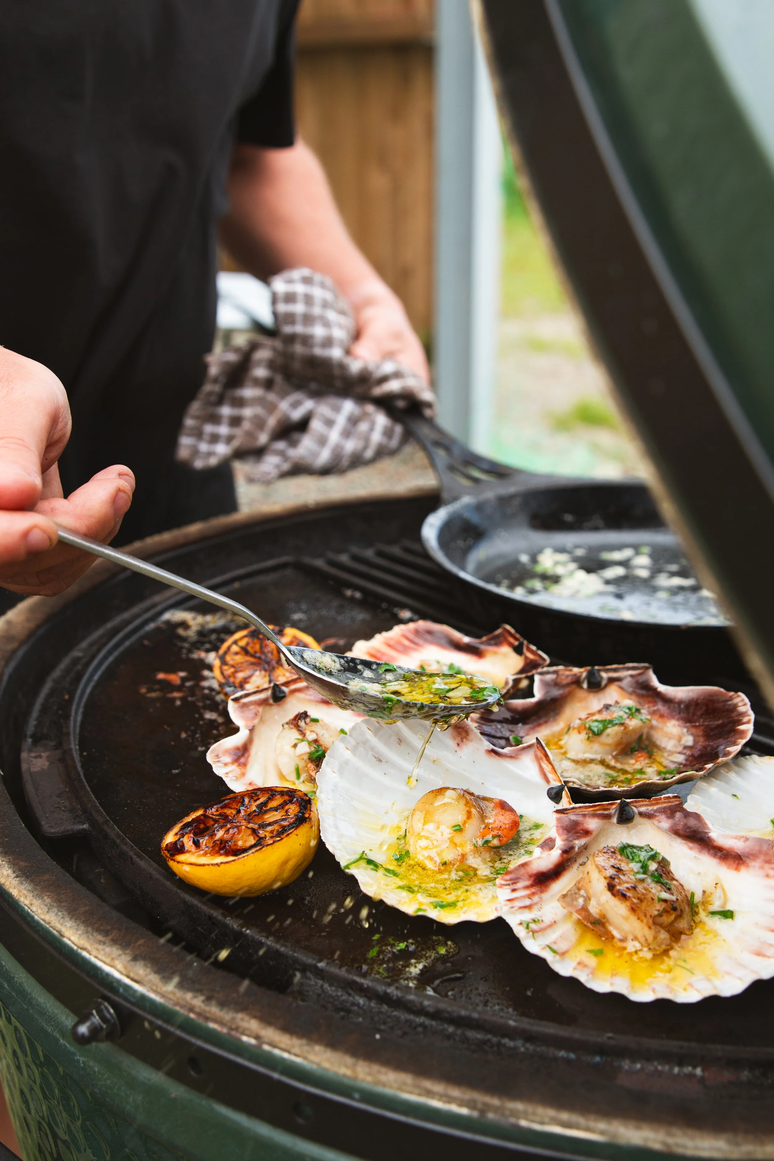 Close-up of outdoor grill with scallops, lemon, and herbs cooked on a griddle. Someone is adding oil or sauce with a spoon, and a person in black shirt is holding a checkered cloth.