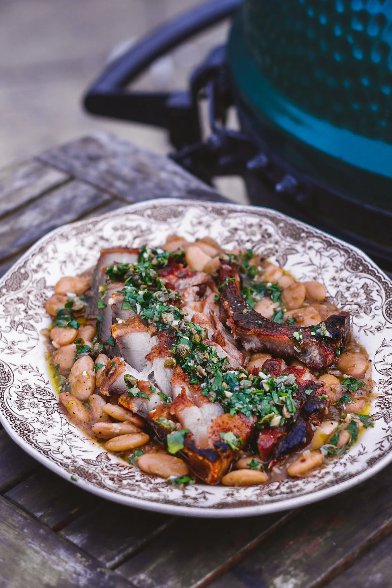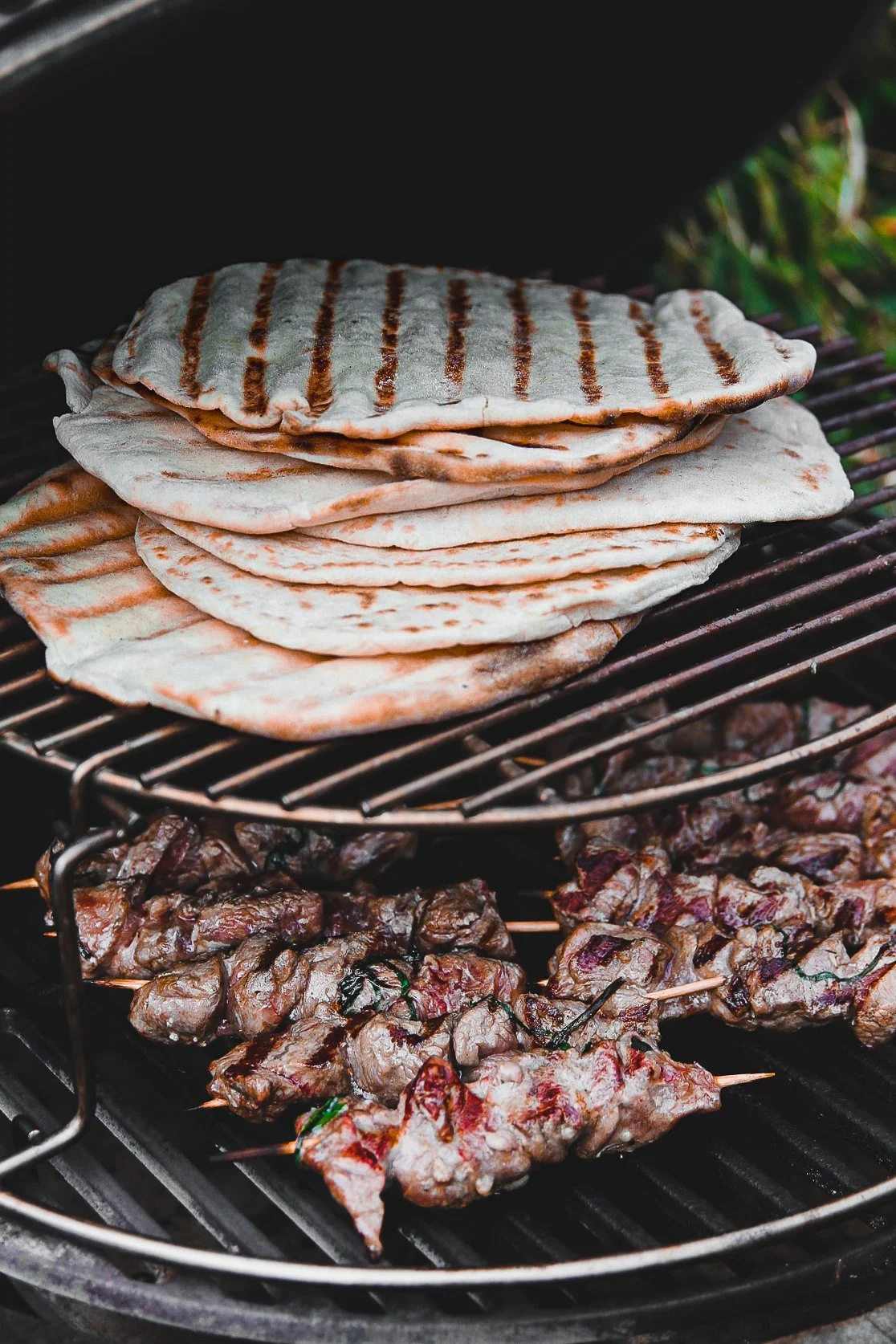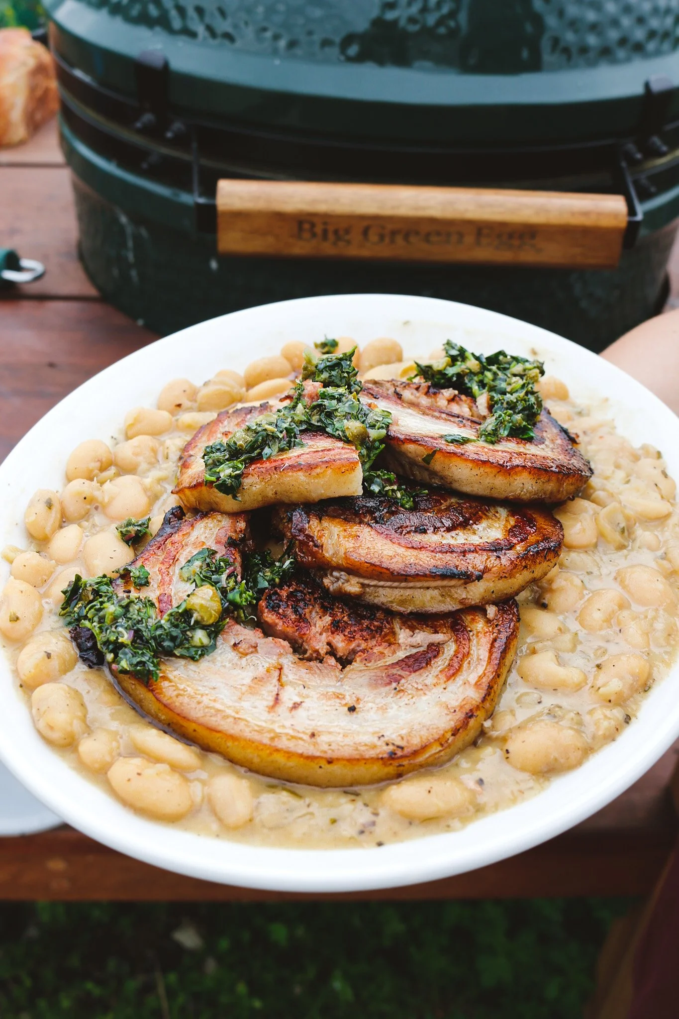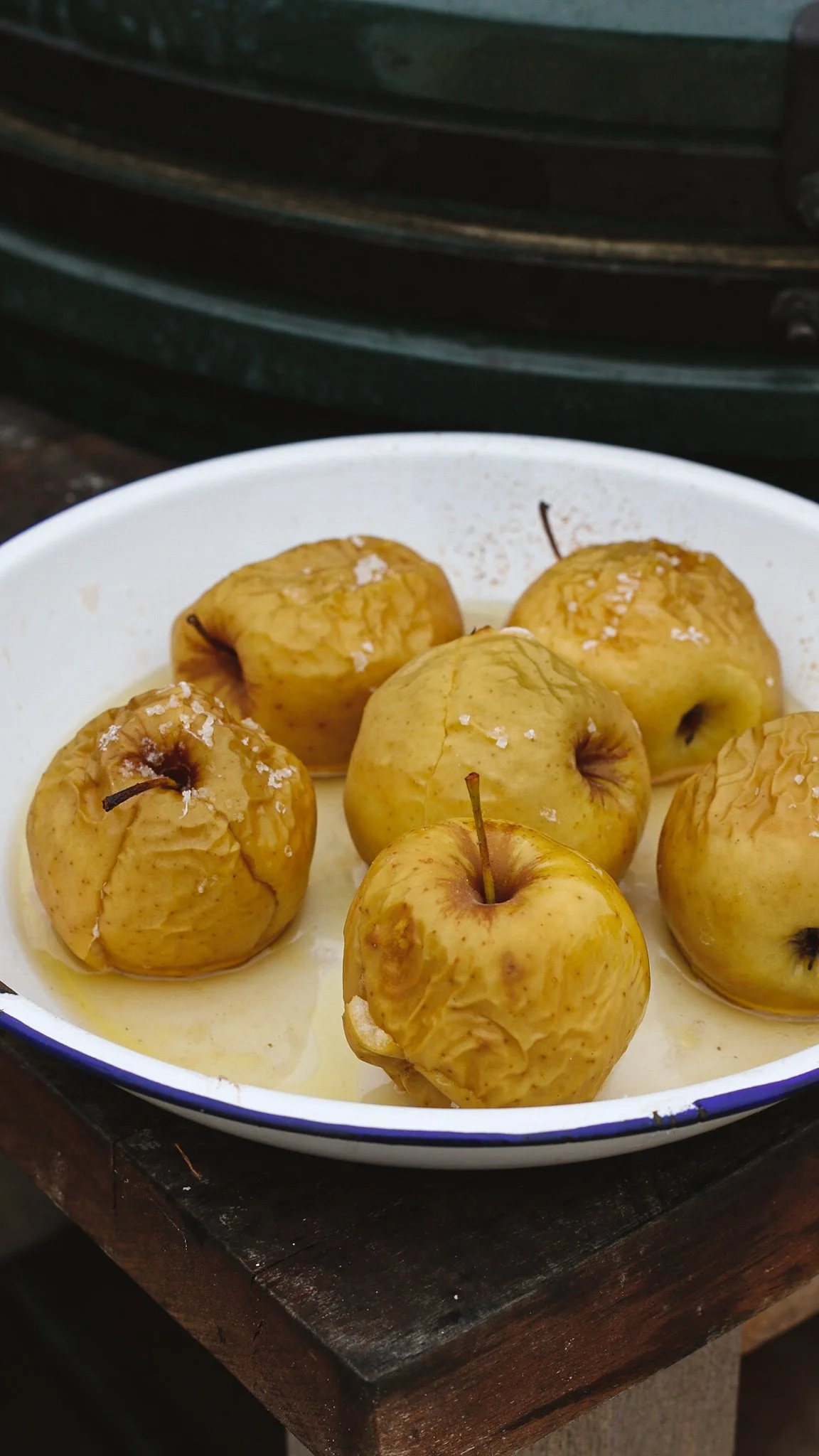 Close-up of outdoor grill with scallops, lemon, and herbs cooked on a griddle. Someone is adding oil or sauce with a spoon, and a person in black shirt is holding a checkered cloth.