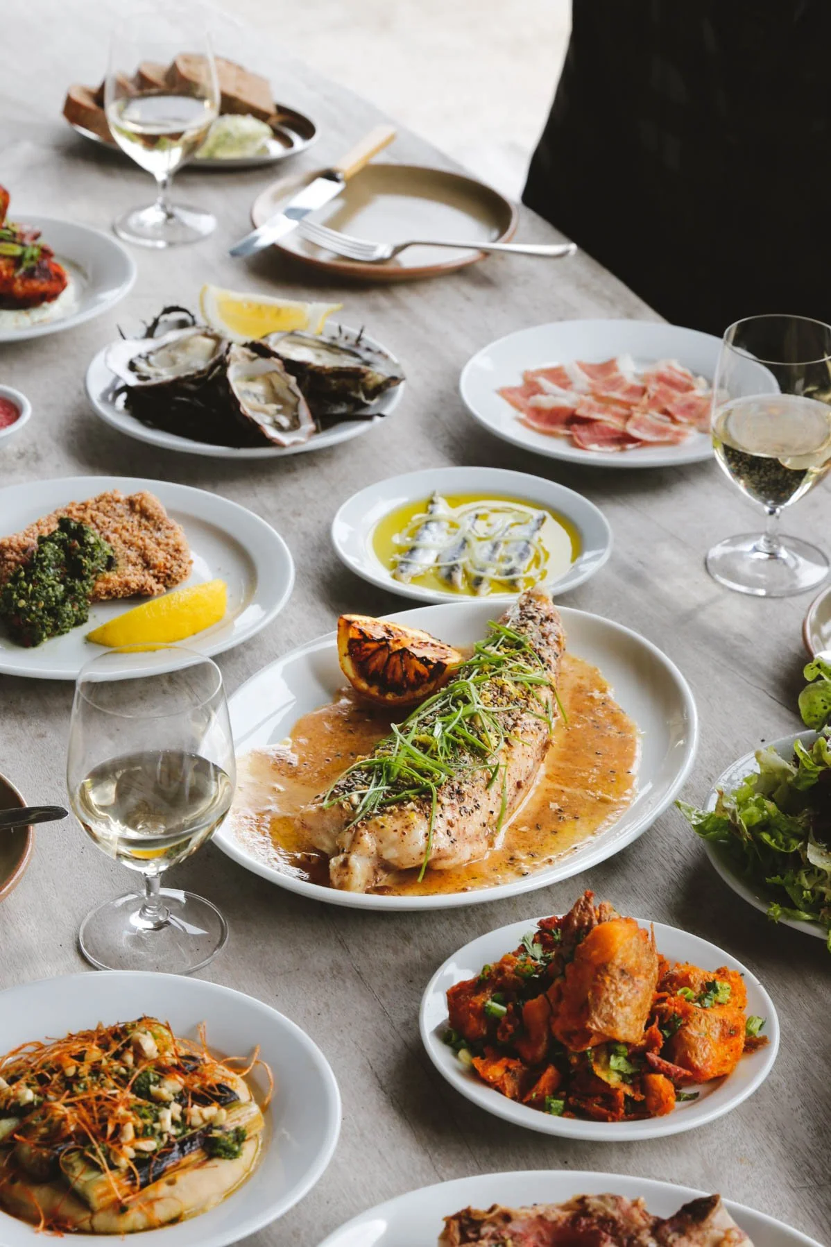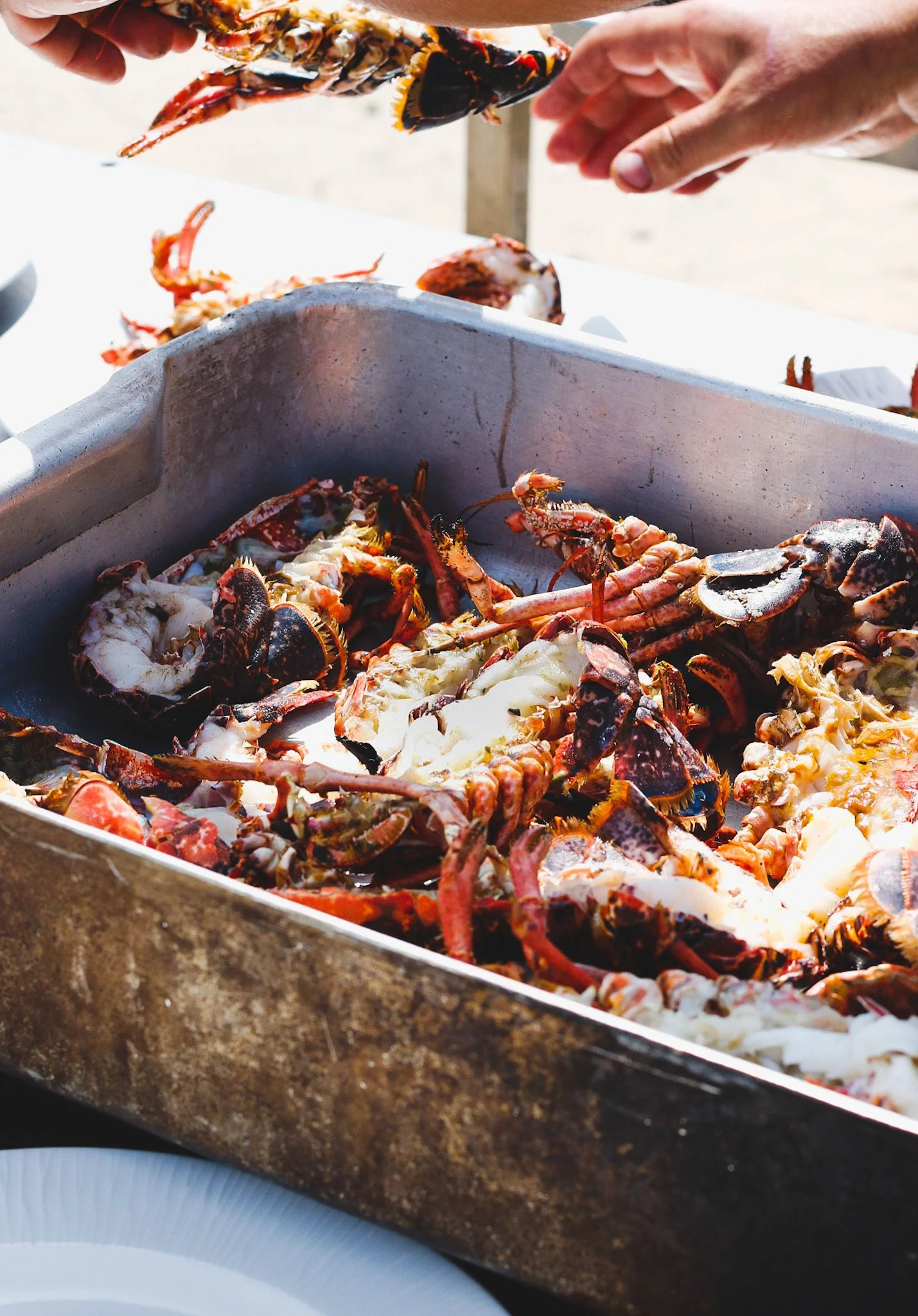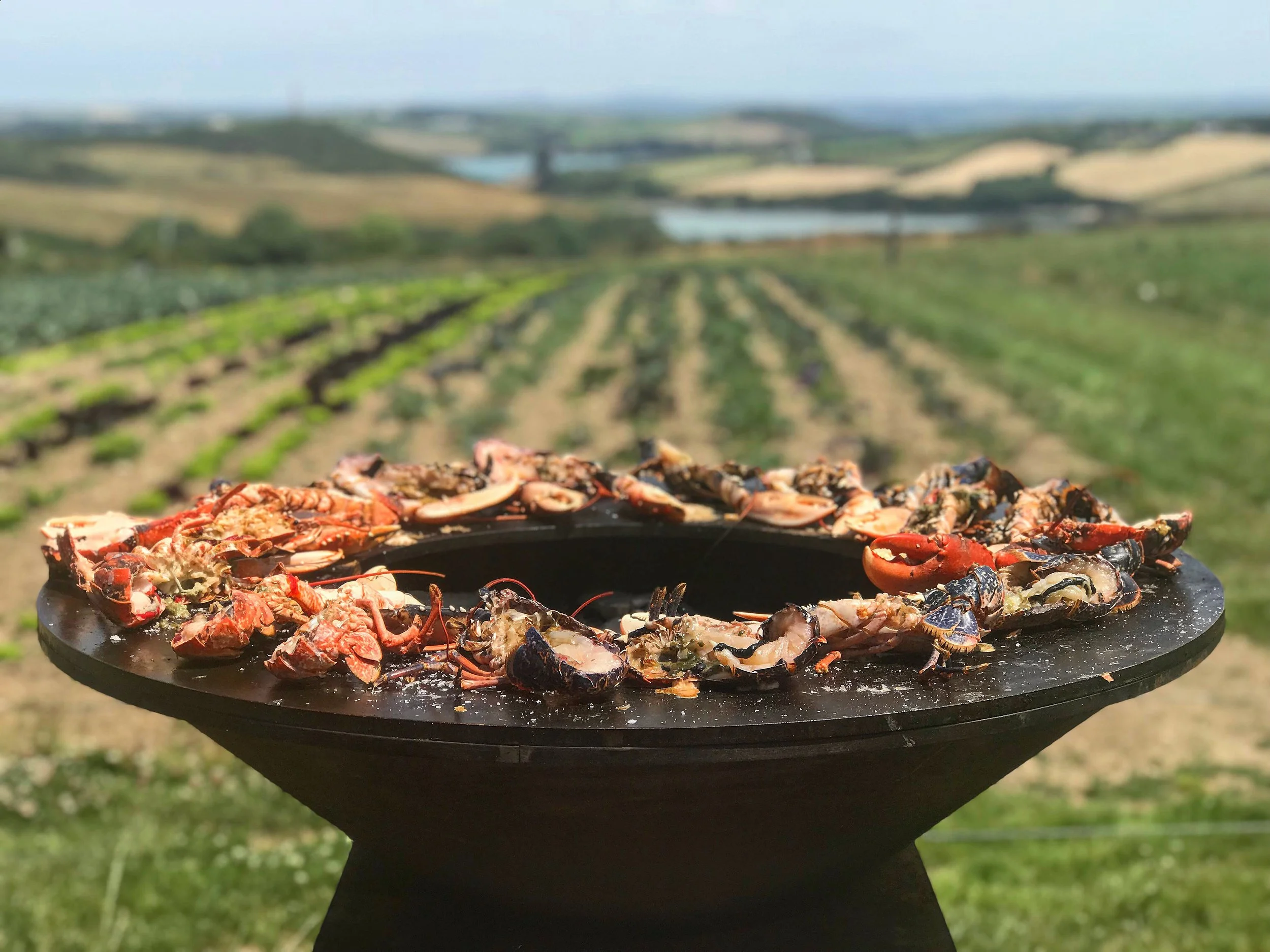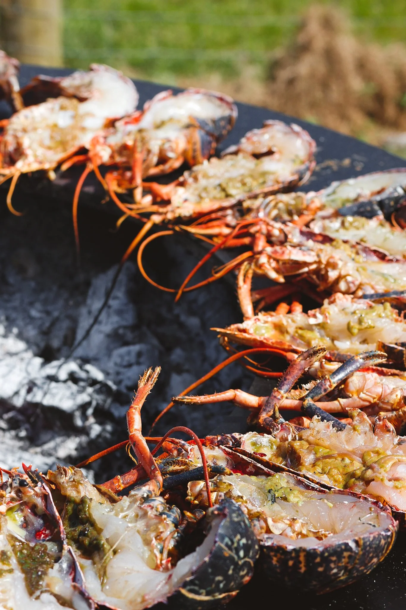 An array of seafood dishes on a white table including shrimp, oysters, and a lobster salad, with glasses of tea and water at prawn on the lawn in padstow