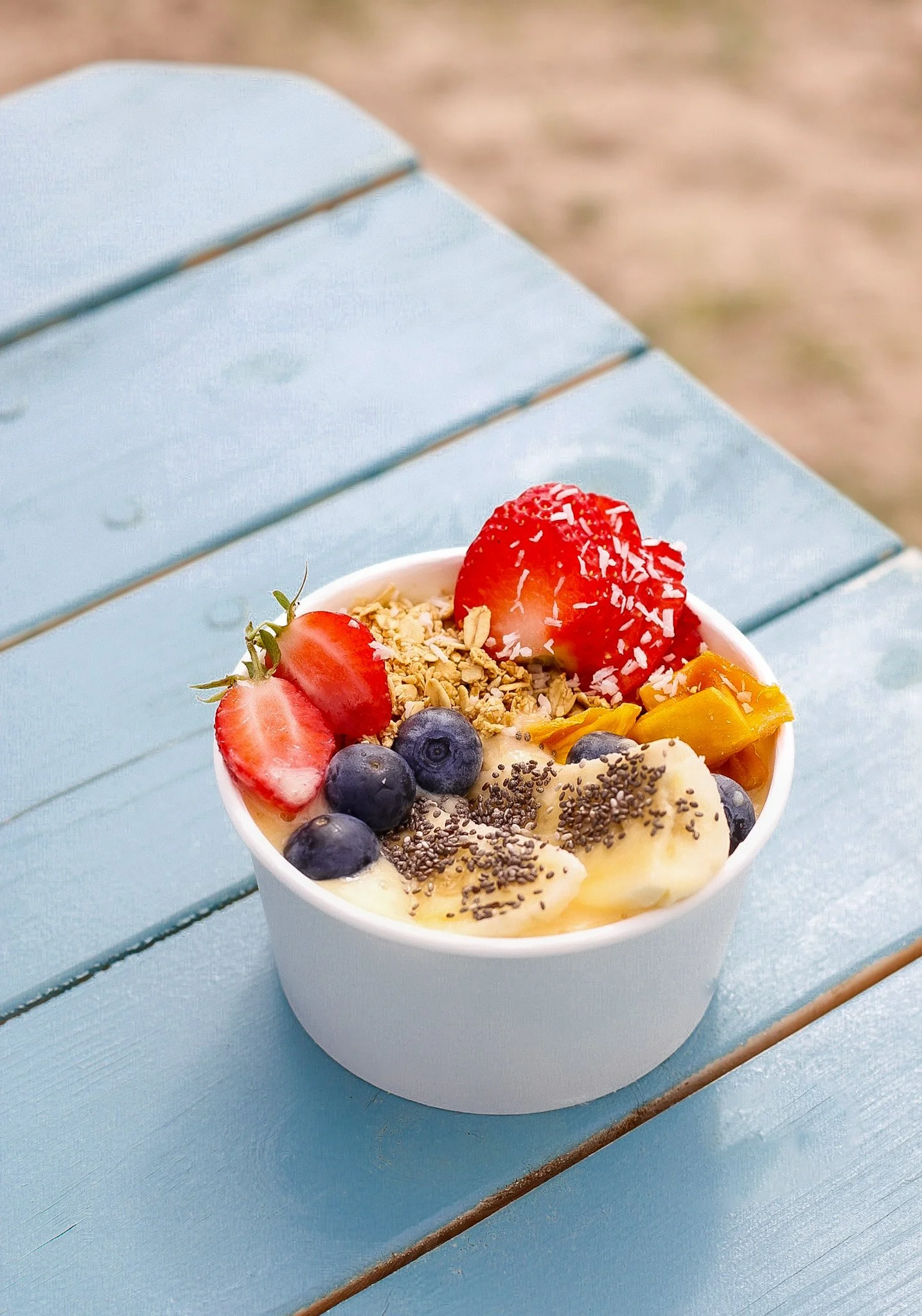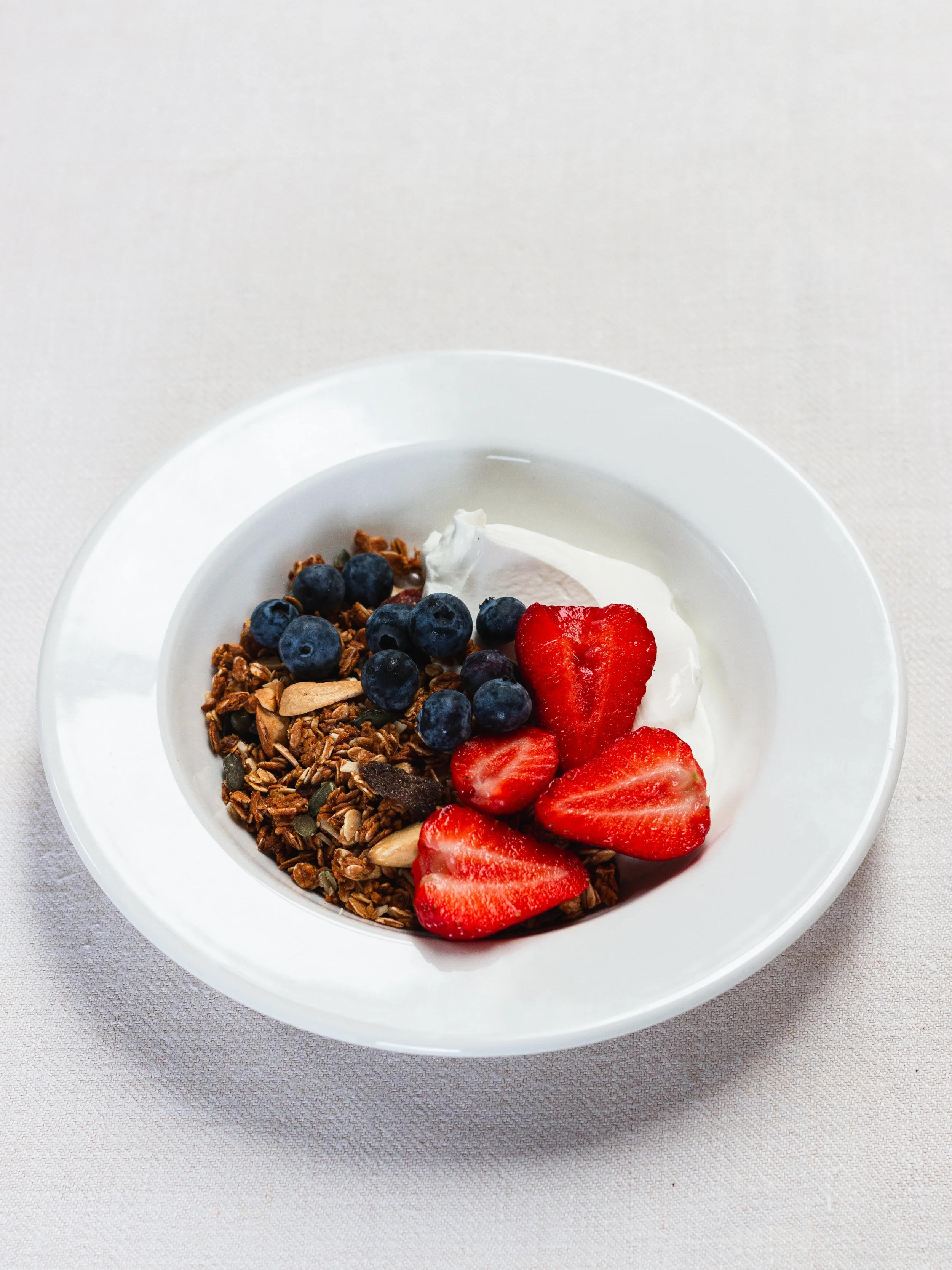 A white bowl containing granola, blueberries, sliced strawberries, and a dollop of yogurt, on a white tablecloth.