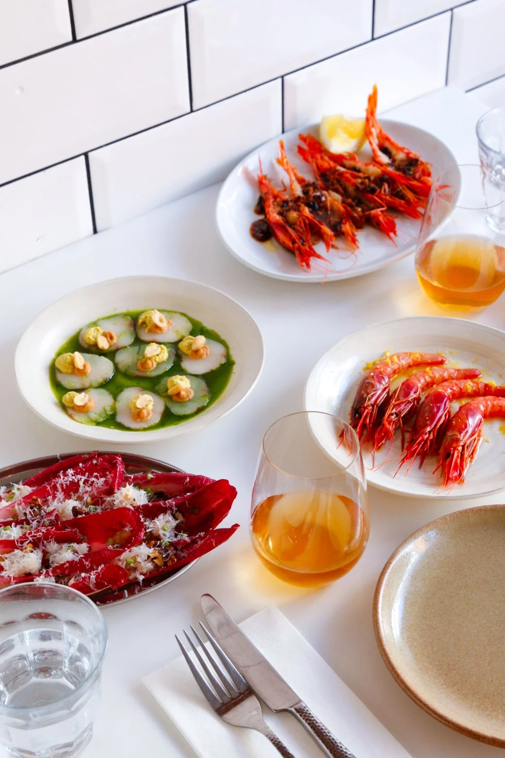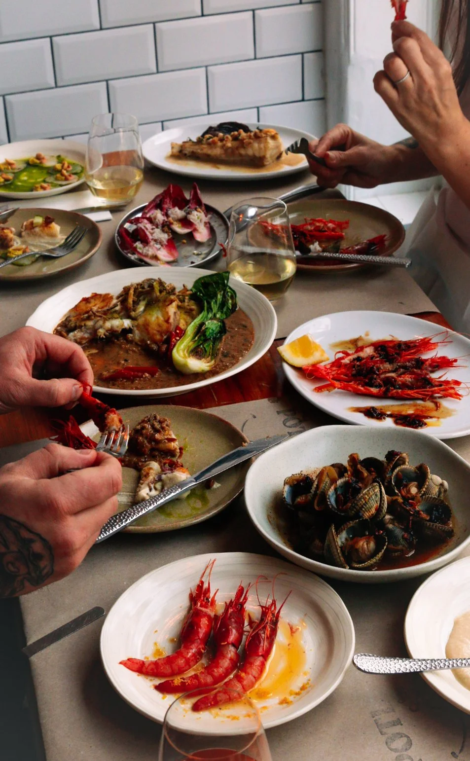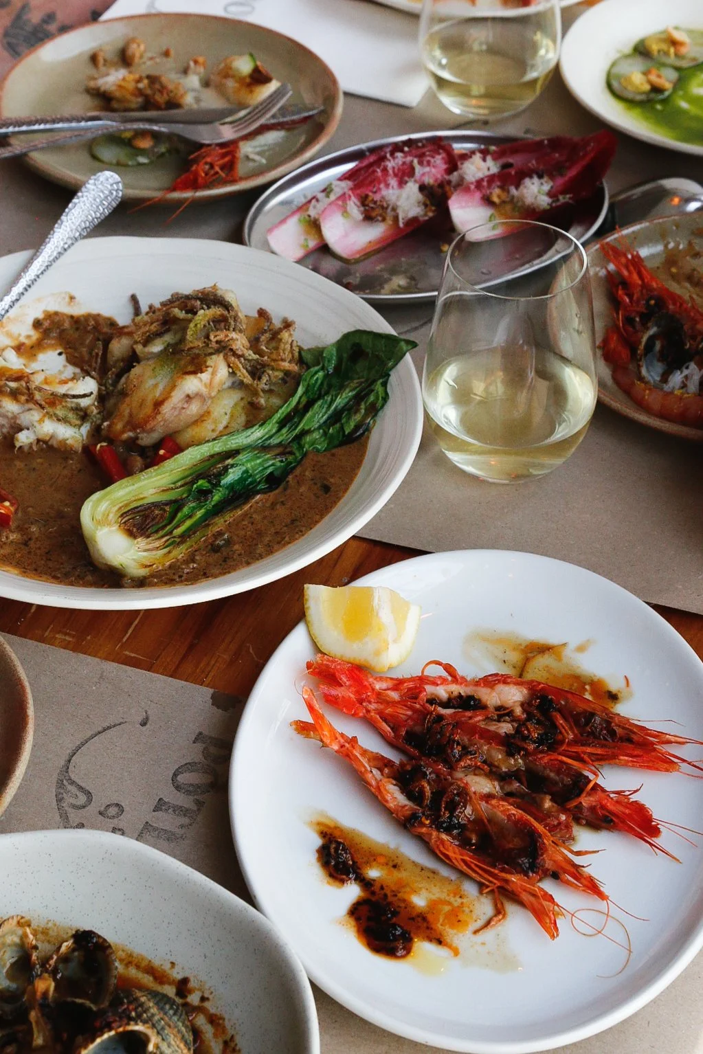 Seafood dishes including grilled shrimp with a lemon wedge, a bowl of curry with vegetables, and various plates of seafood delicacies on a dining table with glasses of white wine.