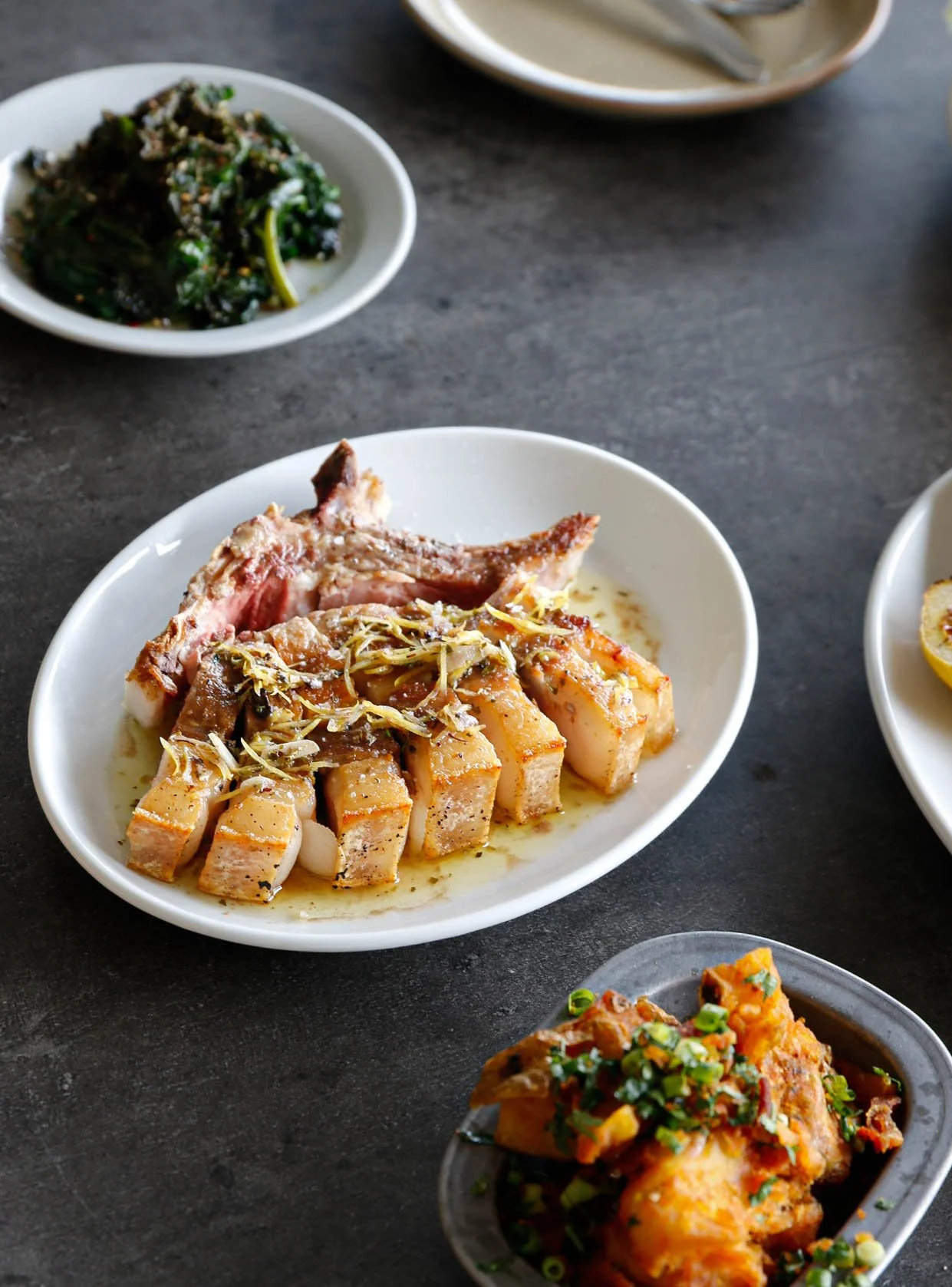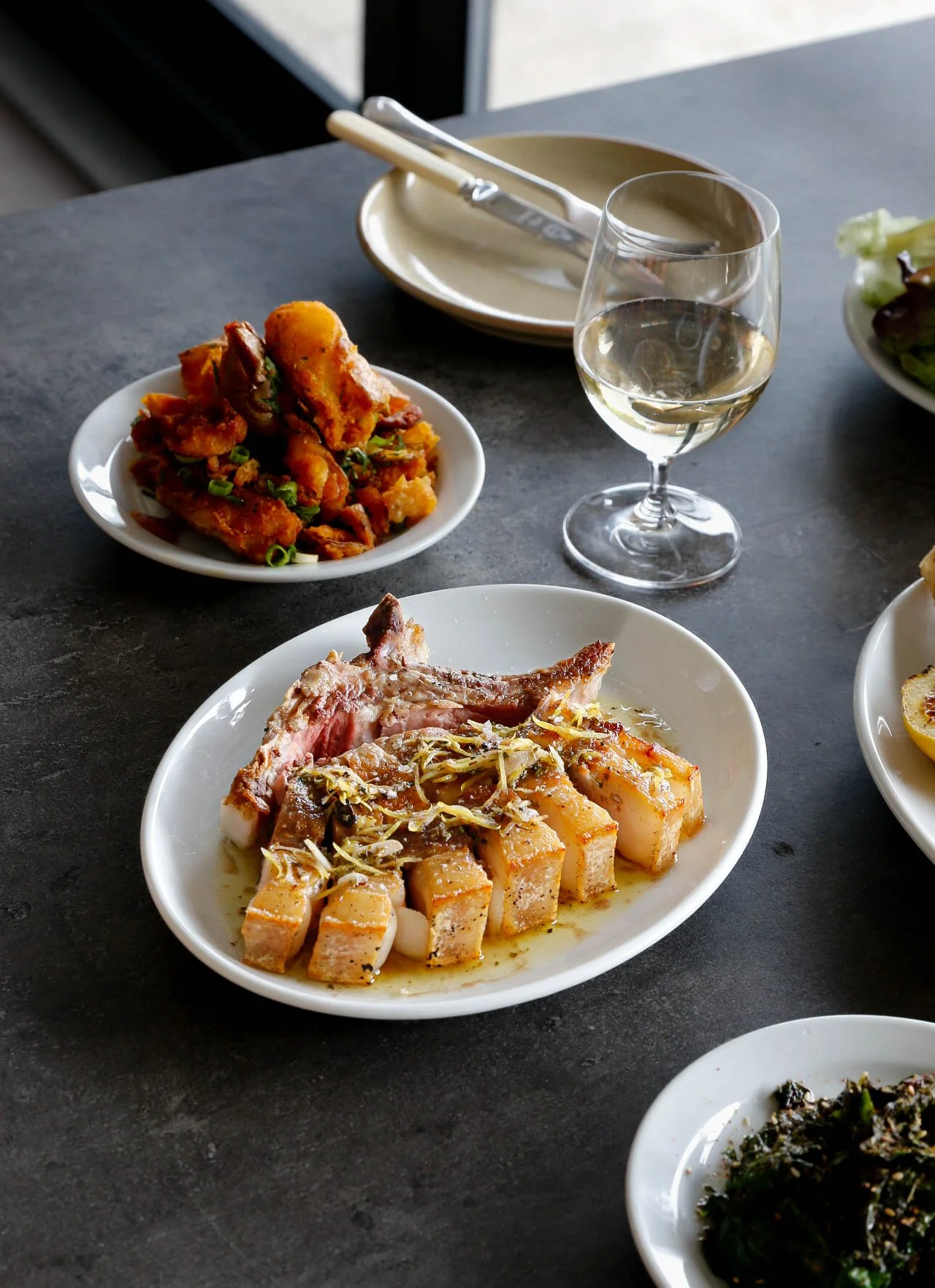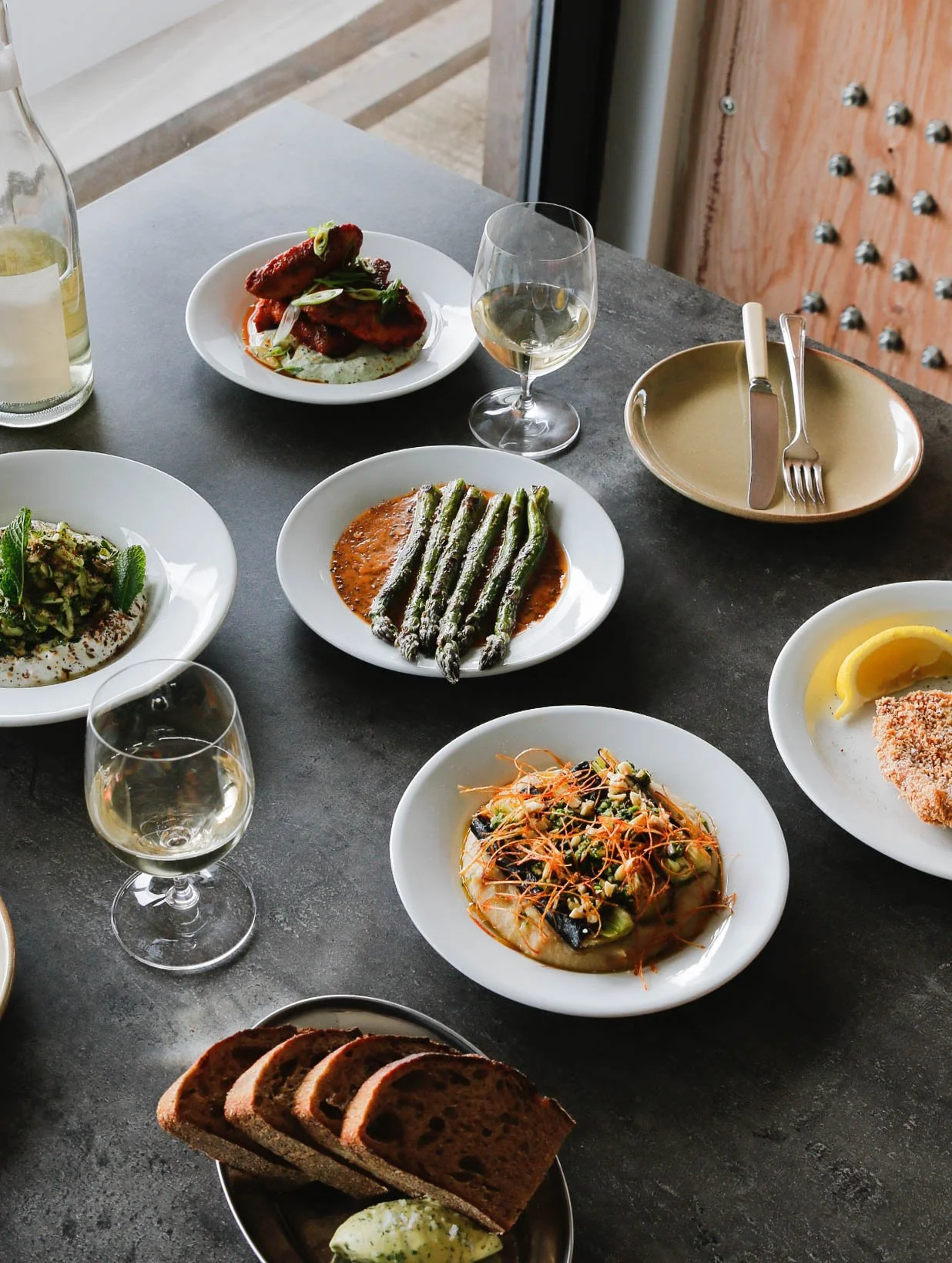 Seafood dishes including grilled shrimp with a lemon wedge, a bowl of curry with vegetables, and various plates of seafood delicacies on a dining table with glasses of white wine.