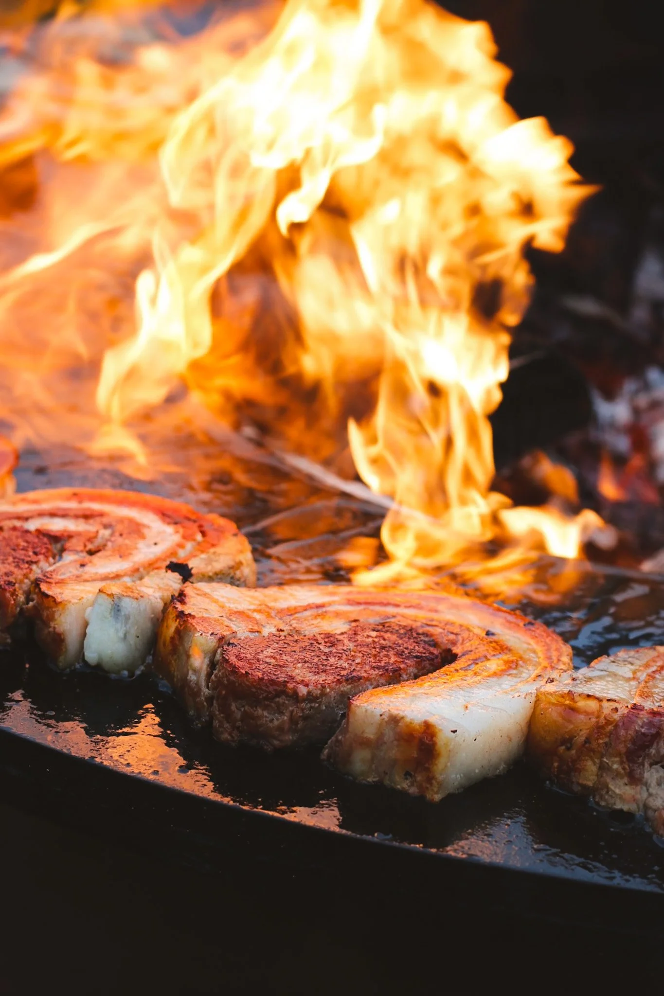 Two fish fillets cooking on wooden boards over an outdoor grill with herbs and a knife in the background.