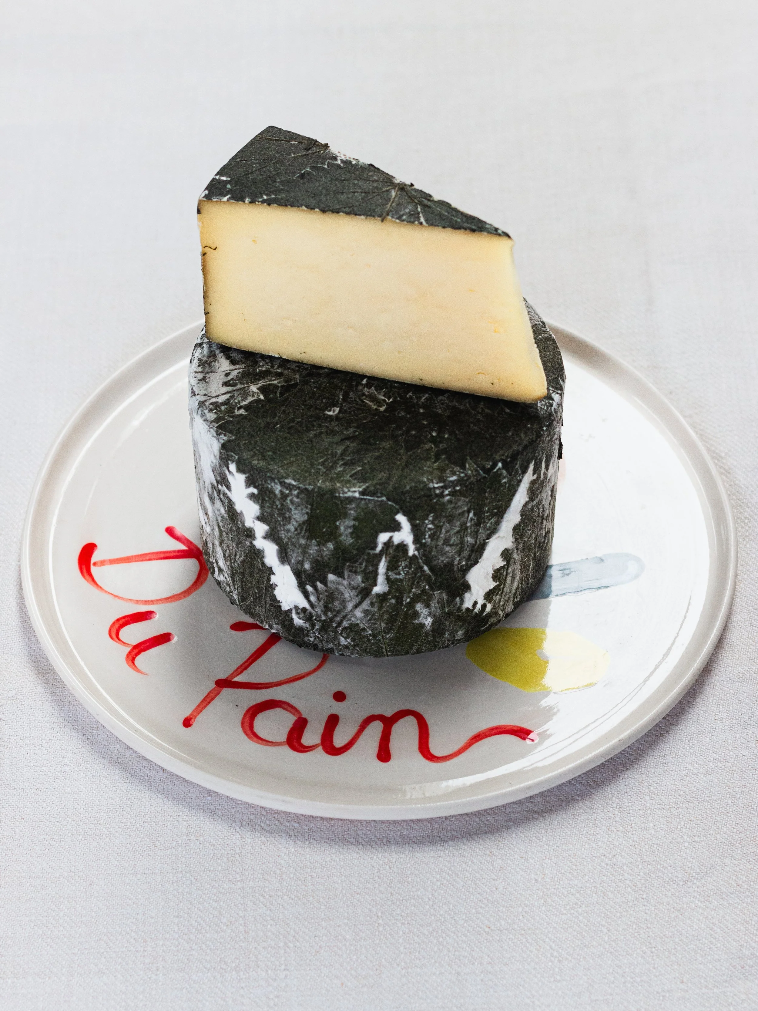 A wheel of black and white cheese with a slice cut out, placed on a decorative plate with the words "u Pain" written on it.
