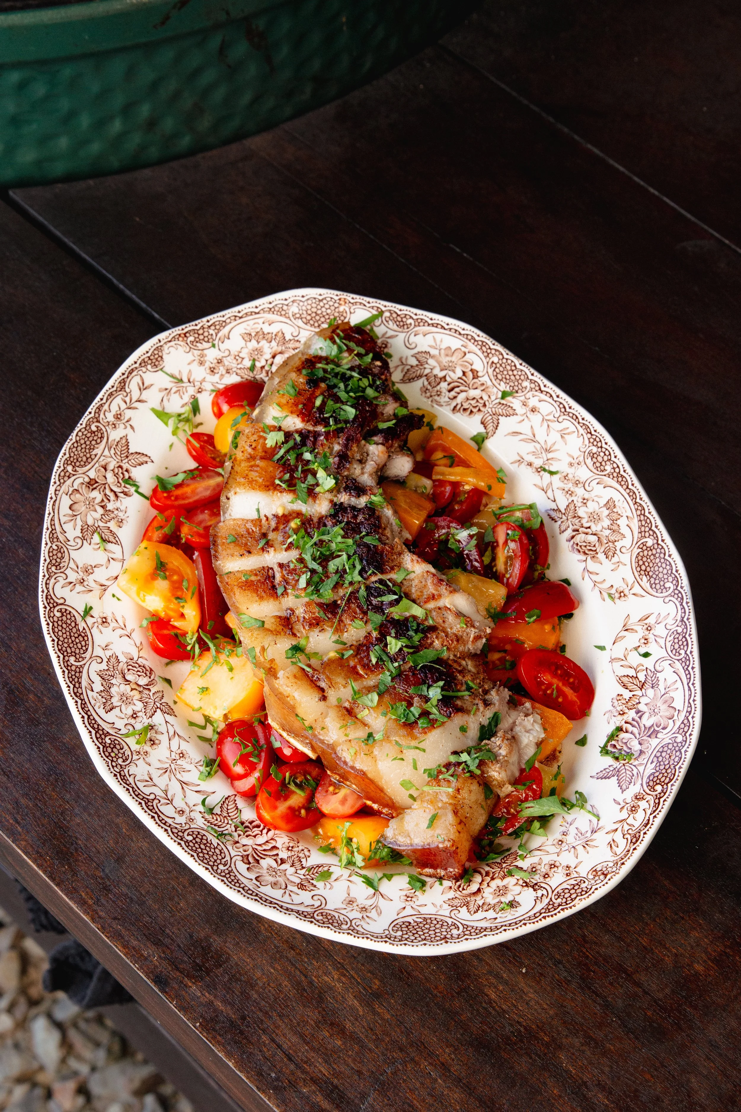 Grilled fish topped with chopped herbs on a plate surrounded by chopped cherry tomatoes and pineapple chunks, placed on a dark wooden table.