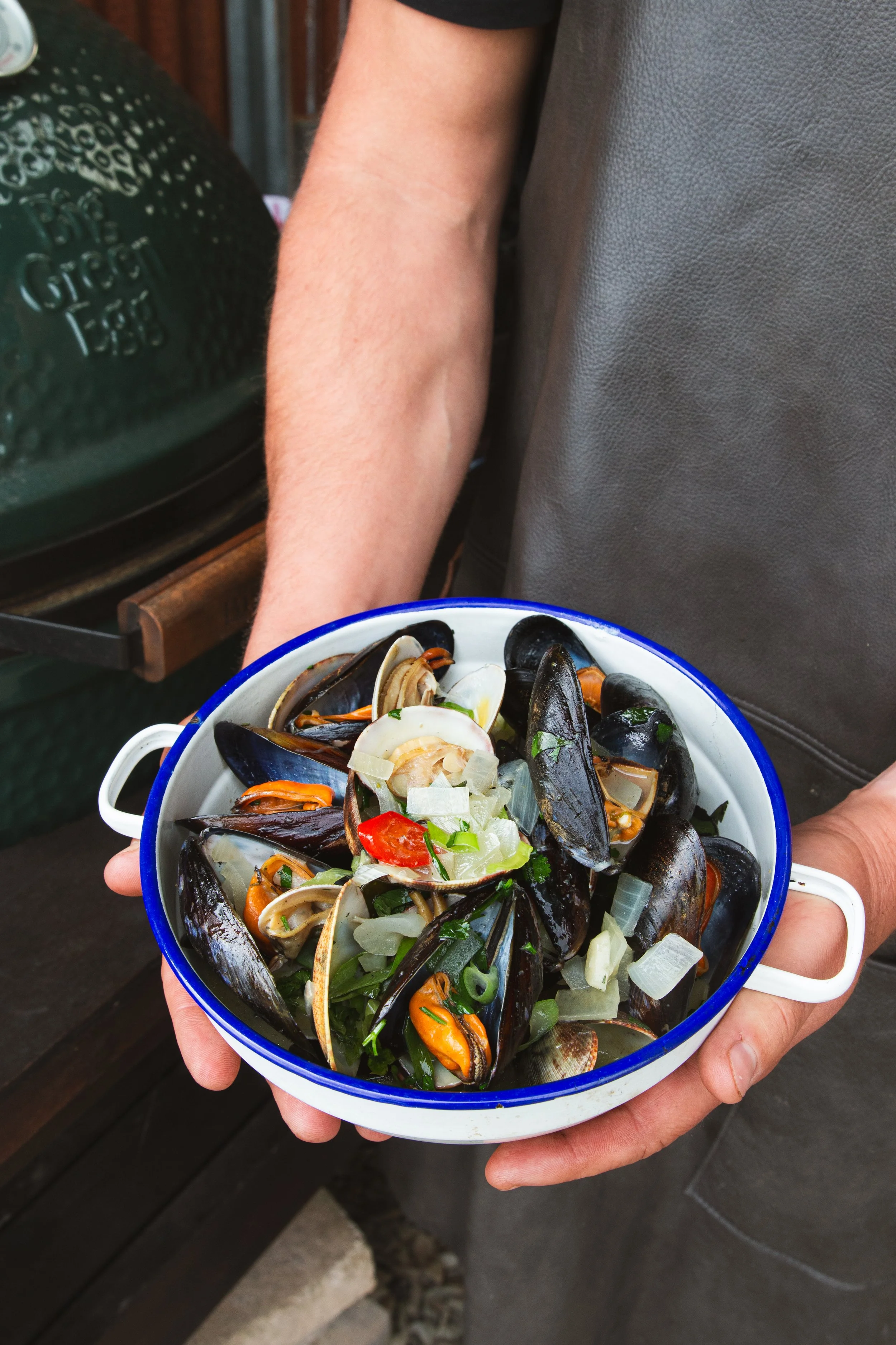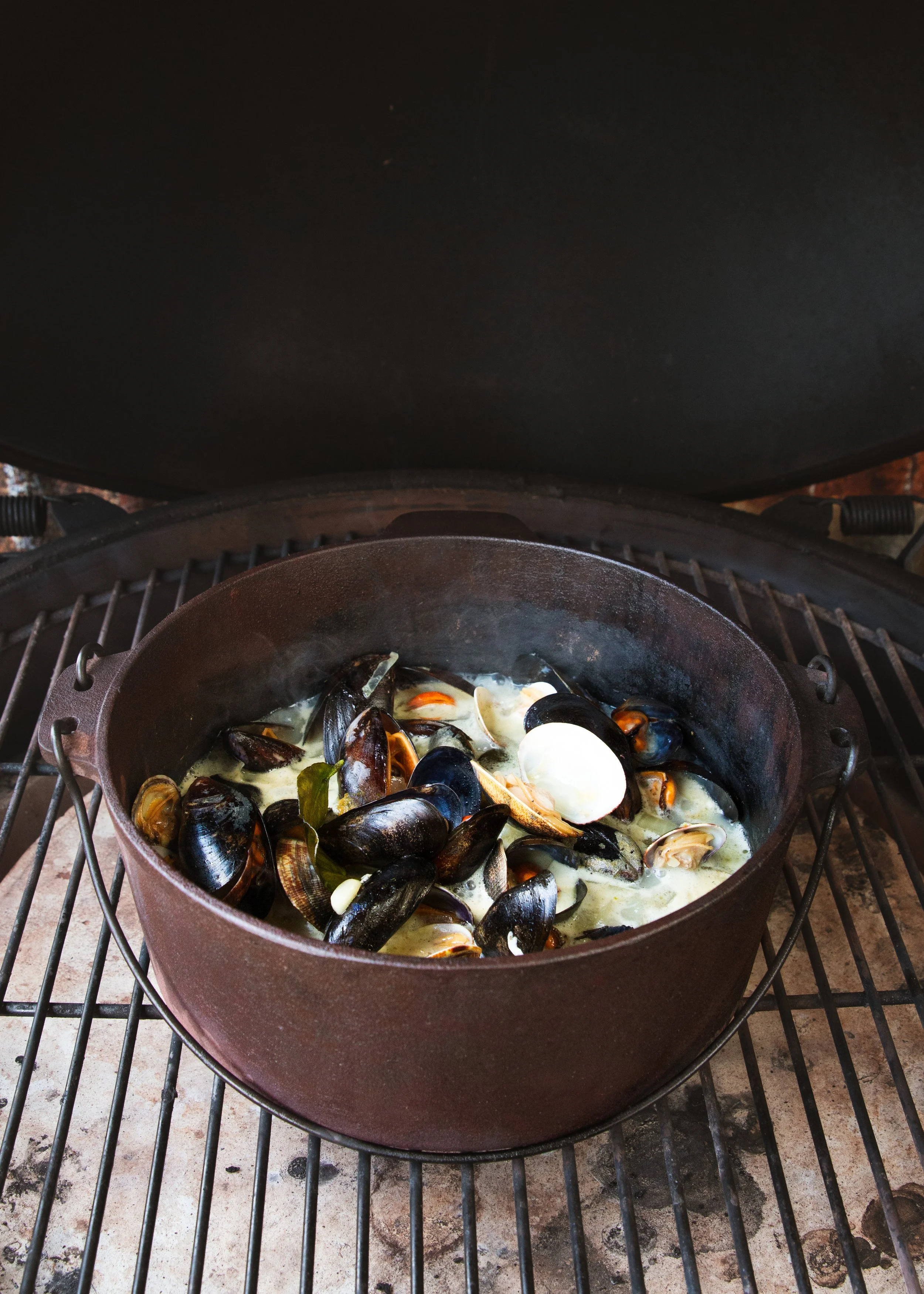 A cast iron skillet on outdoor grill with steamed mussels and white sauce.