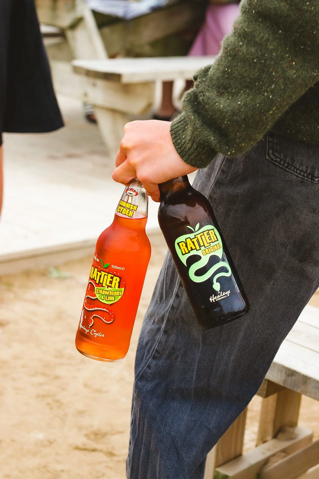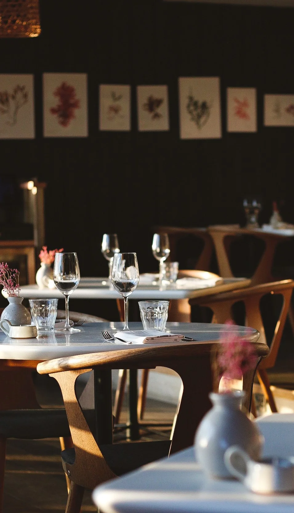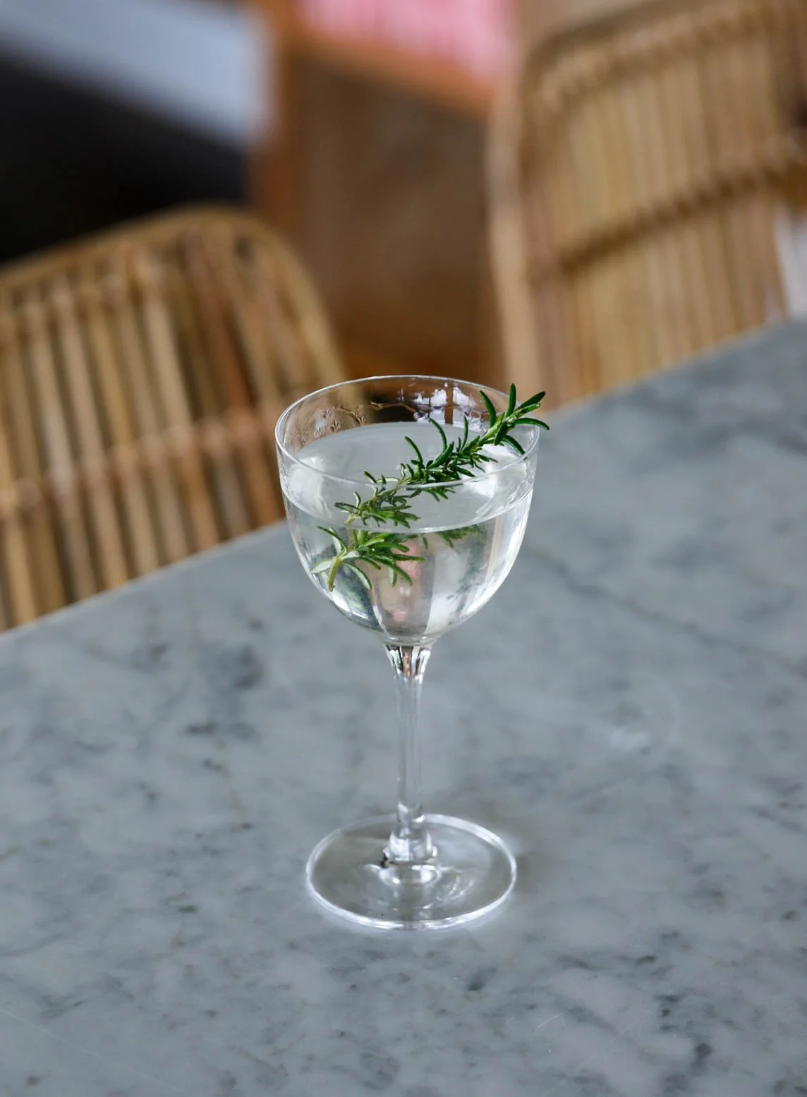 A glass of rosé wine next to a bottle of rosé wine on a table with a brick wall background, at prawn on the lawn in padstow.
