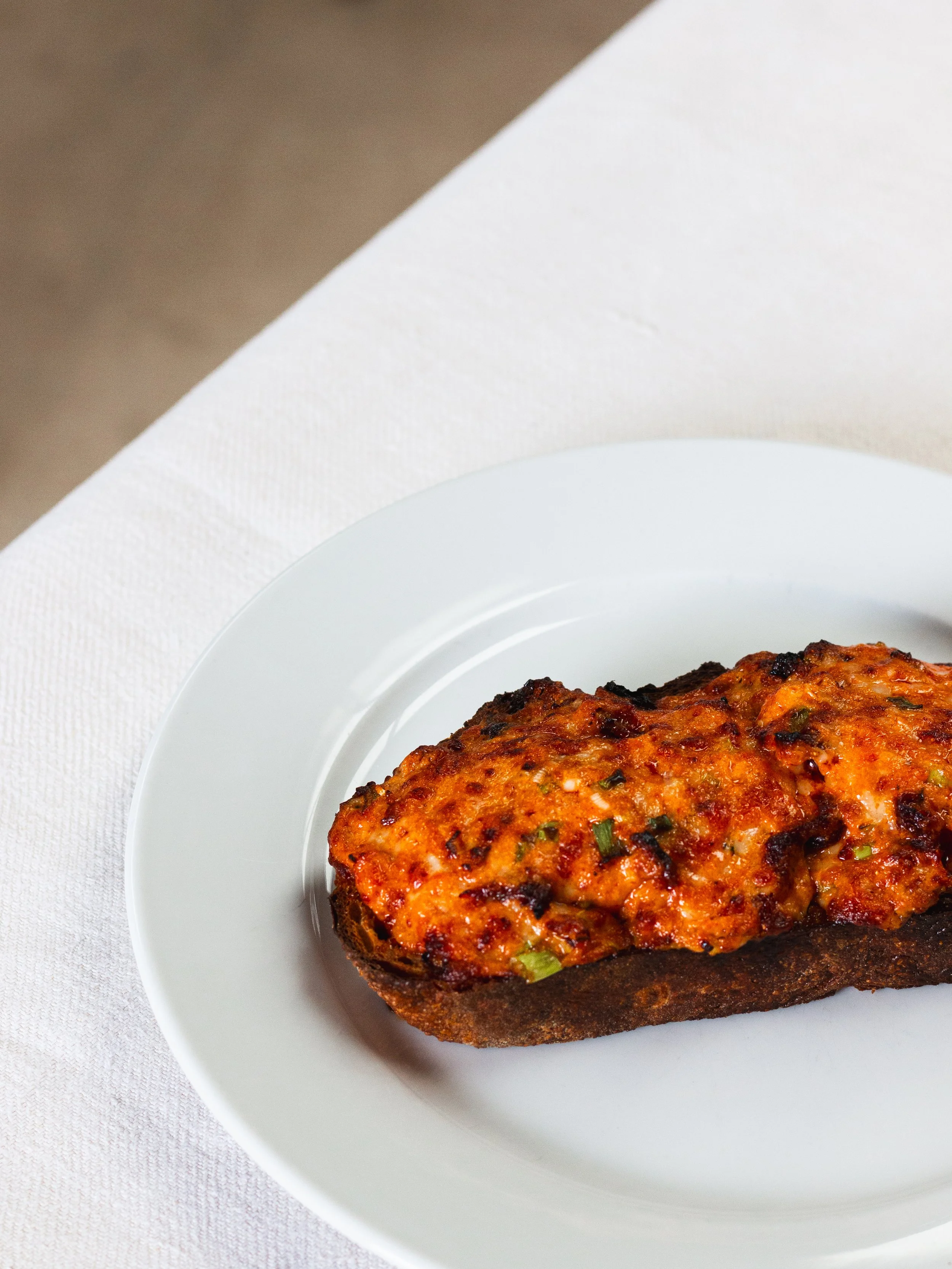 A piece of baked Italian bread topped with spicy marinara sauce and melted cheese on a white plate.