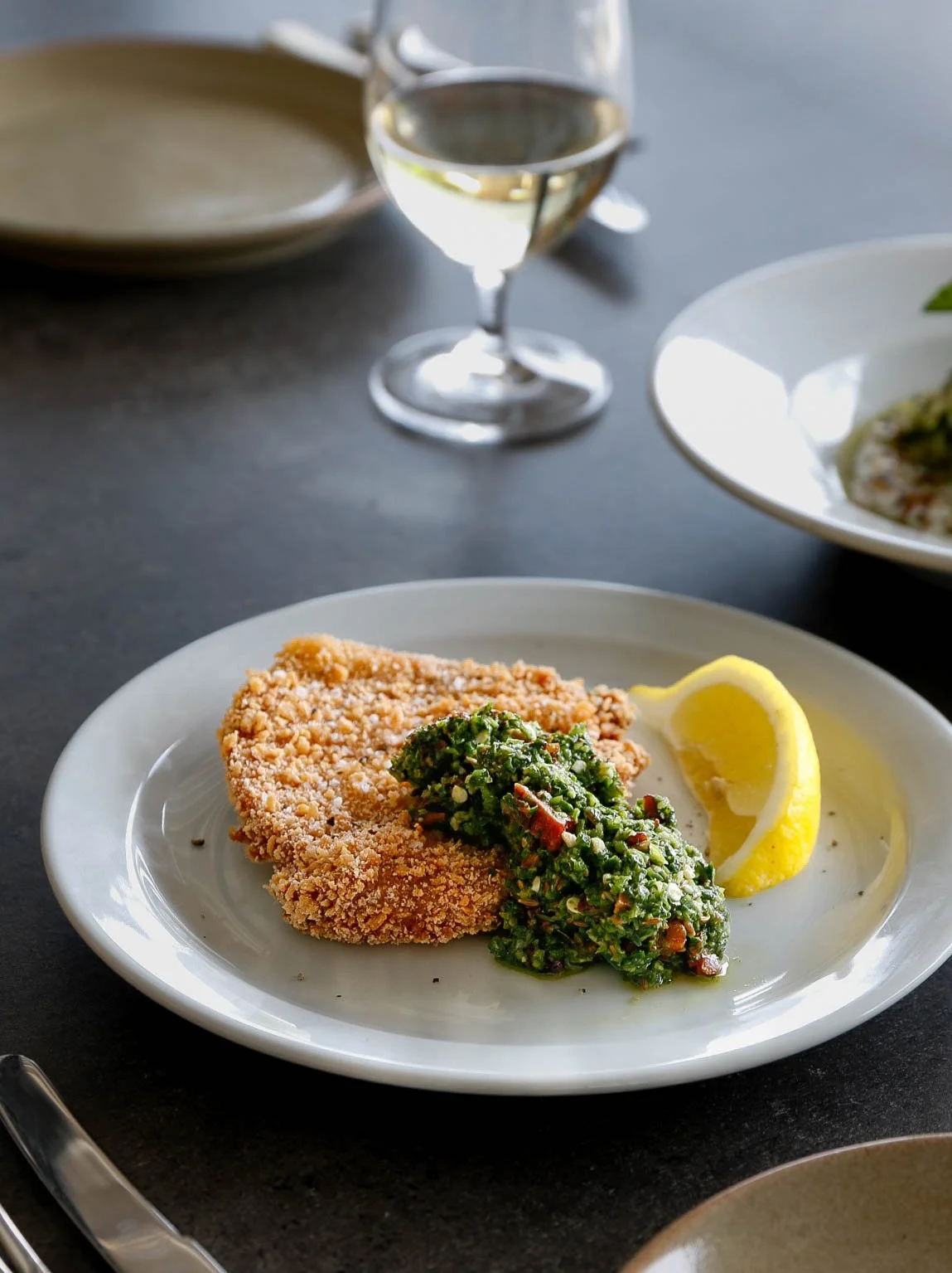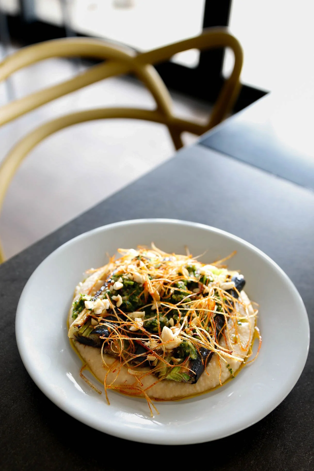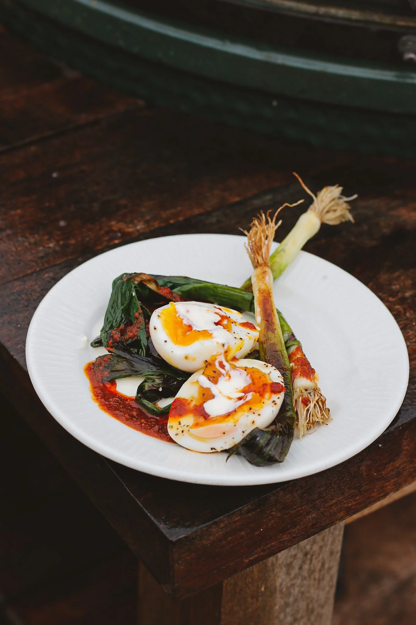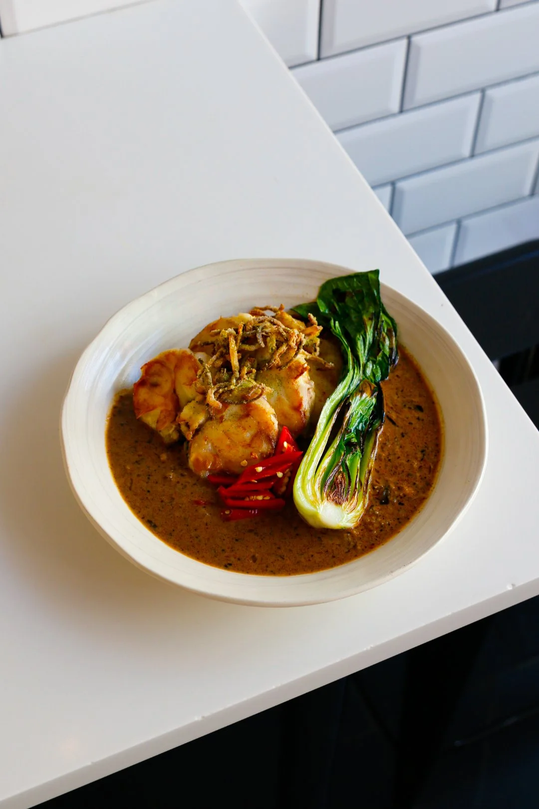 A bowl of Thai green curry with chicken, topped with crispy shallots, along with a grilled leek and red chili peppers, on a white table near a tiled wall, at prawn on the lawn in padstow