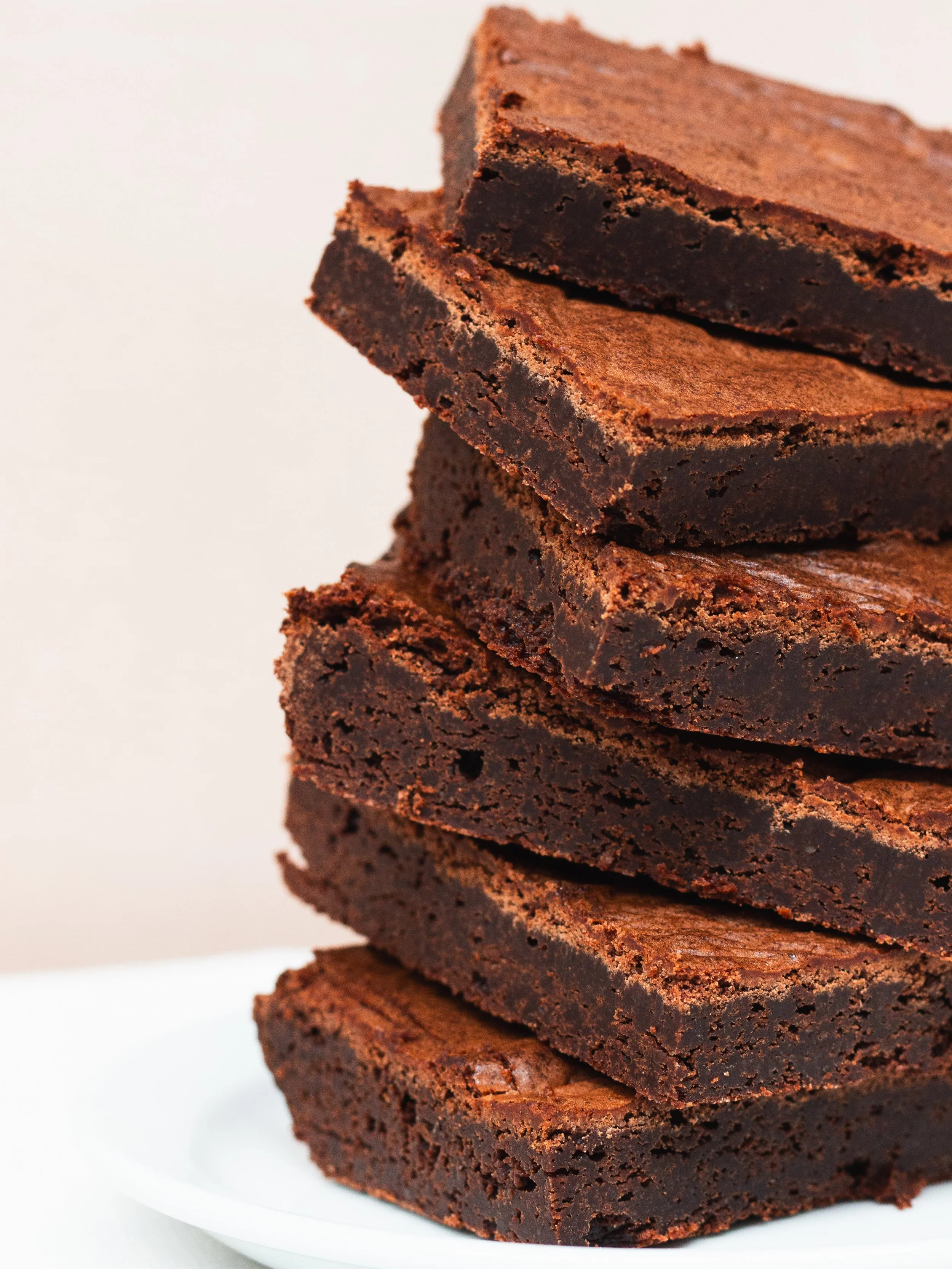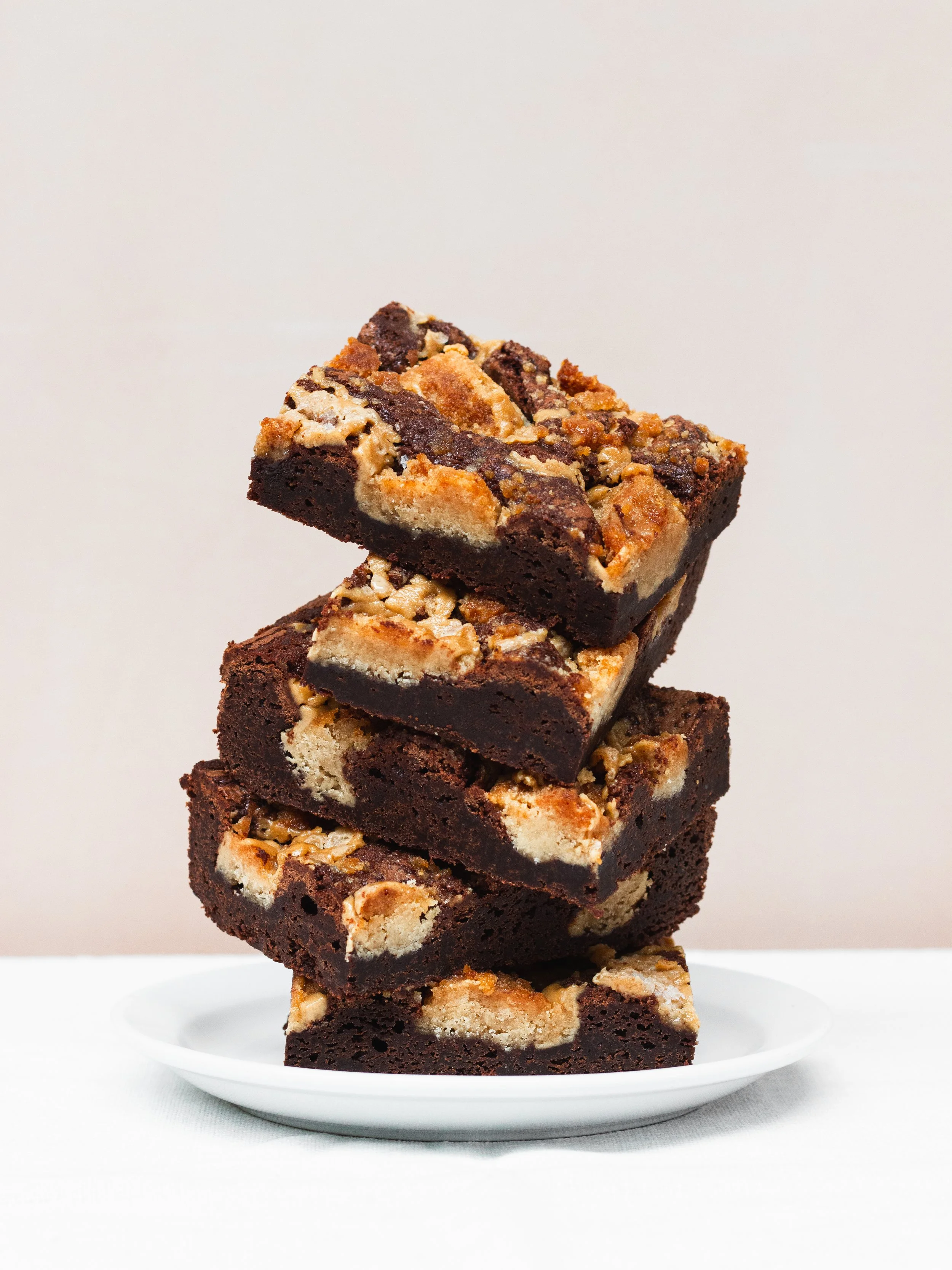 Stack of four chocolate brownies with caramel and nuts on a white plate against a light background.