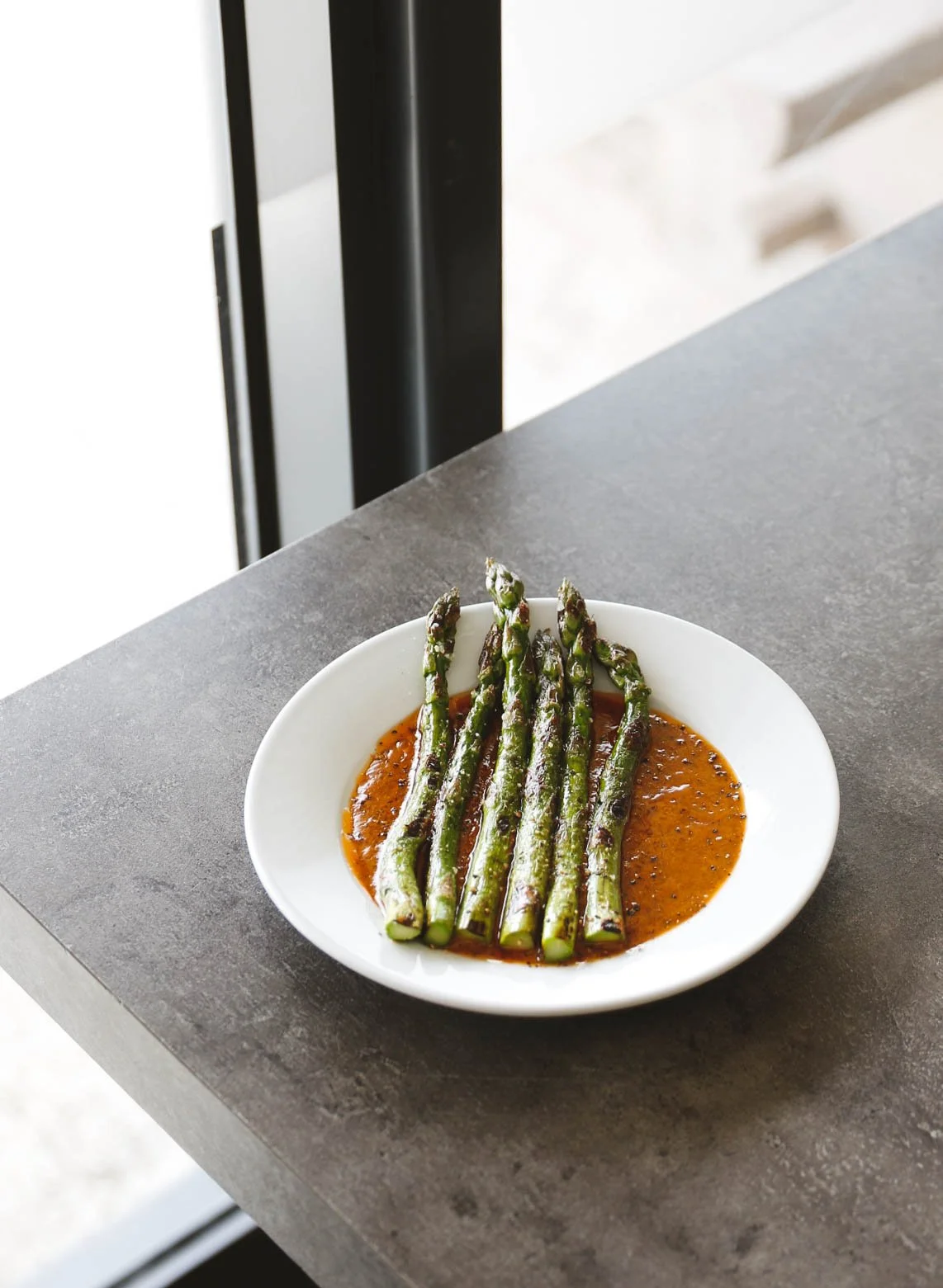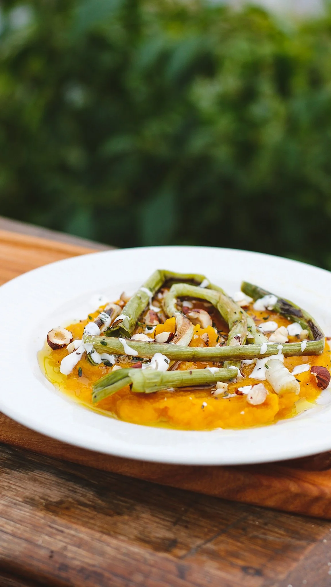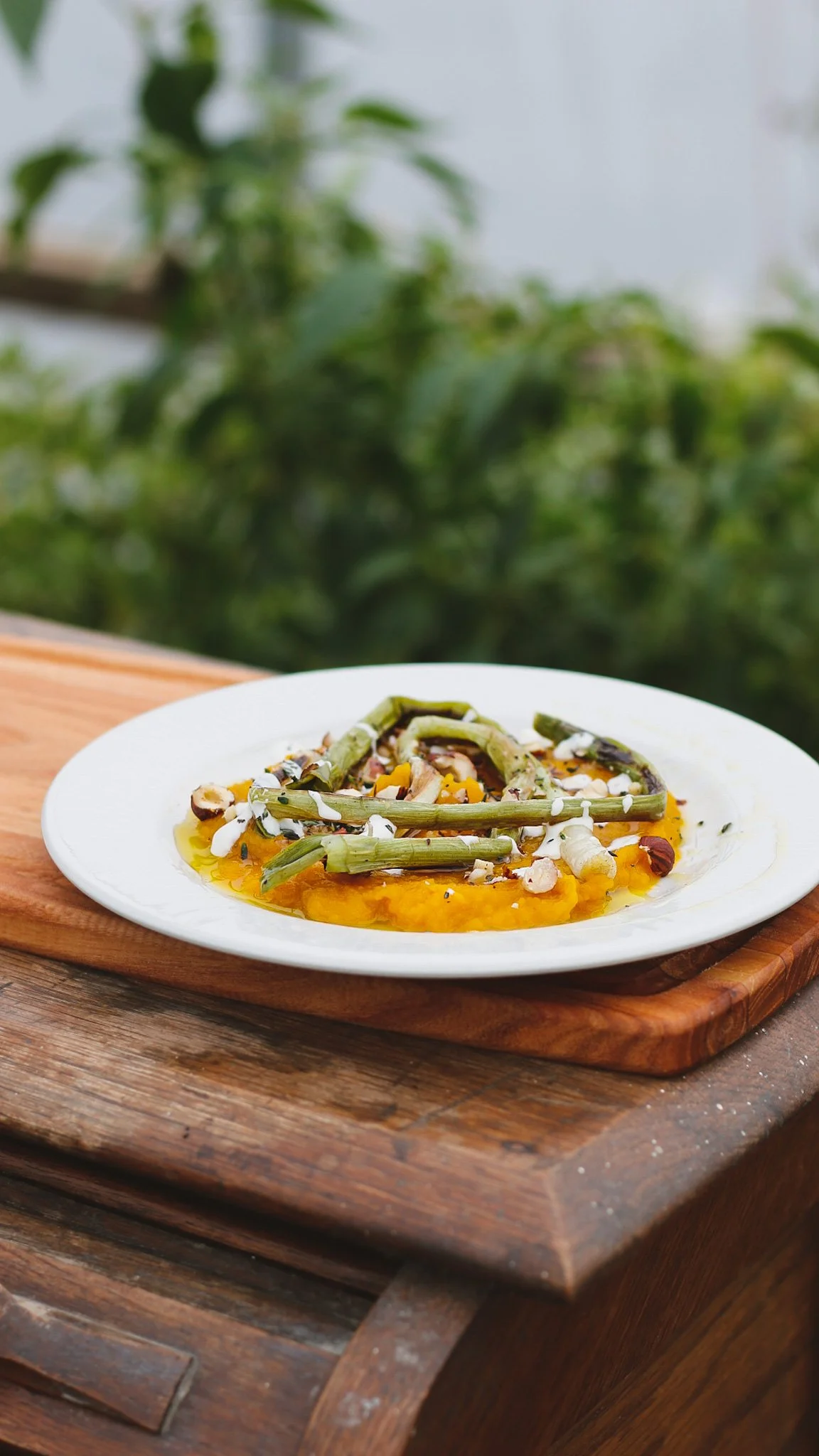 A white plate with roasted asparagus on top of a bed of yellow sauce or puree, garnished with chopped nuts and drizzled with white sauce, set on a wooden cutting board with a blurred green foliage background. View fullsize
