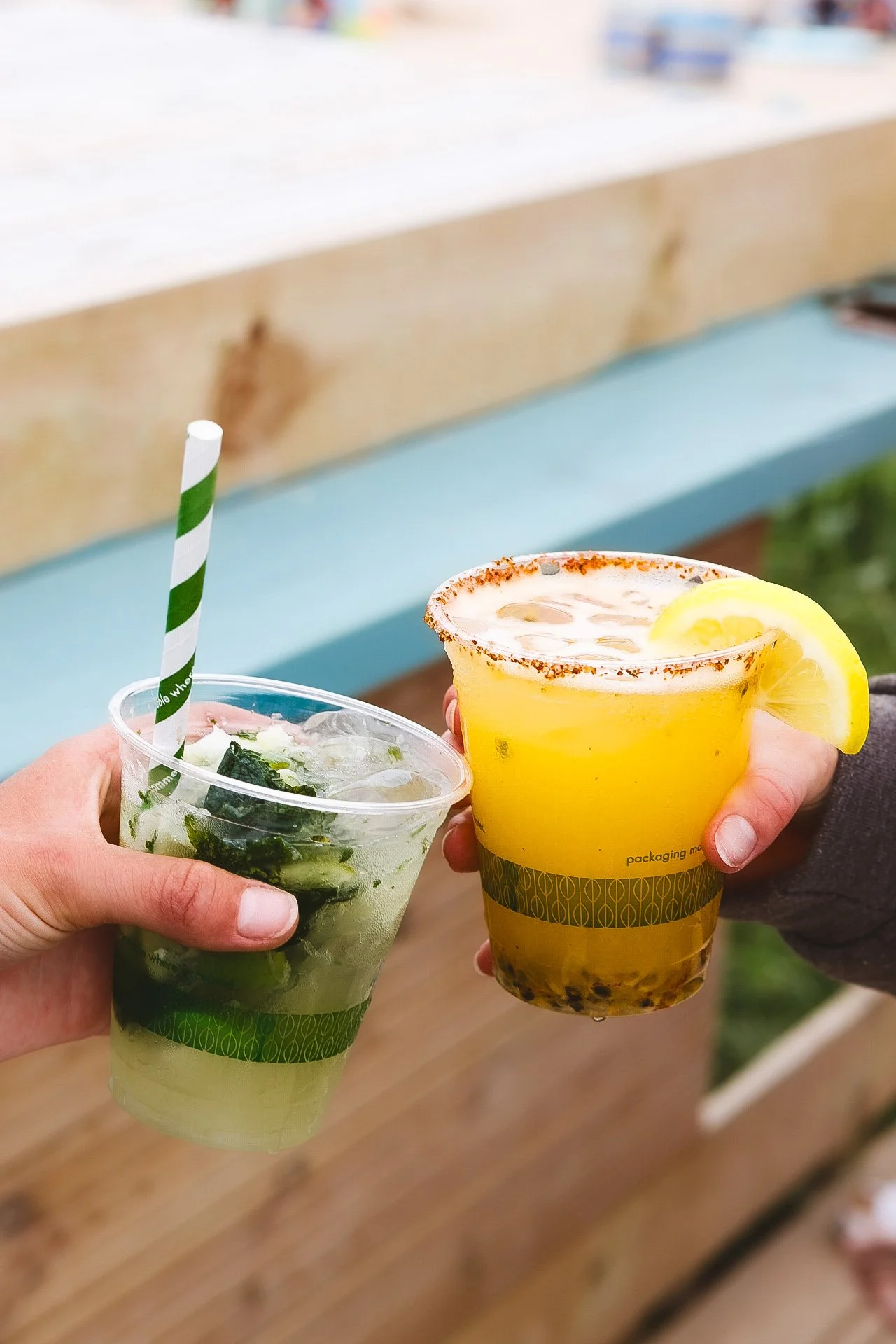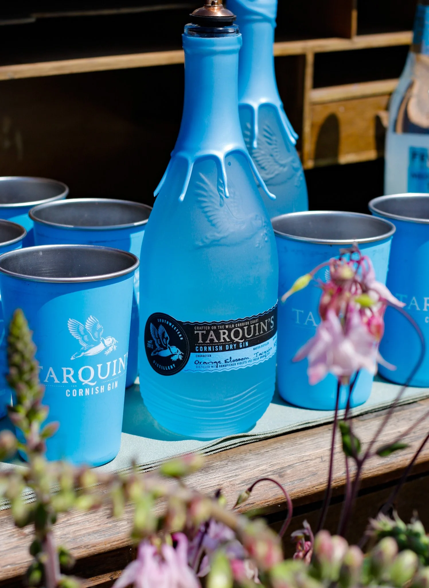 A bottle and cup of Tarquin's Cornish Gin on a wooden table, with the cup filled with ice and a slice of grapefruit inside. View fullsize