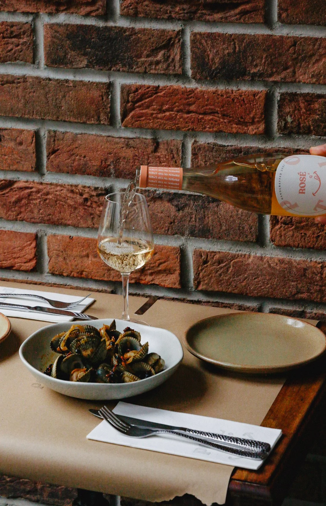 Pouring rosé wine into a glass on a table set with a bowl of cooked clams, a plate, and cutlery, against a brick wall background.