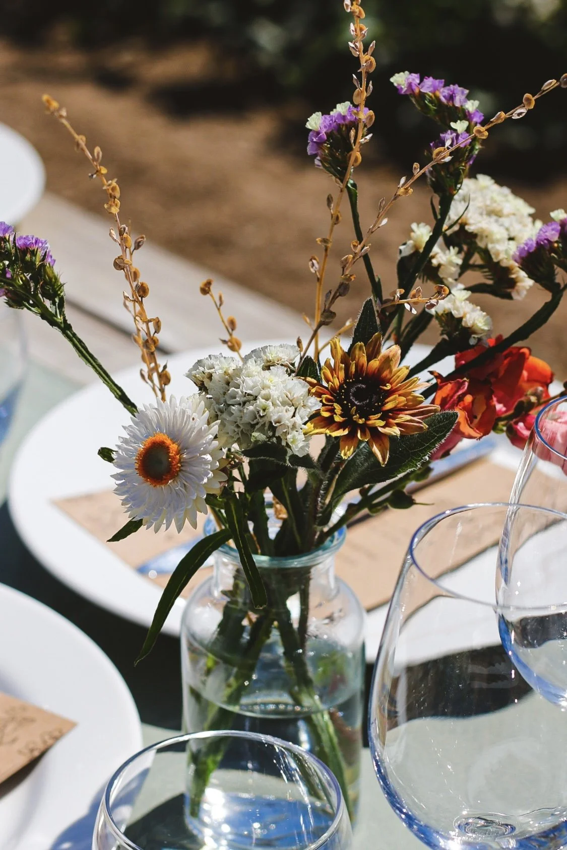 A bouquet of colorful flowers, including daisies and sunflowers, in a glass vase on a table set with plates and glassware. View fullsize