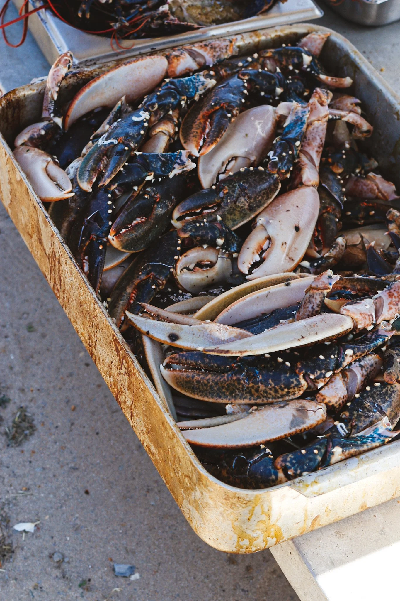 Two live lobsters placed on a metal tray near a green Big Green Egg grill with a wooden handle.