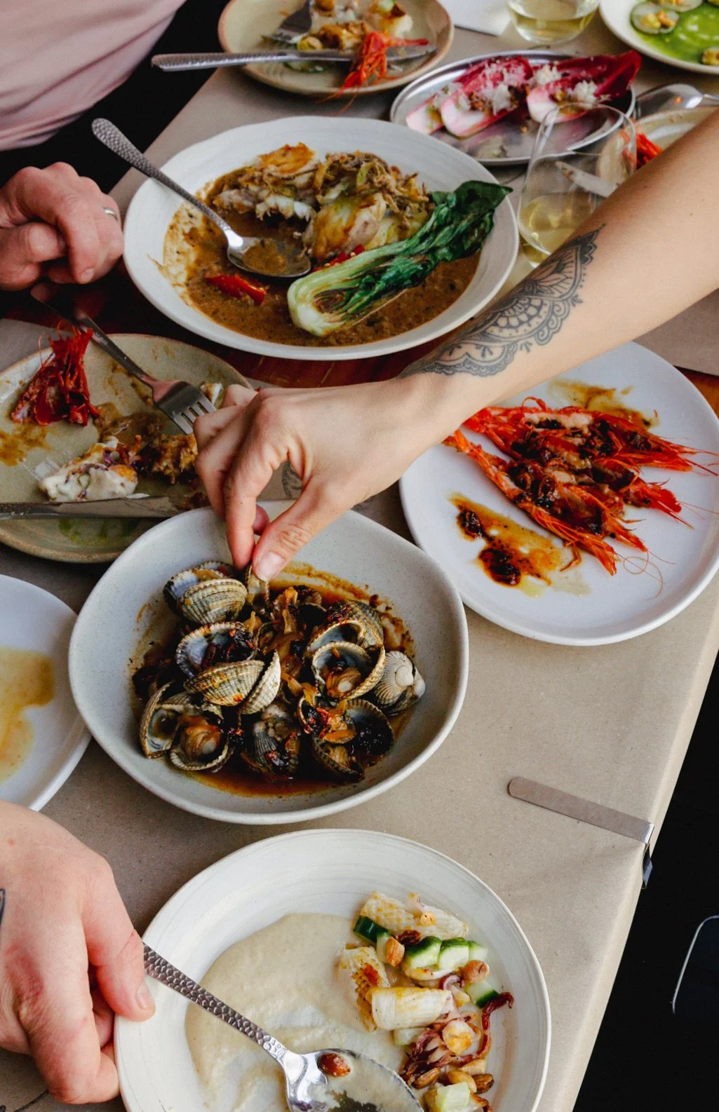 A table filled with various seafood dishes, including clams, shrimp, and fish, with people serving themselves and a glass of white wine.