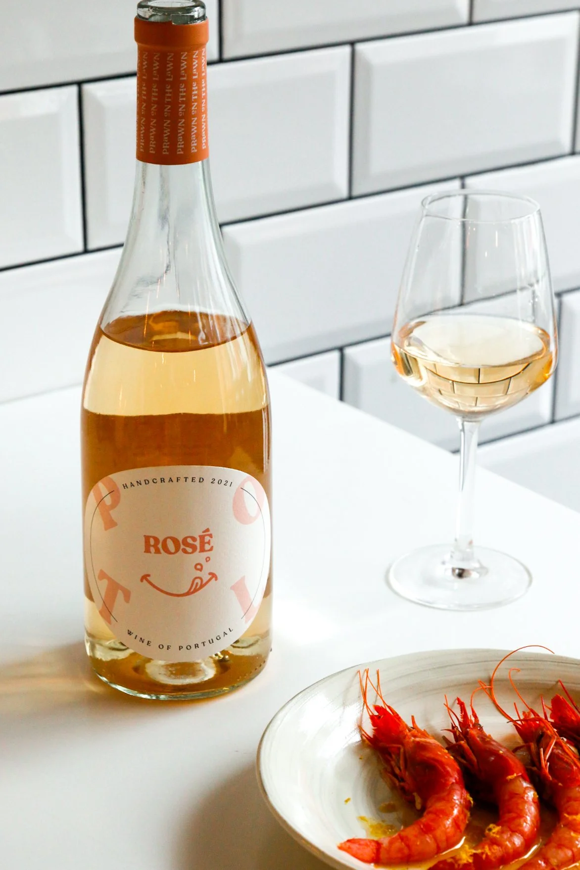 A bottle of rosé wine and a glass of rosé wine on a white surface, with a plate of cooked shrimp in the foreground and a white tiled wall in the background.