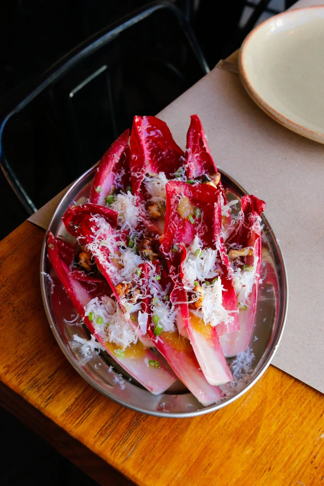 A metal bowl of sliced radishes topped with shredded cheese, chopped green onions, and sauce on a wooden table with a beige paper placemat.