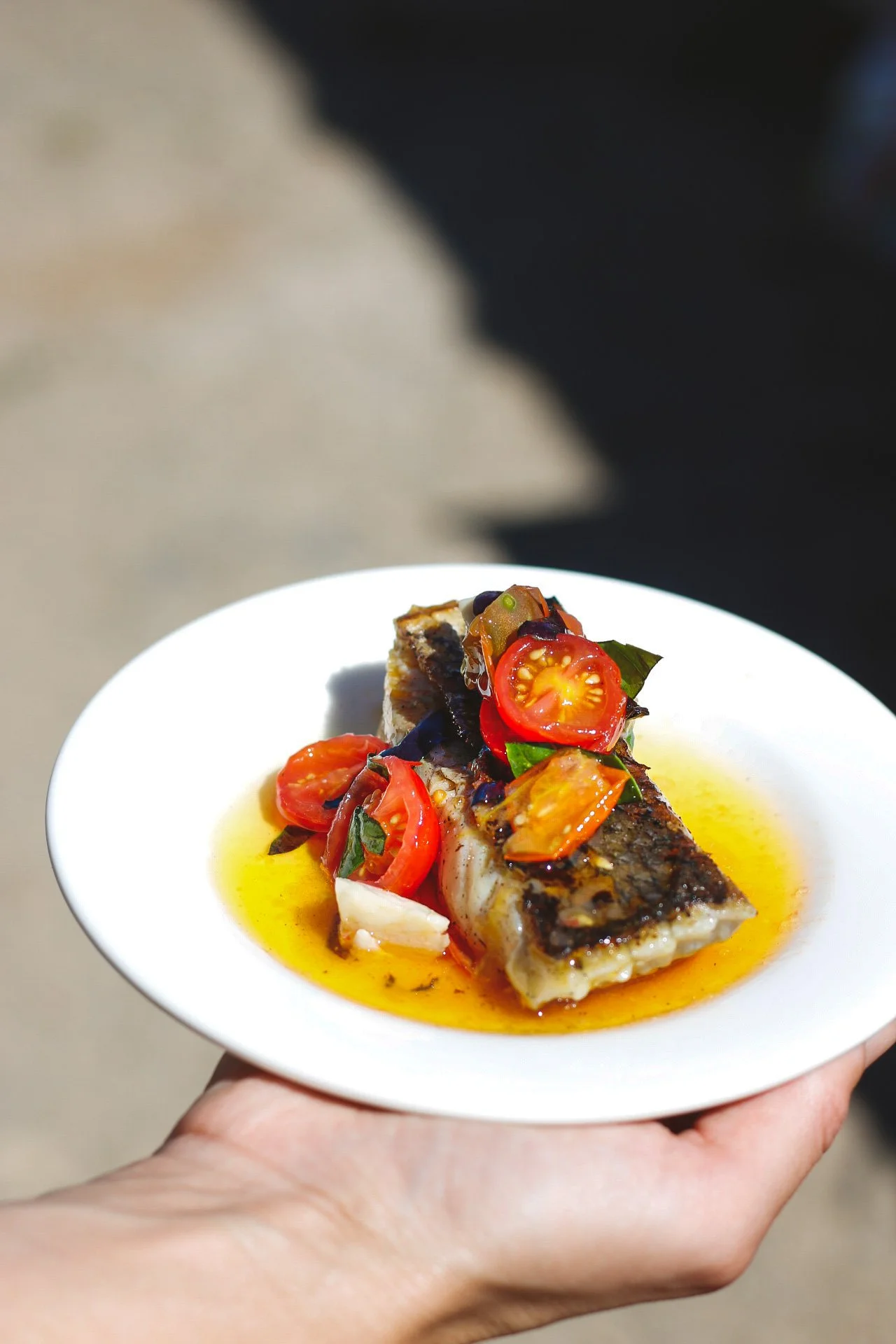 A hand holding a white plate with a cooked fish fillet topped with chopped cherry tomatoes, basil, and grilled vegetables, drizzled with olive oil.