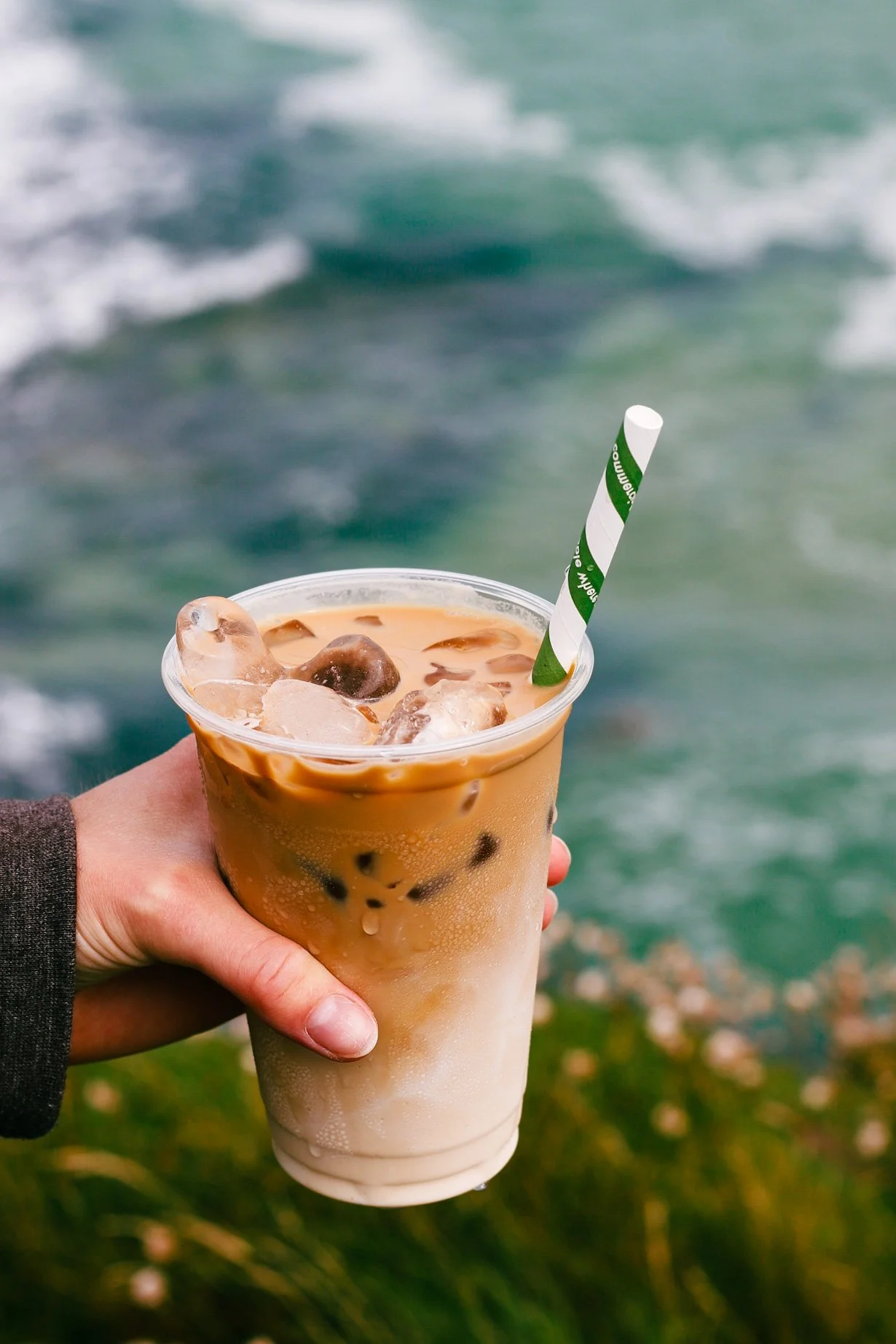 A dessert served on a white plate with caramel popcorn and crushed cookies, alongside a glass of amber-colored beverage, on a table with a brown paper covering.
