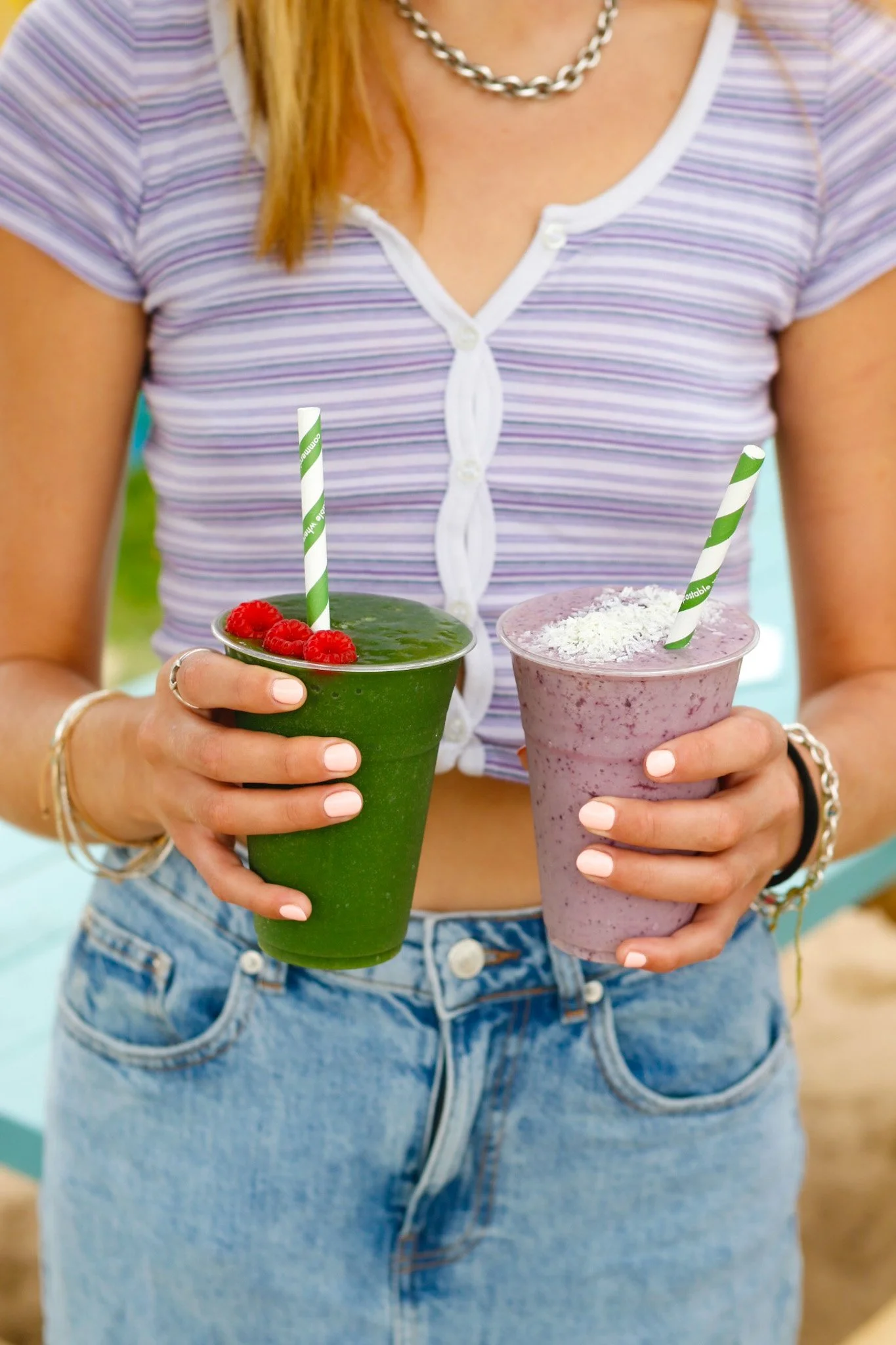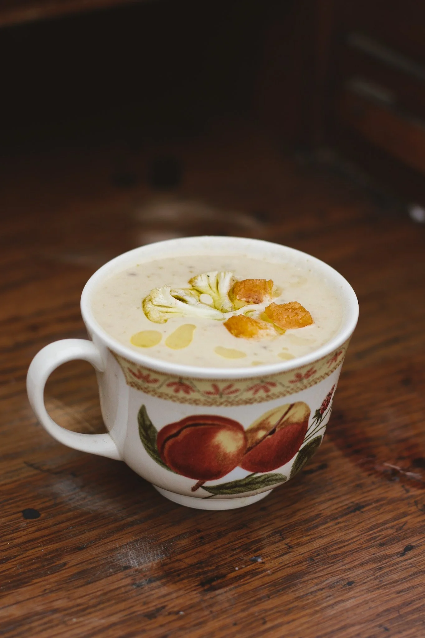 A ceramic mug with a fruit design filled with a light-colored beverage, topped with fruit pieces and a drizzle of honey, on a wooden surface. View fullsize