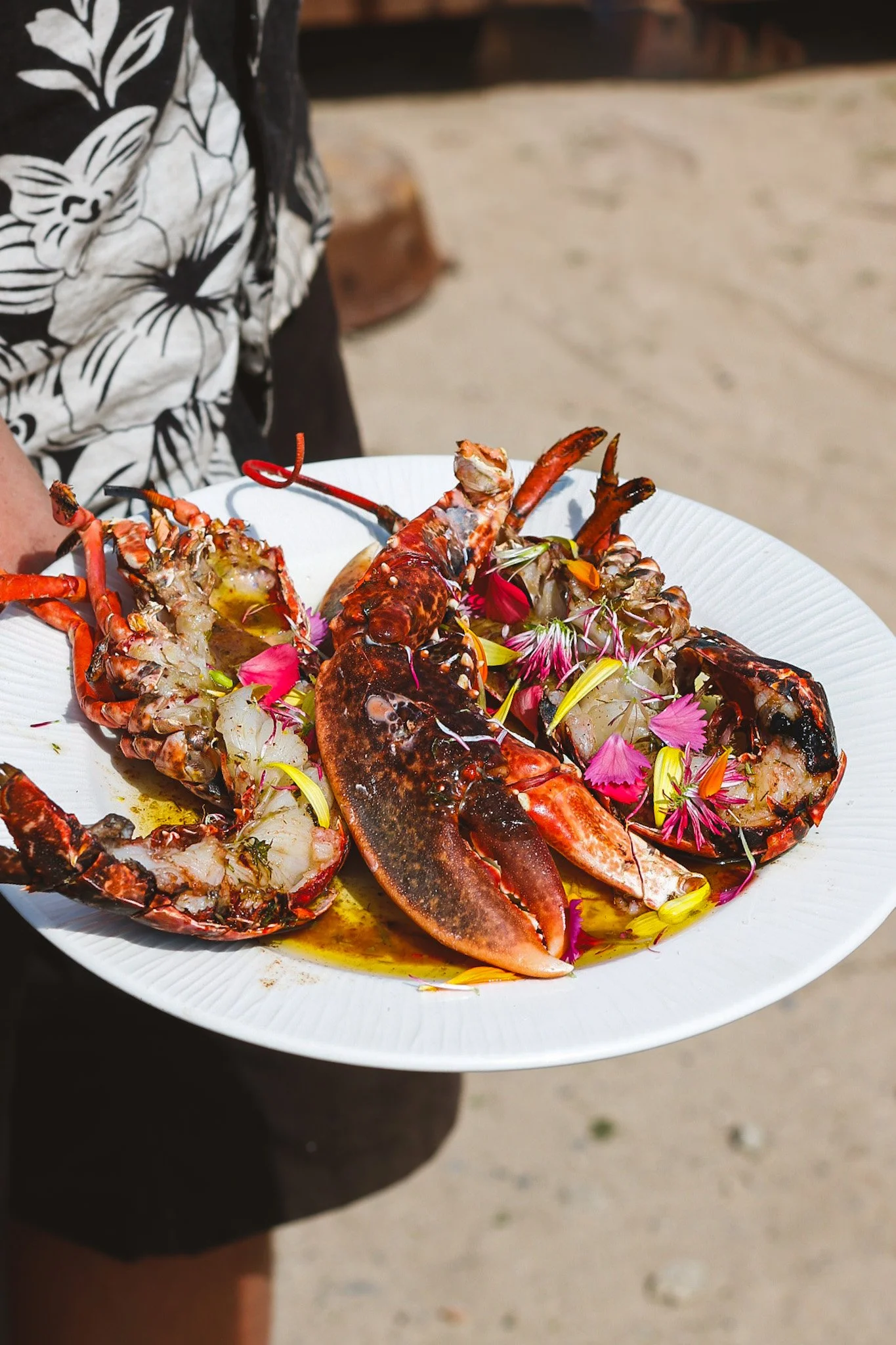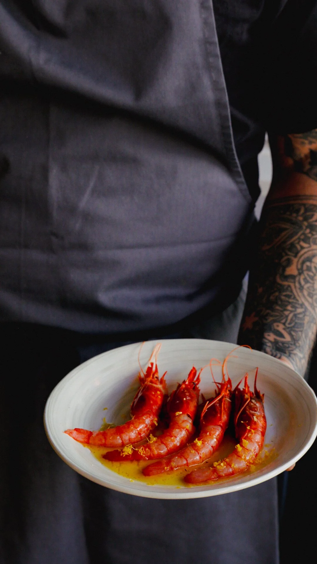 Chef holding a white plate with four cooked prawns at Prawn On The Lawn in padstow