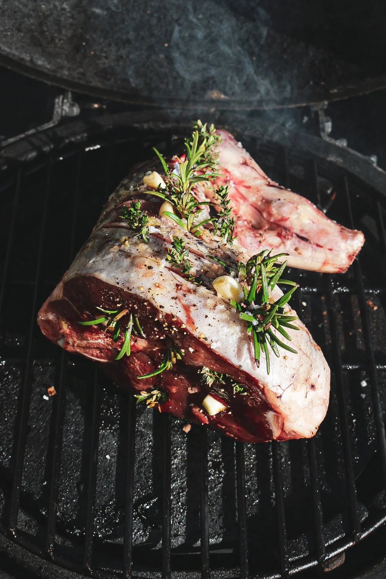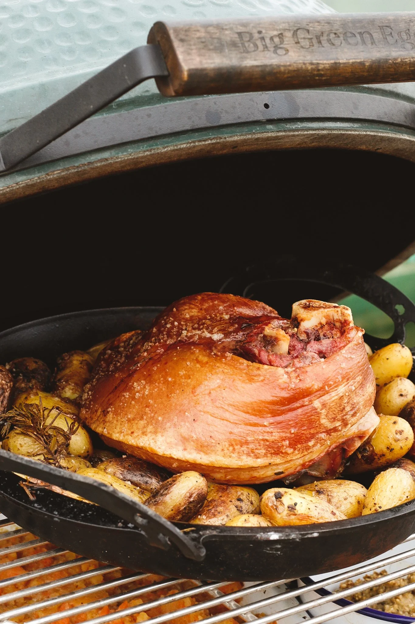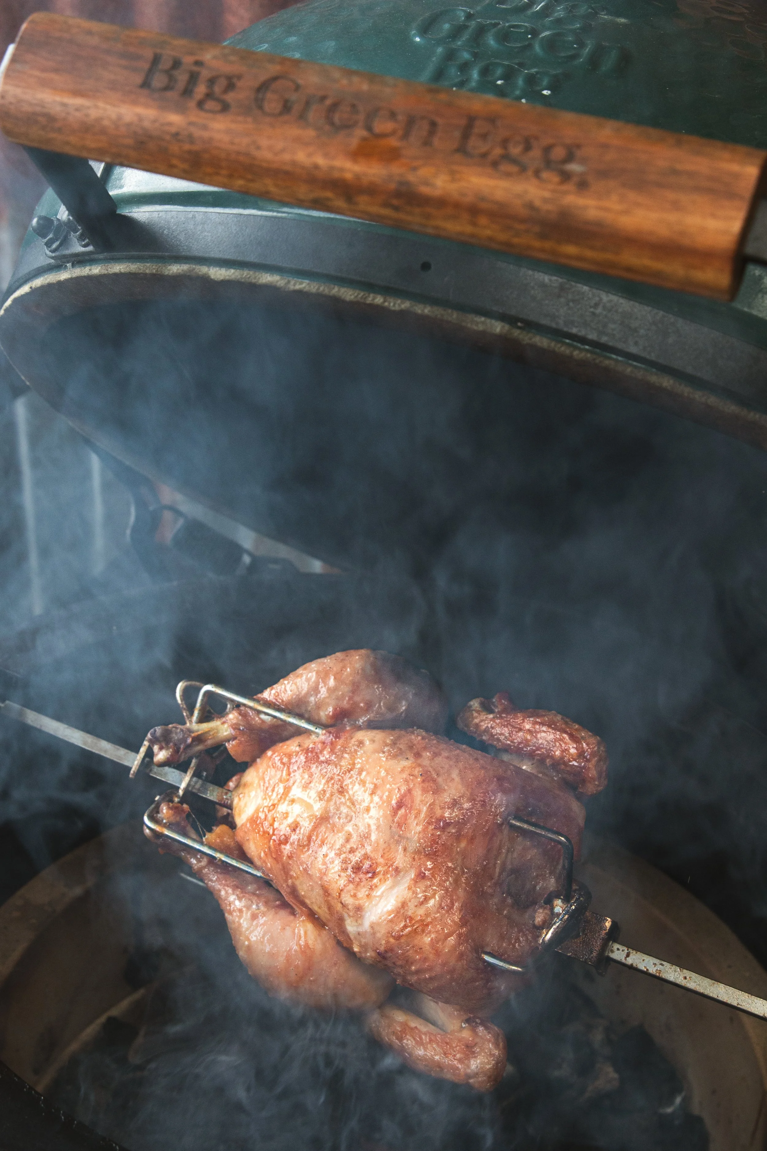 A whole roasted chicken on a rotisserie spit being cooked outdoors, with smoke surrounding it. A wooden sign labeled 'Big Green Egg' is visible above.