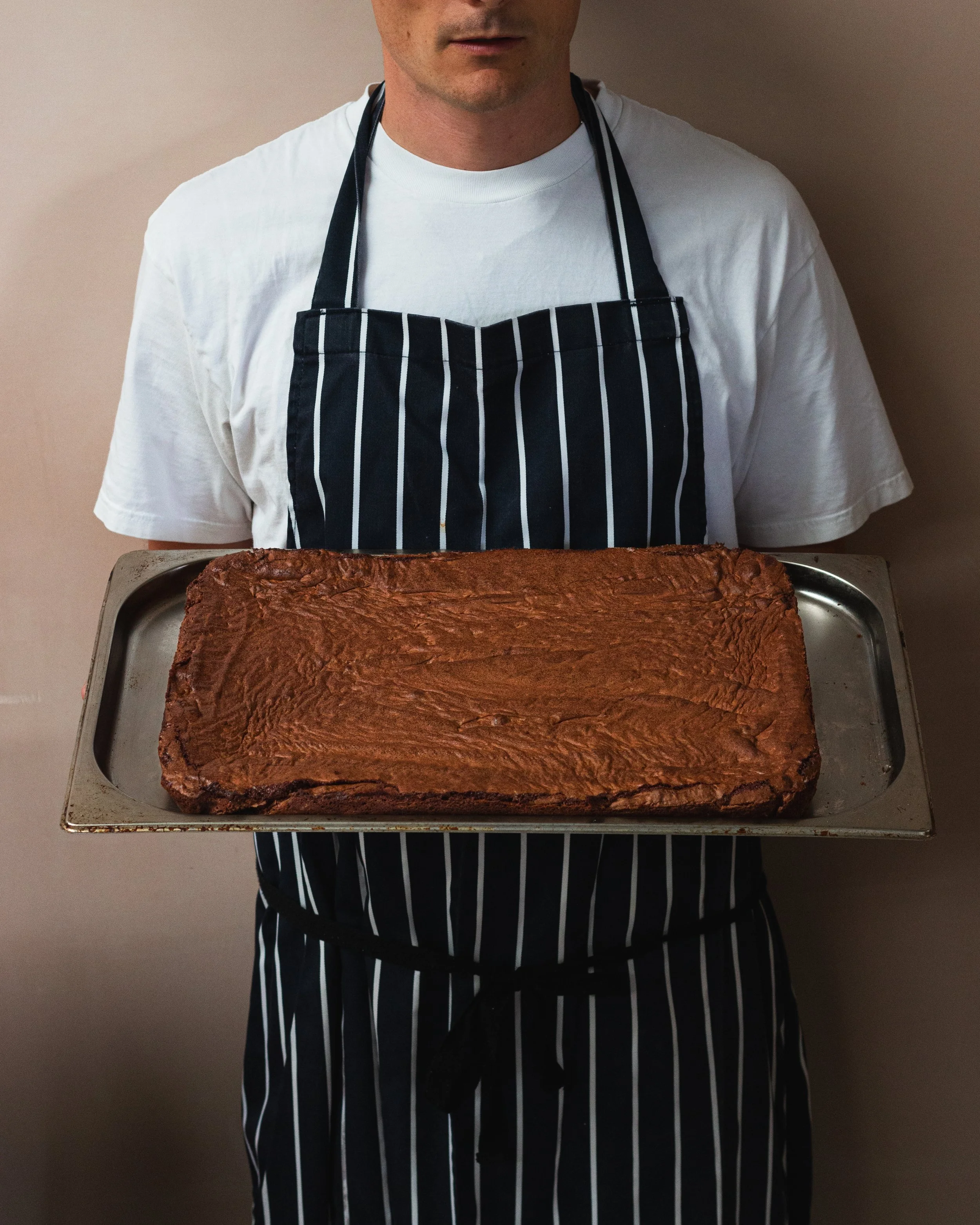 Person wearing a striped apron holding a large tray with a thick block of cooked brisket.
