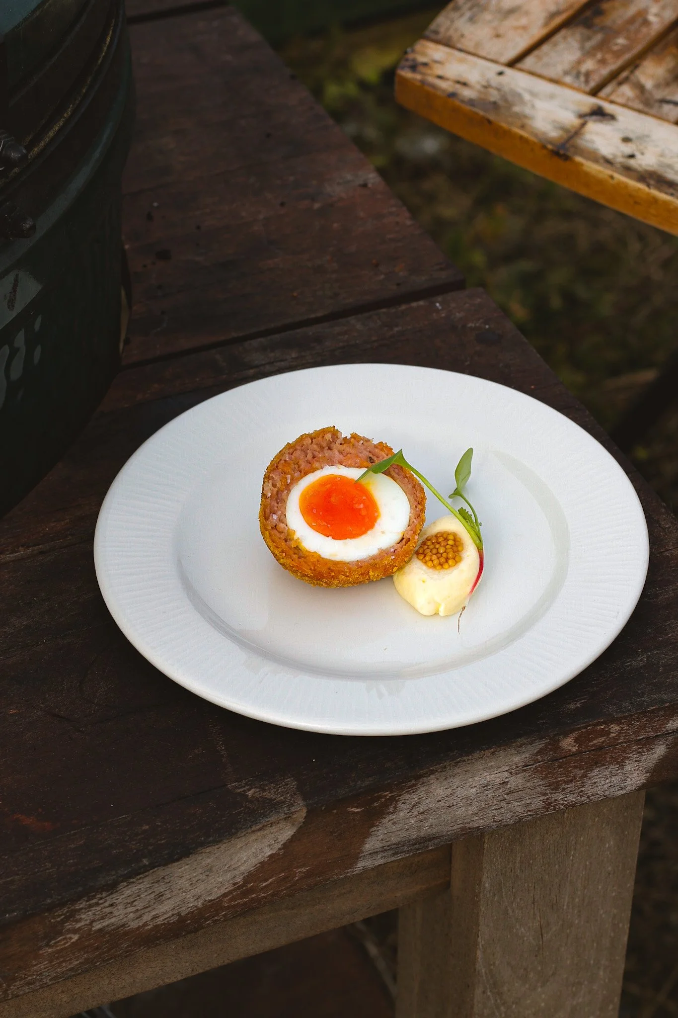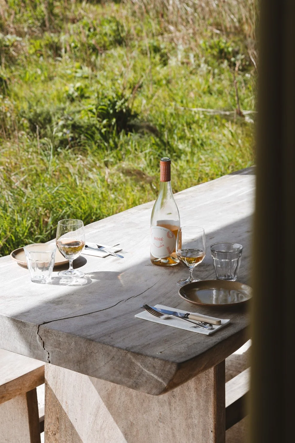 An outdoor dining table at Barnabys, Padstow, set with wine glasses, a bottle of rosé wine, a plate, and cutlery, with a grassy yard in the background.