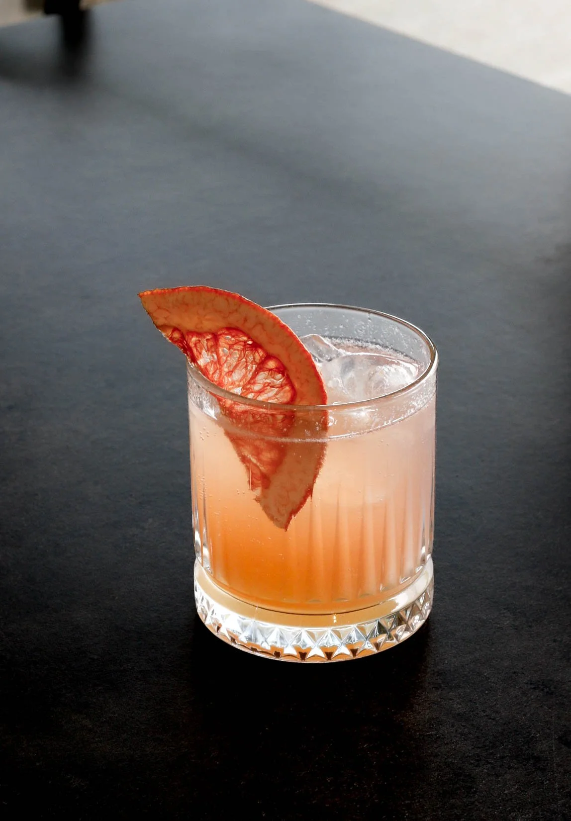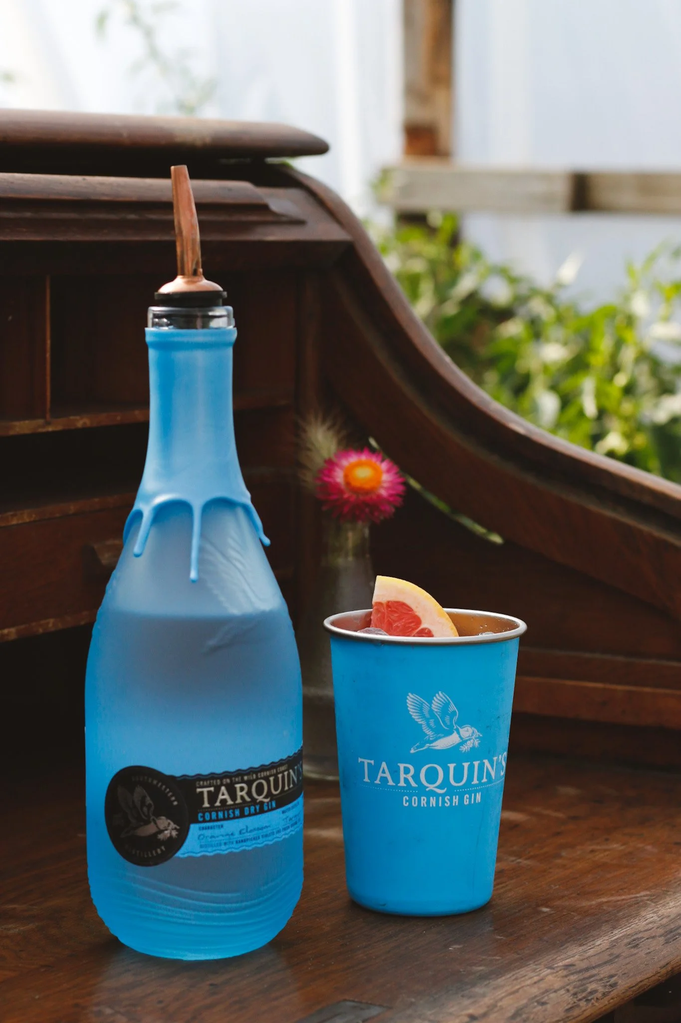 A bottle and cup of Tarquin's Cornish Gin on a wooden table, with the cup filled with ice and a slice of grapefruit inside.