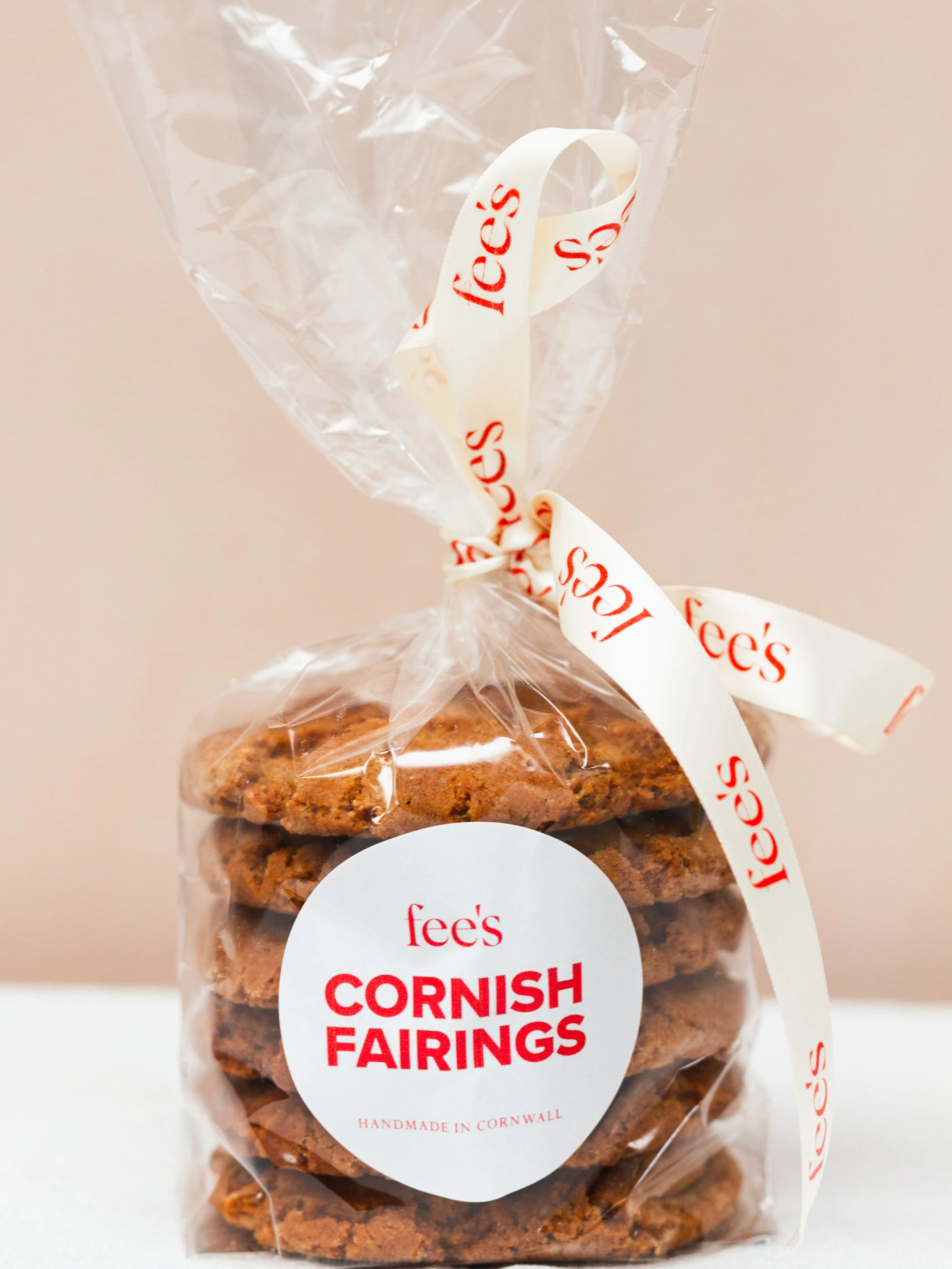Clear plastic bag of Cornish Fairings cookies tied with a white ribbon that has red text reading 'fee's' on it, with a round white label on the front of the bag that says 'fee's CORNISH FAIRINGS HANDMADE IN CORNWALL'.