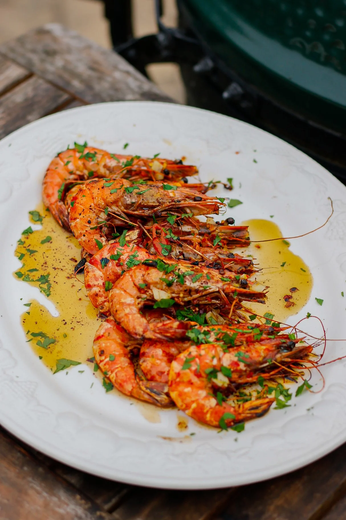 A white plate with cooked shrimp garnished with chopped parsley, topped with olive oil and black pepper, served on a rustic wooden table.